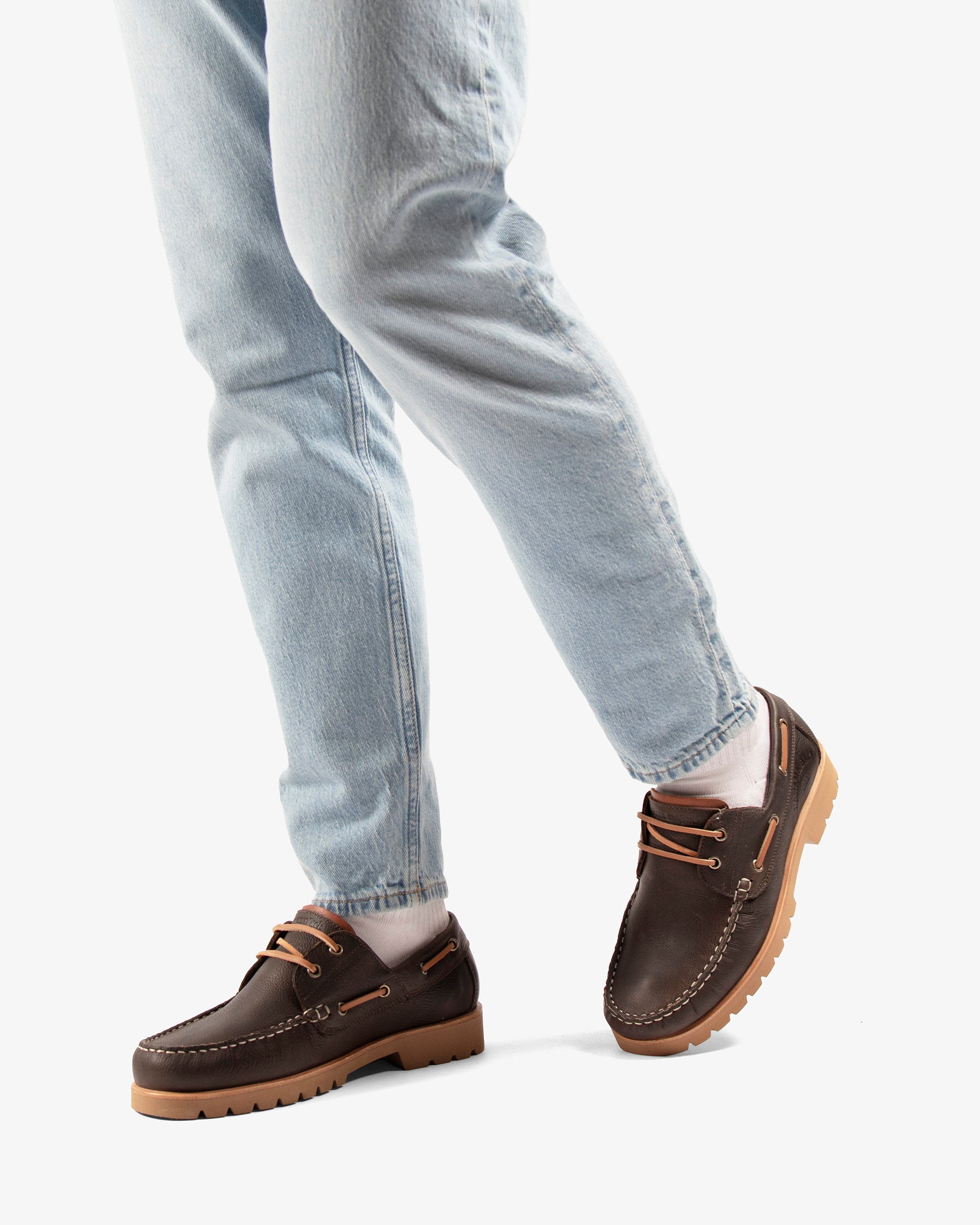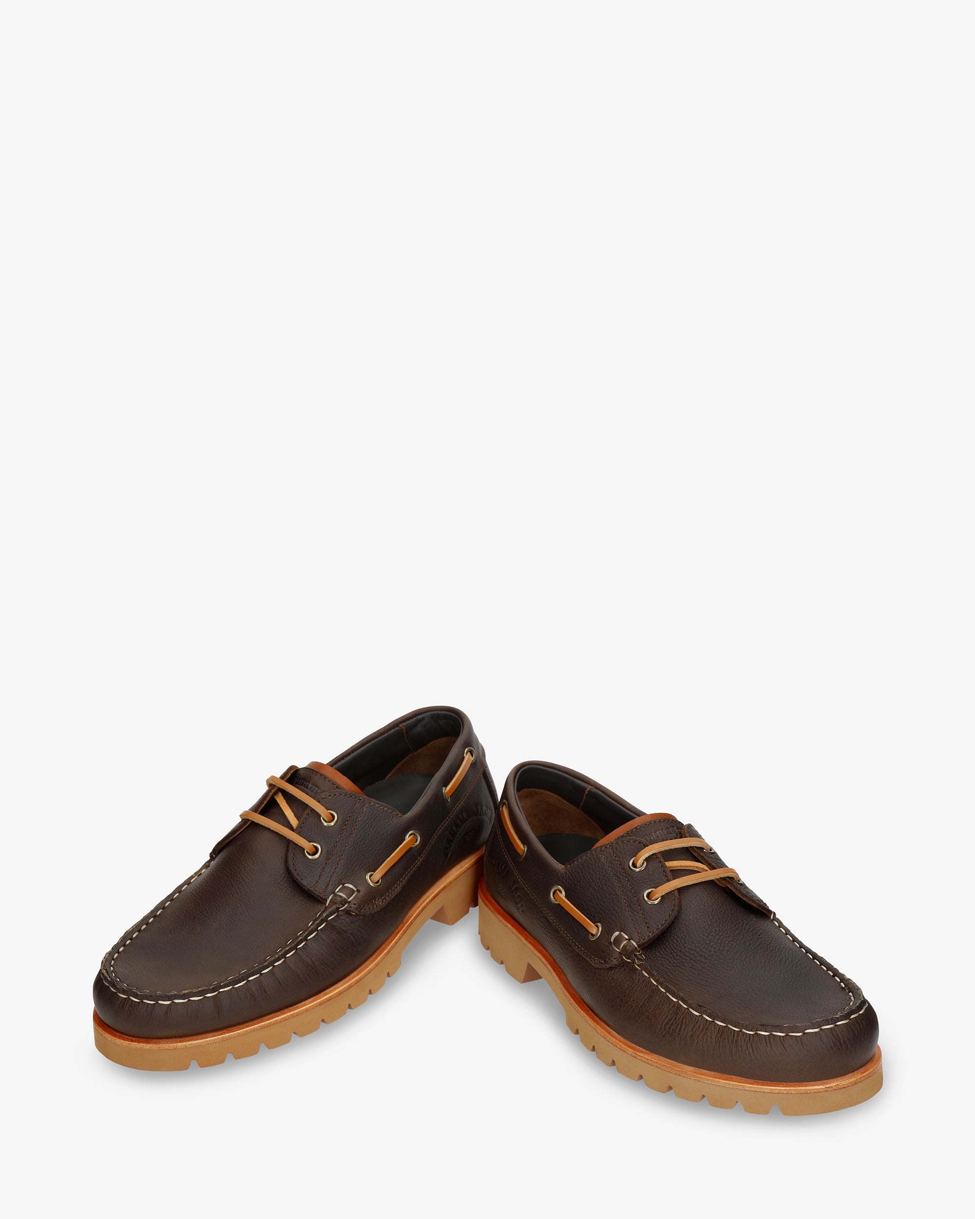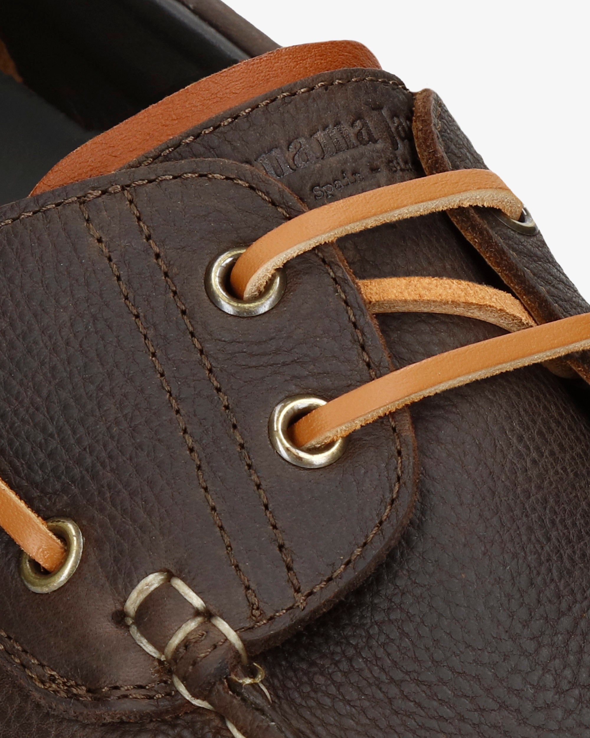 Náutico de hombre. Piel Napa Grass marrón WATERPROOF. Cierre de cordones. Forro interior de Piel. Plantilla anatómica extraíble. Suela de EVA, ligero, flexible y resistente. Altura tacón: 4 cm. 100% Hecho en España.