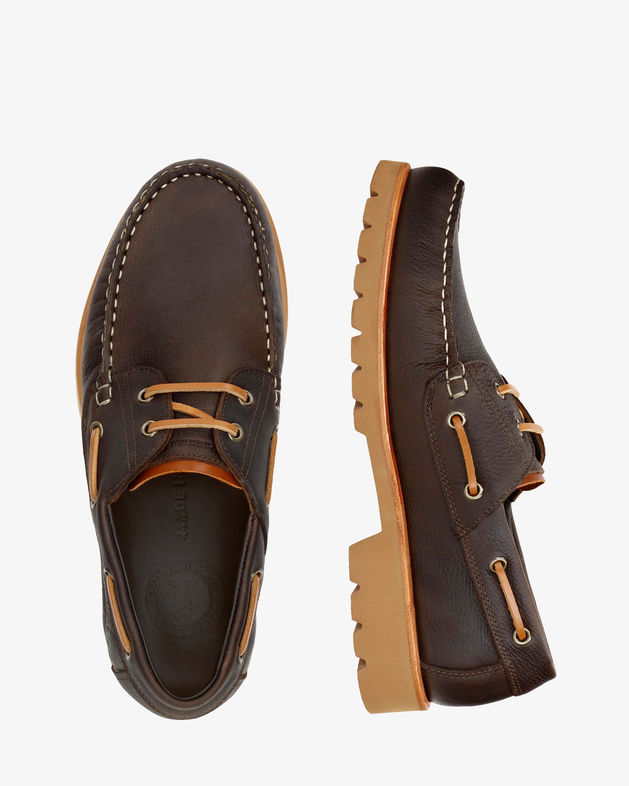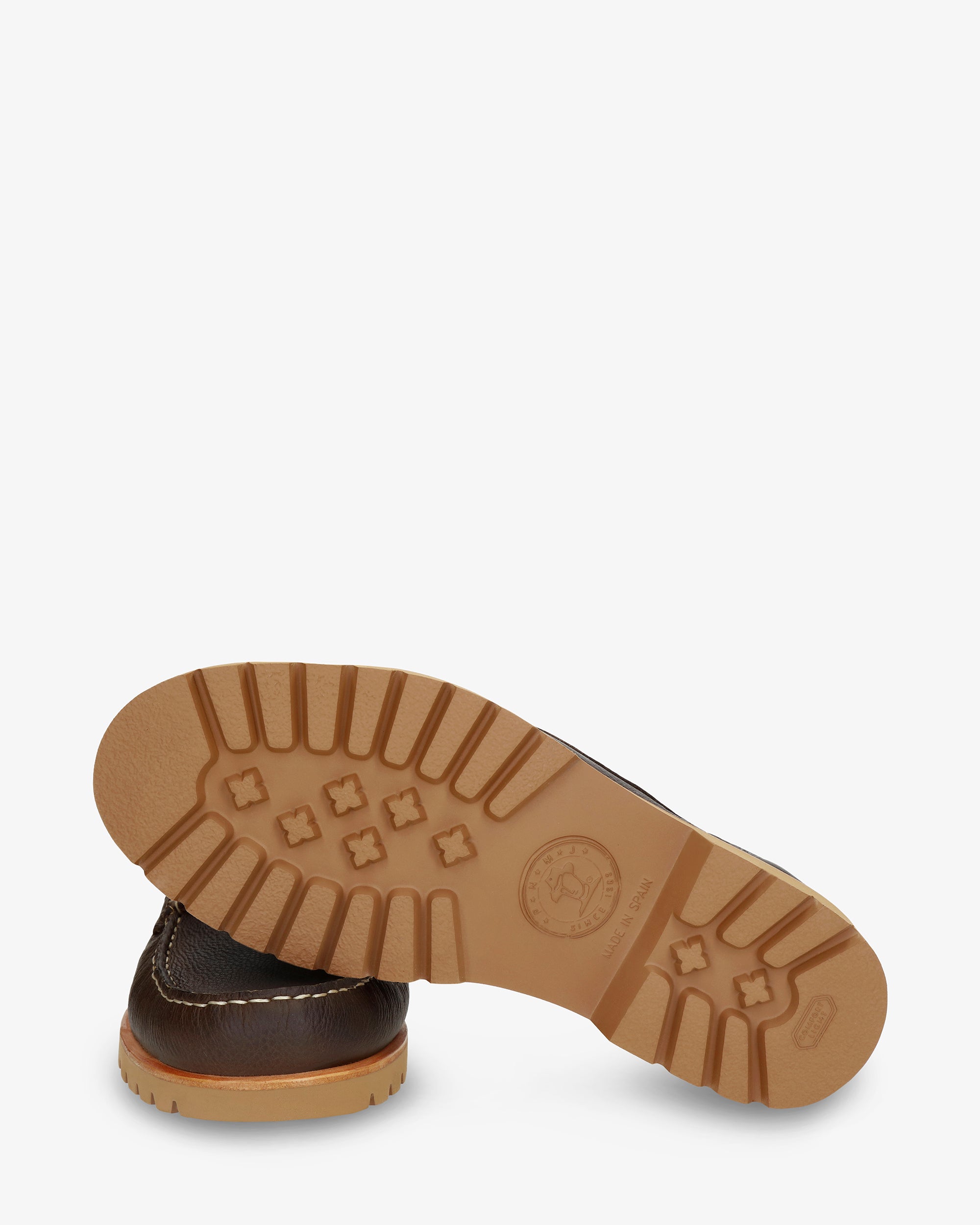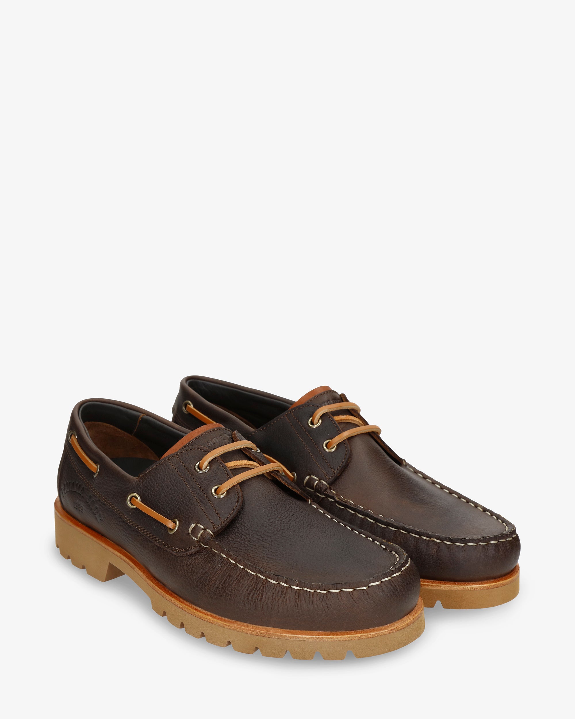 Náutico de hombre. Piel Napa Grass marrón WATERPROOF. Cierre de cordones. Forro interior de Piel. Plantilla anatómica extraíble. Suela de EVA, ligero, flexible y resistente. Altura tacón: 4 cm. 100% Hecho en España.