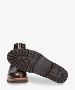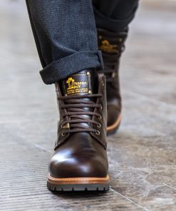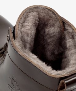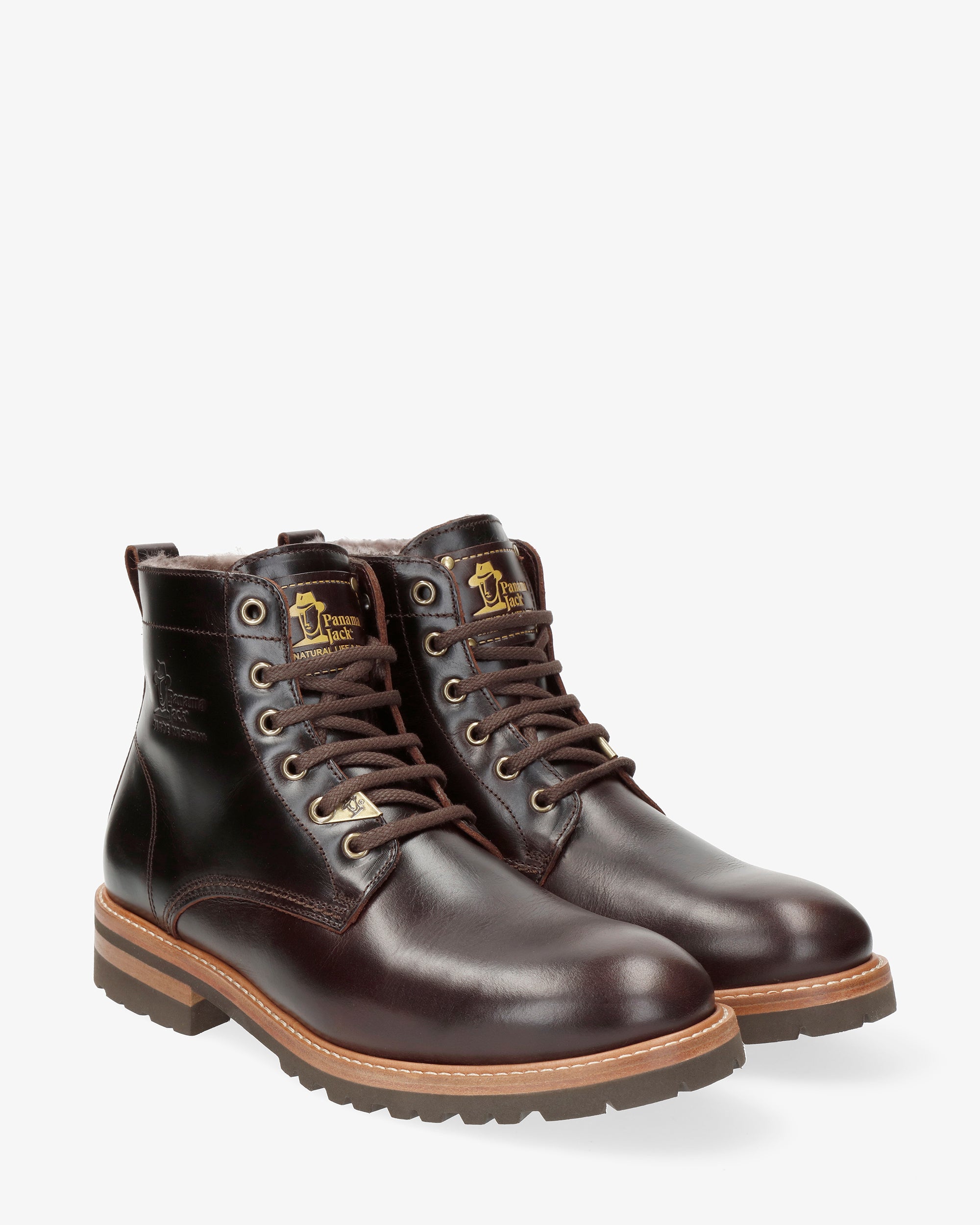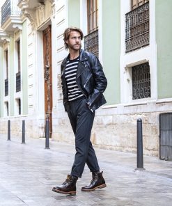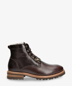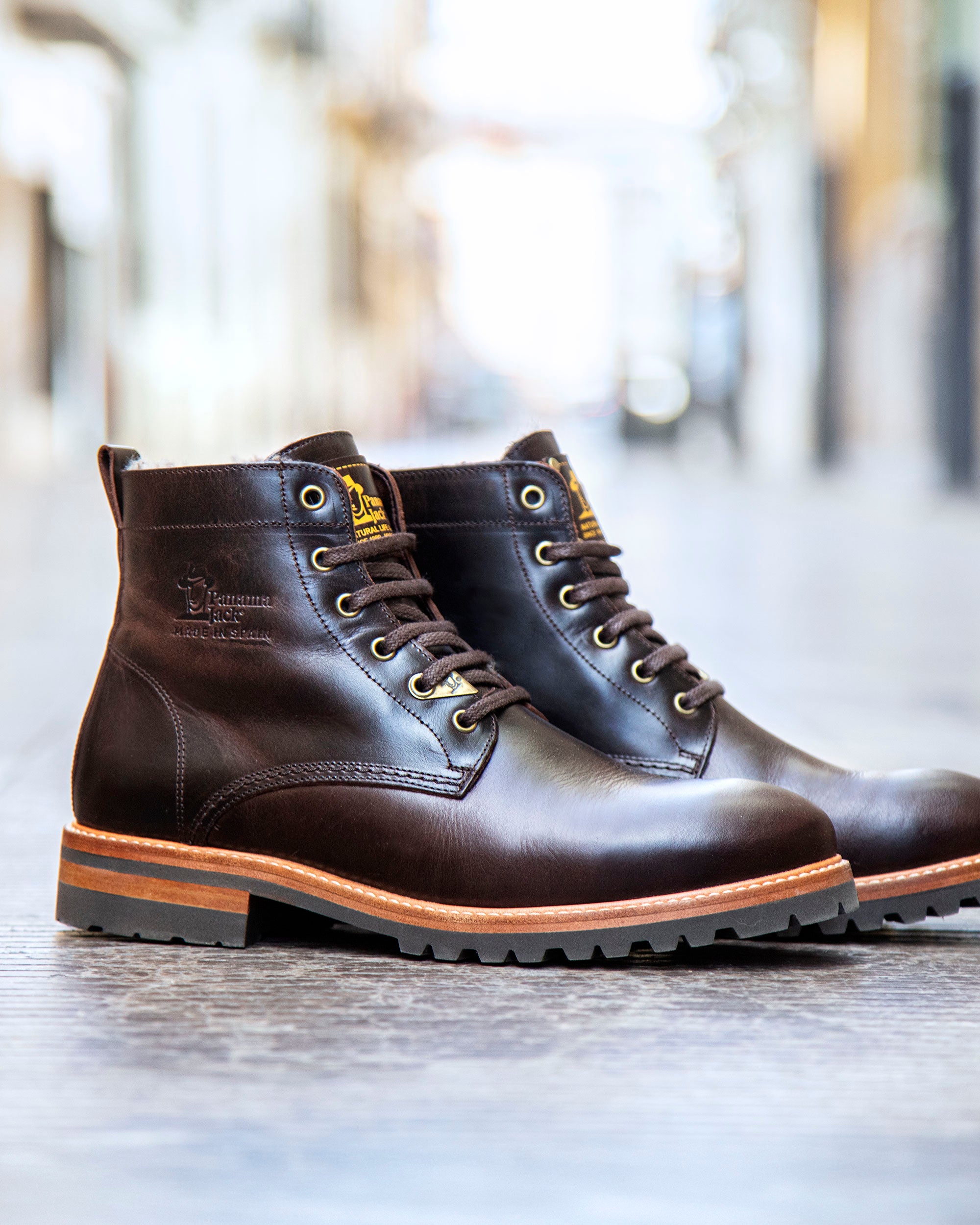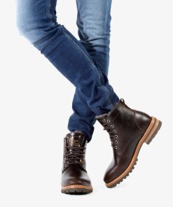 Botín de hombre. Piel Napa marrón. Cierre de cordones. Forro interior de Pelo natural. Plantilla anatómica. Suela de goma, flexible y resistente. Altura caña: 13 cm. Altura tacón: 3.8 cm. 100% Hecho en España.