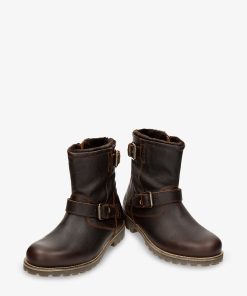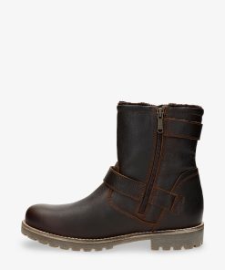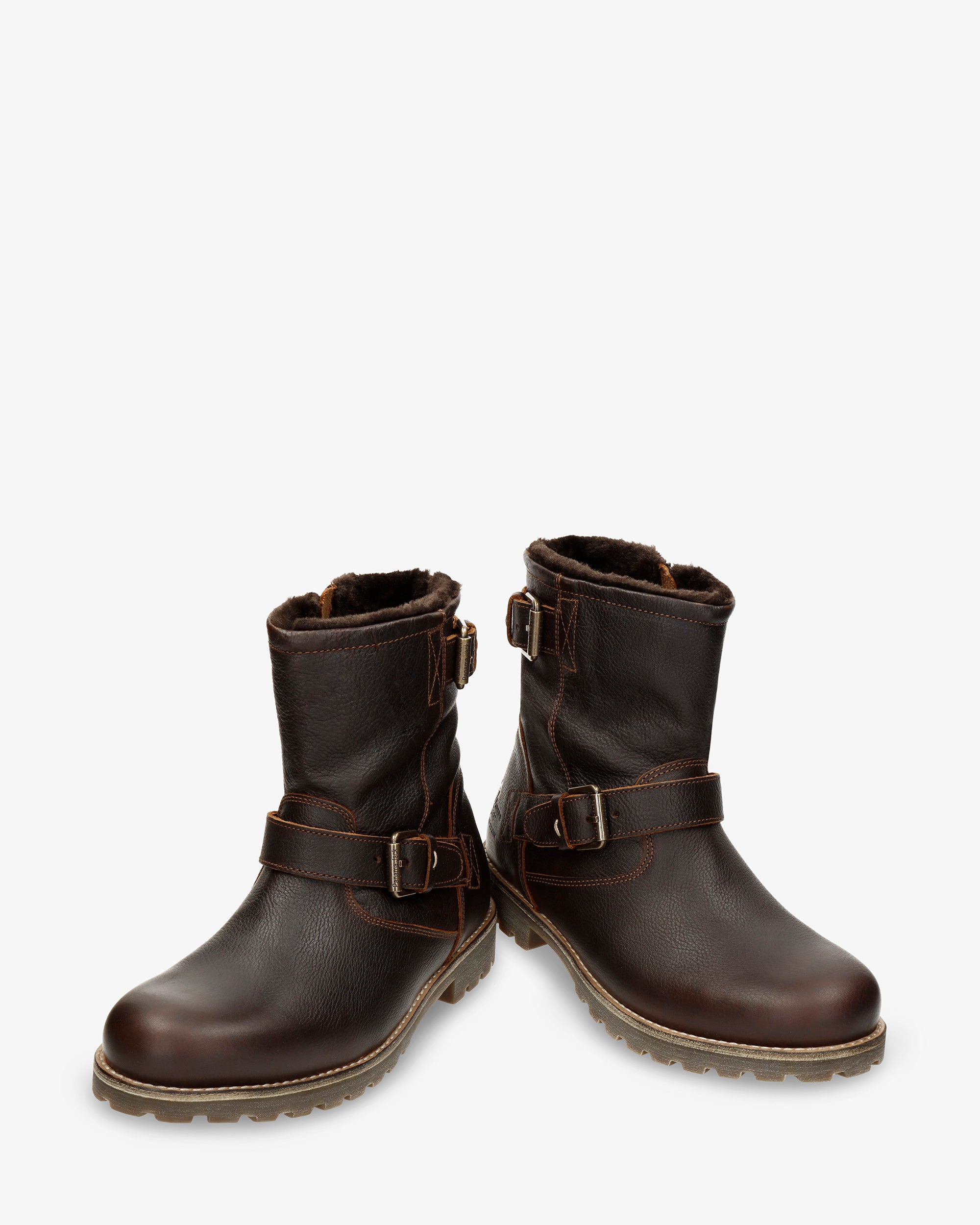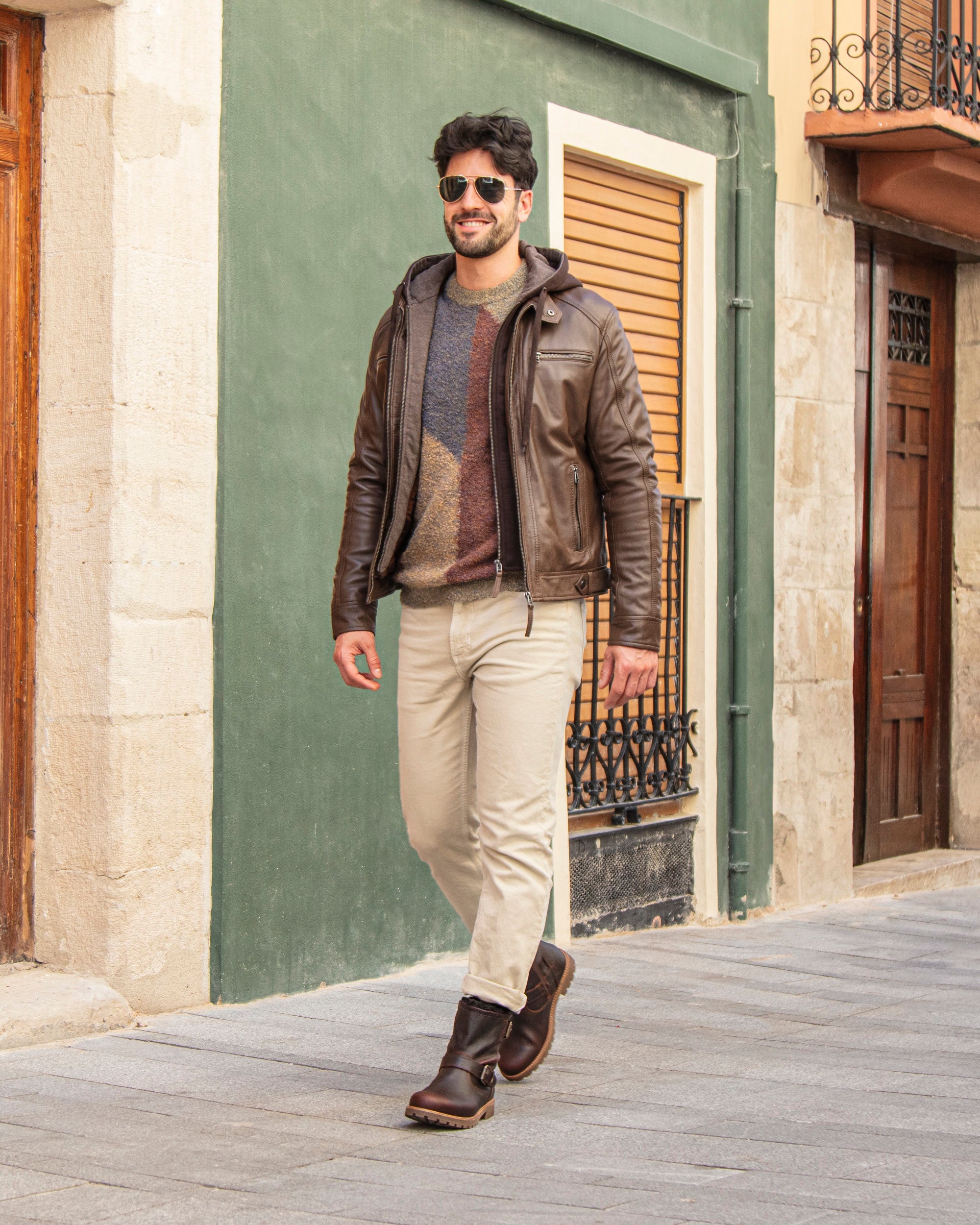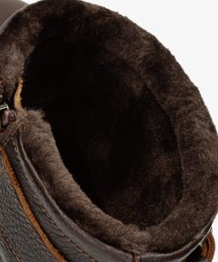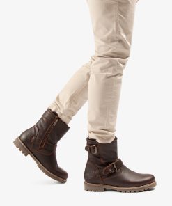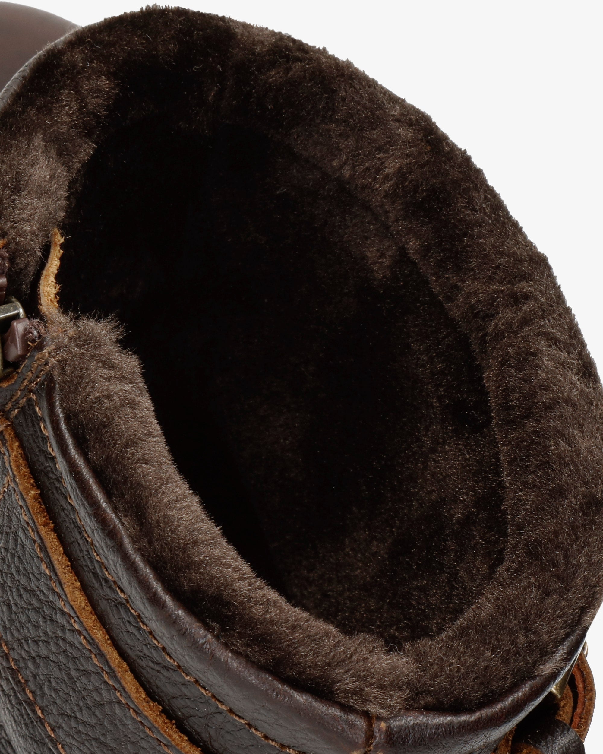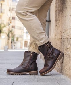 Bota de hombre. Piel Napa Grass Castaño WATERPROOF. Cierre de cremallera y hebilla. Forro interior de Pelo. Plantilla anatómica extraíble. Suela de caucho natural, flexible y resistente. Altura caña: 19 cm. Altura tacón: 4 cm. 100% Hecho en España.