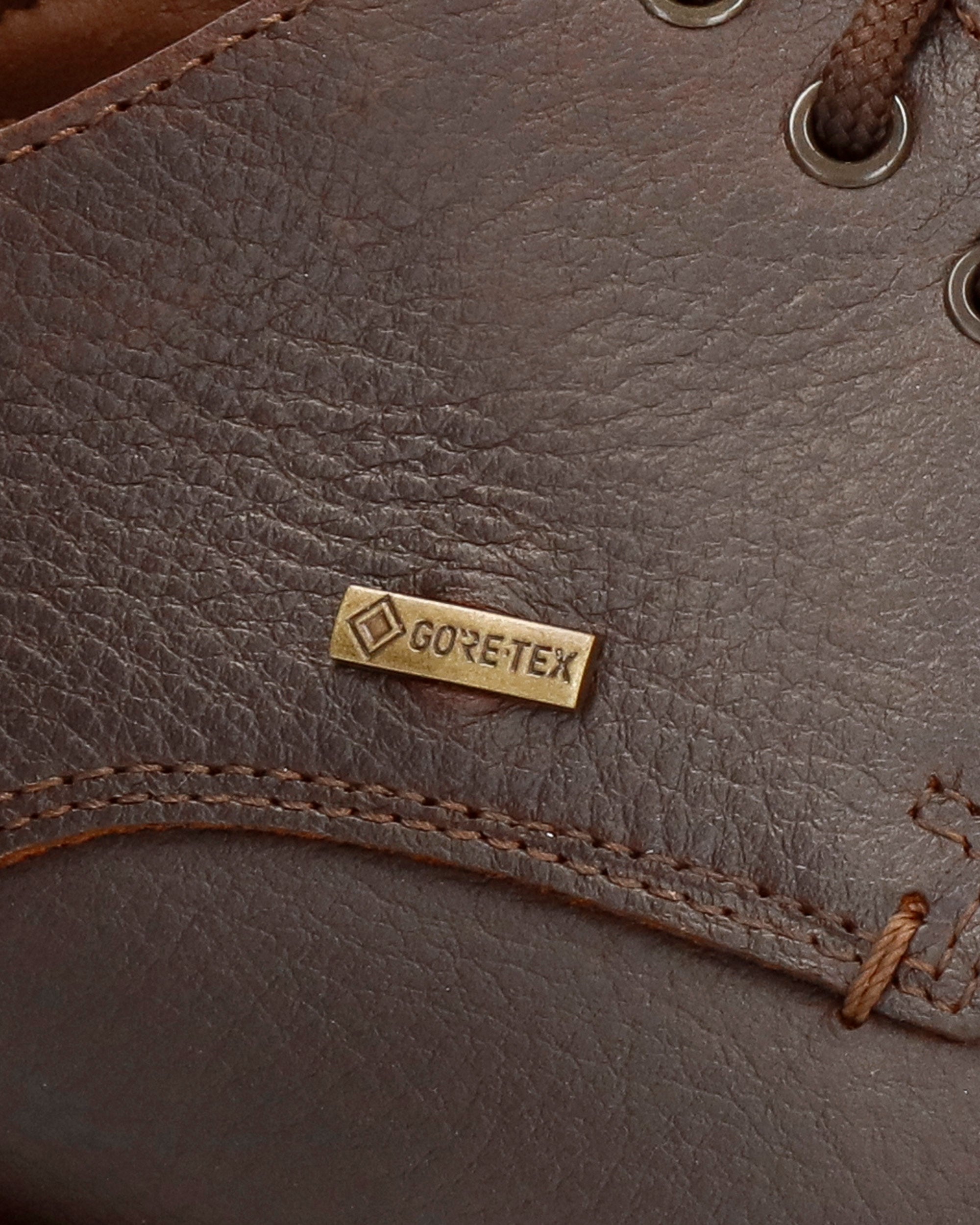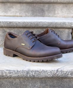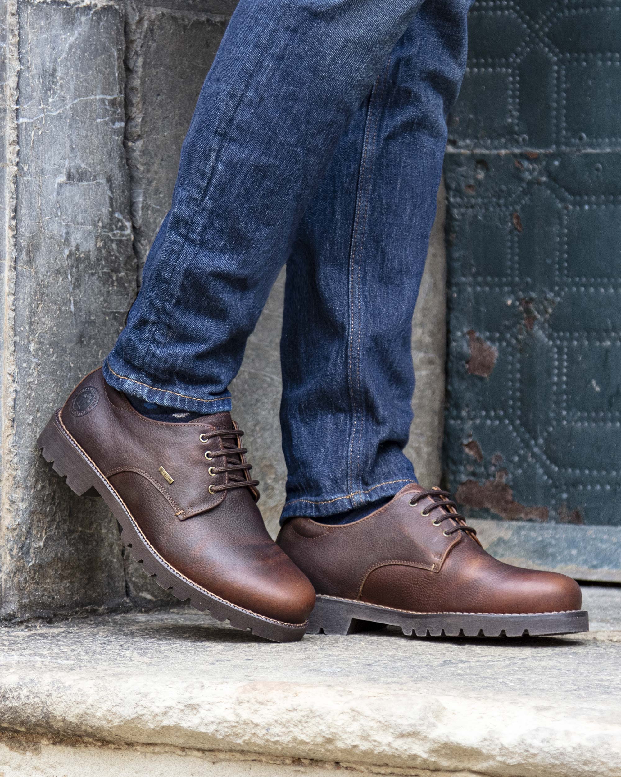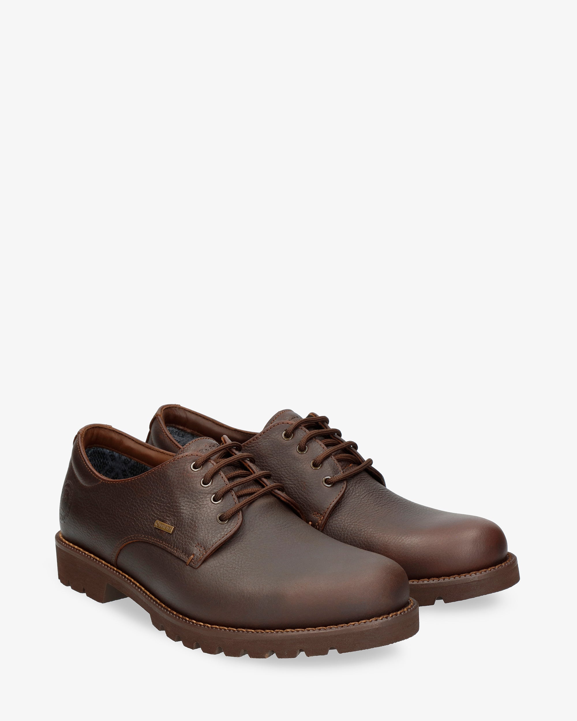 Zapato de hombre. Piel Napa Grass Castaño WATERPROOF. Cierre de cordones. Forro interior de Gore-Tex®. Plantilla anatómica extraíble. Suela de caucho natural, flexible y resistente. Altura tacón: 4 cm. 100% Hecho en España.