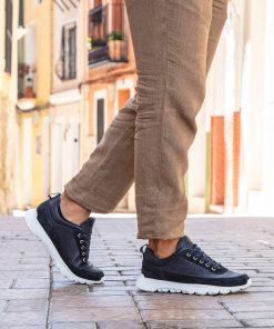 Sneakers de hombre. Piel Napa Marino. Cierre de cordones. Forro interior de Piel. Plantilla anatómica extraíble. Suela de EVA, ligero, flexible y resistente. Altura tacón: 5 cm. 100% Hecho en España.