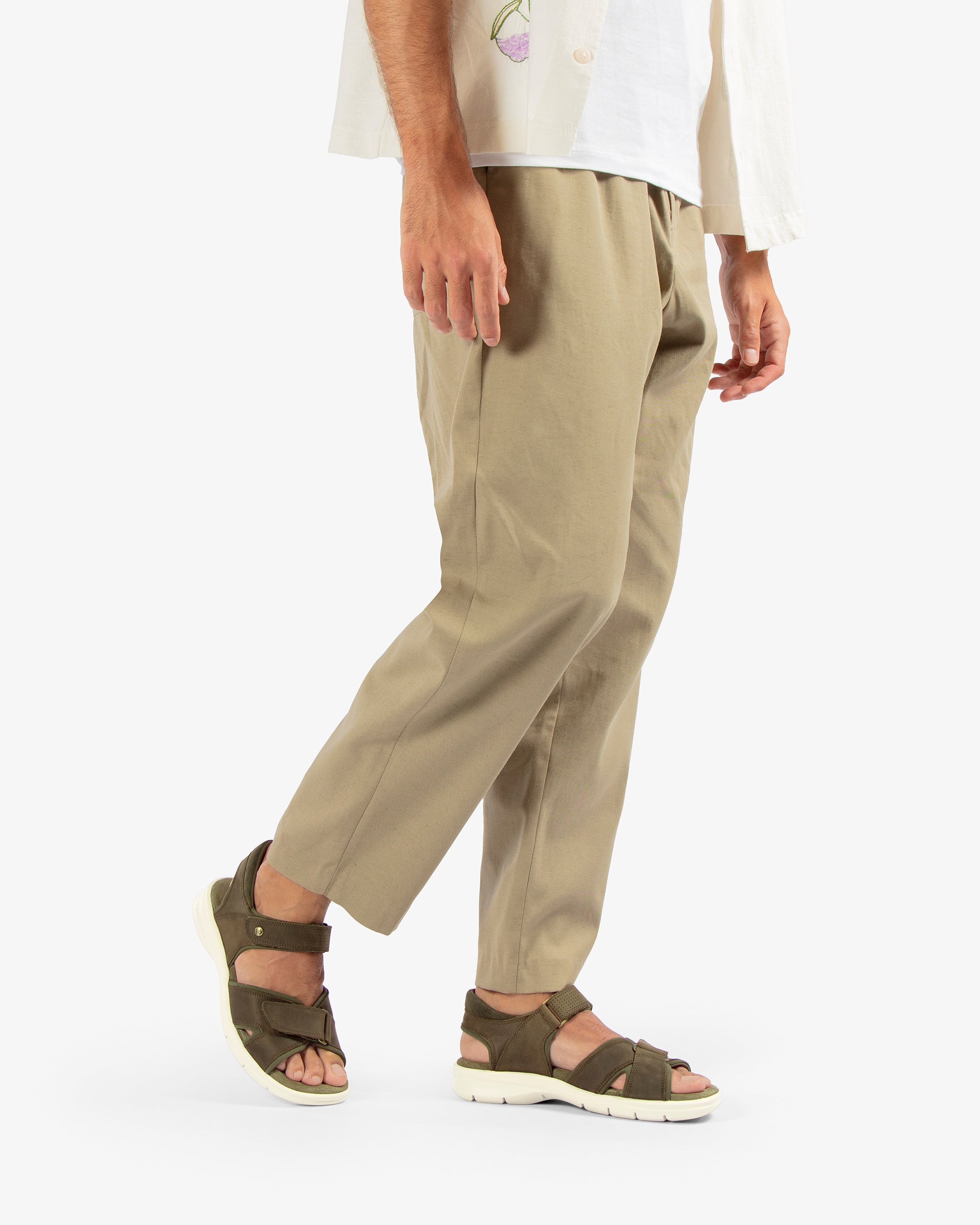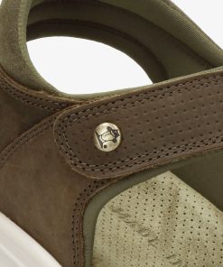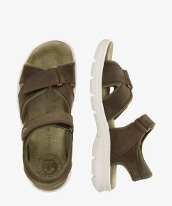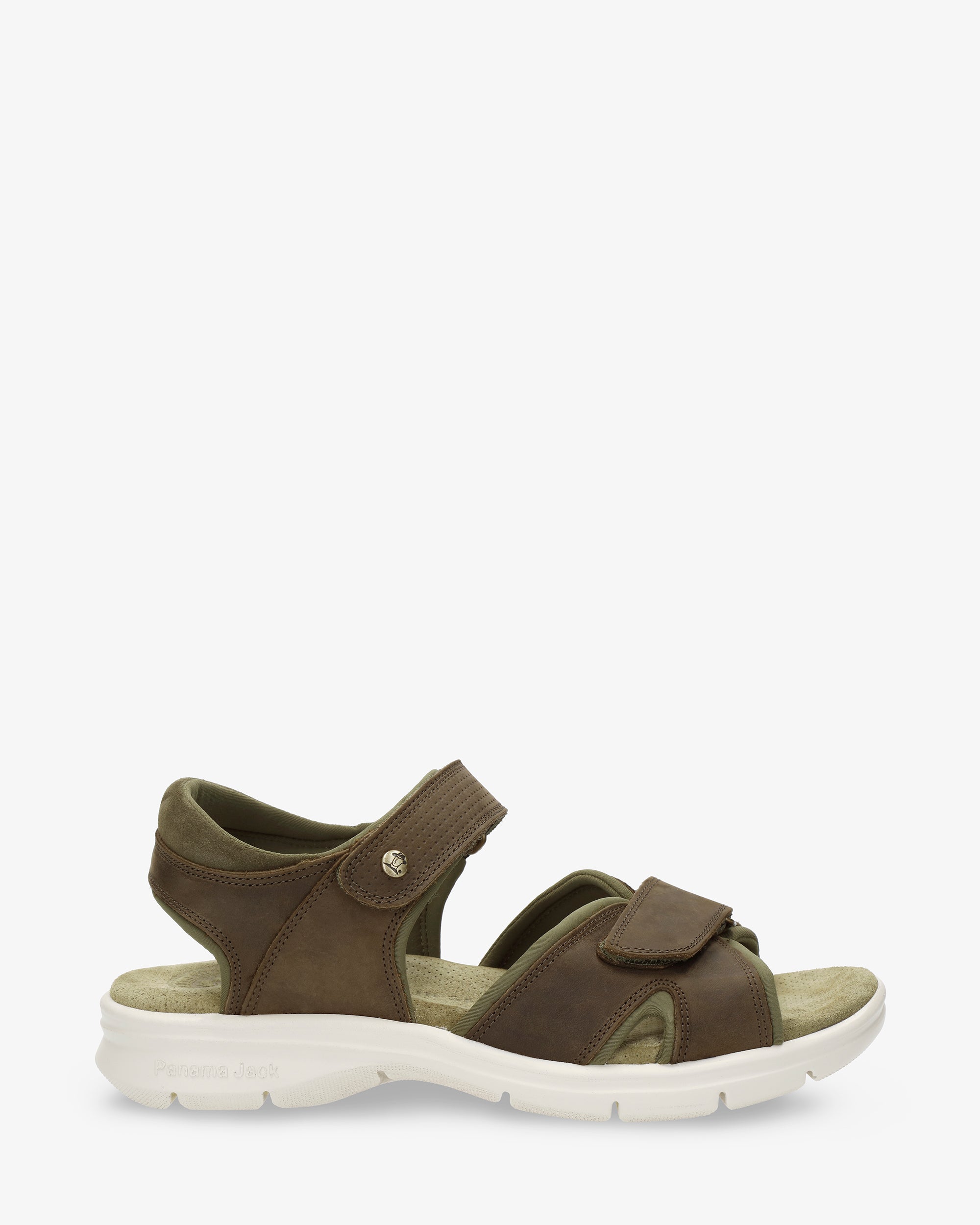 Sandalia de hombre. Piel Napa Grass Kaki WATERPROOF. Cierre de velcro. Forro interior de Lycra. Plantilla anatómica. Suela de poliuretano, flexible y resistente. Altura tacón: 5 cm. 100% Hecho en España.