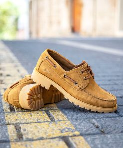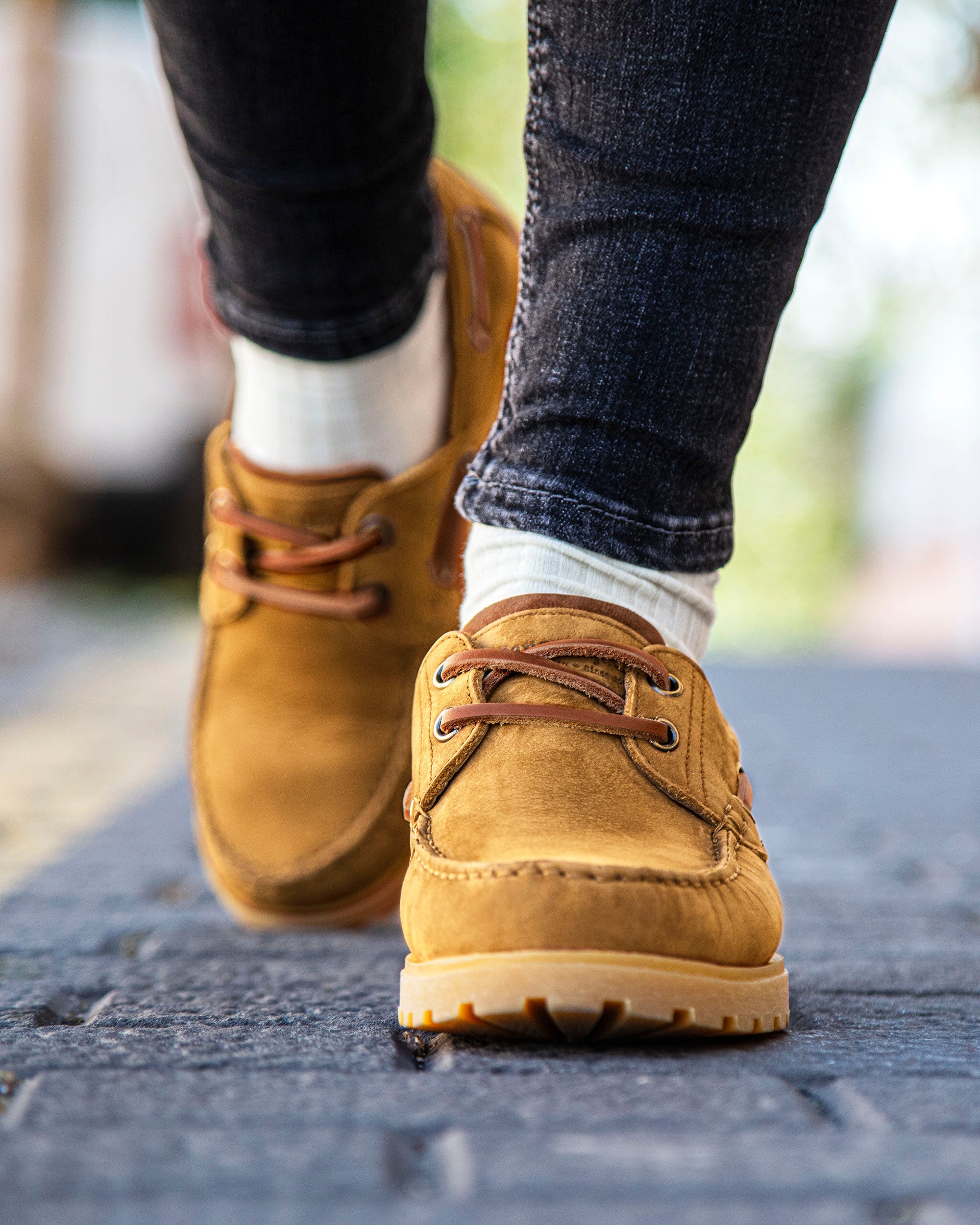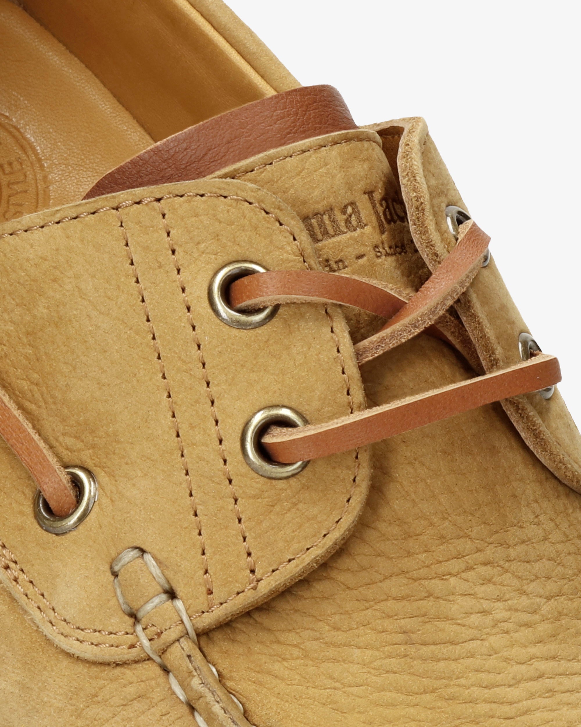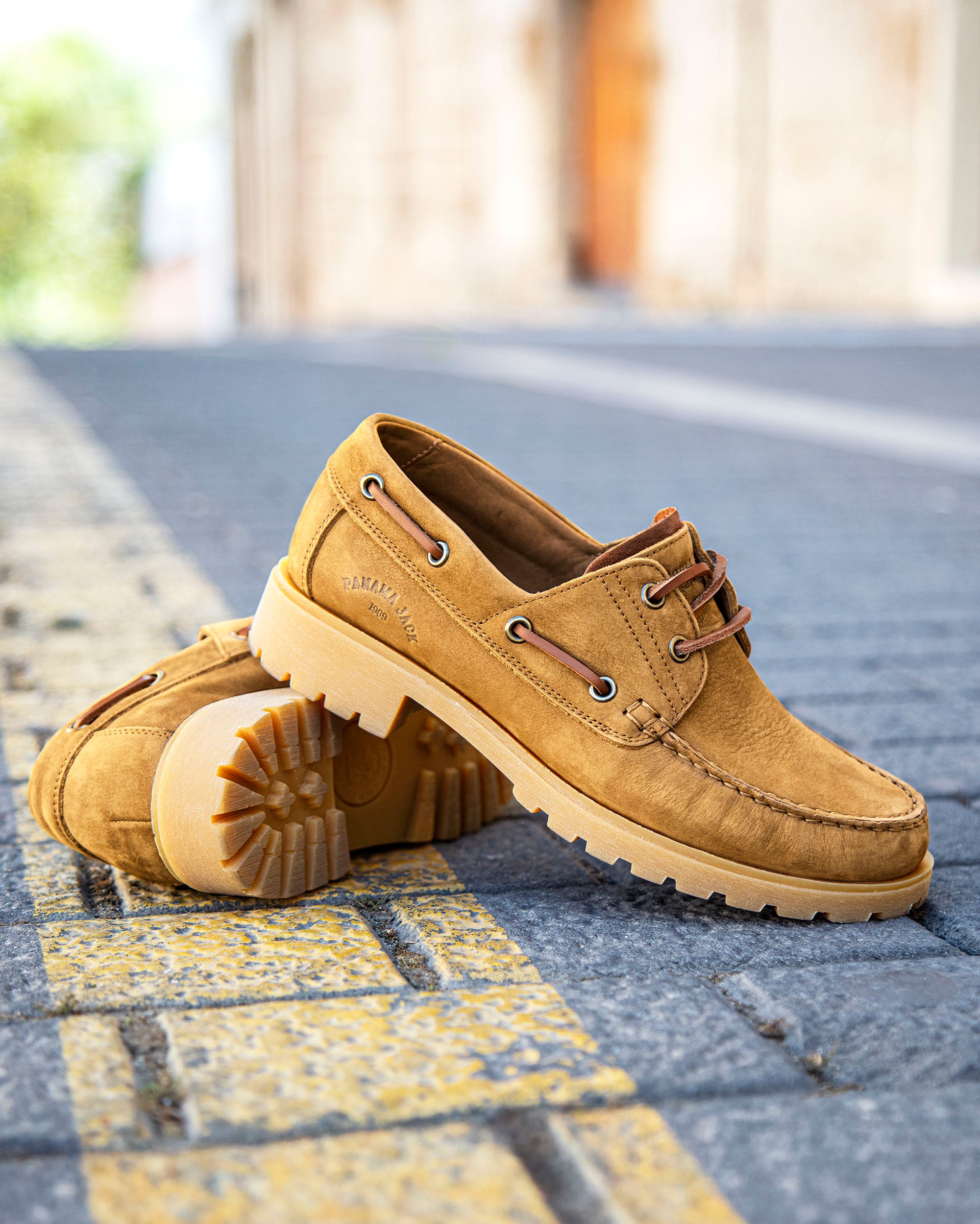 Náutico de mujer. Piel Nobuck Ocre WATERPROOF. Cierre de cordones. Forro interior de Piel. Plantilla anatómica extraíble. Suela de caucho natural, flexible y resistente. Altura tacón: 4 cm. 100% Hecho en España.