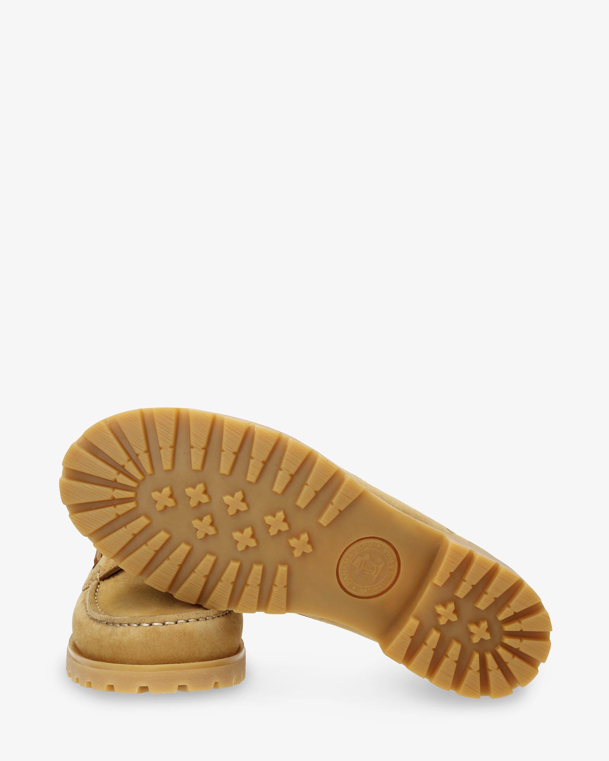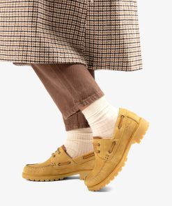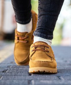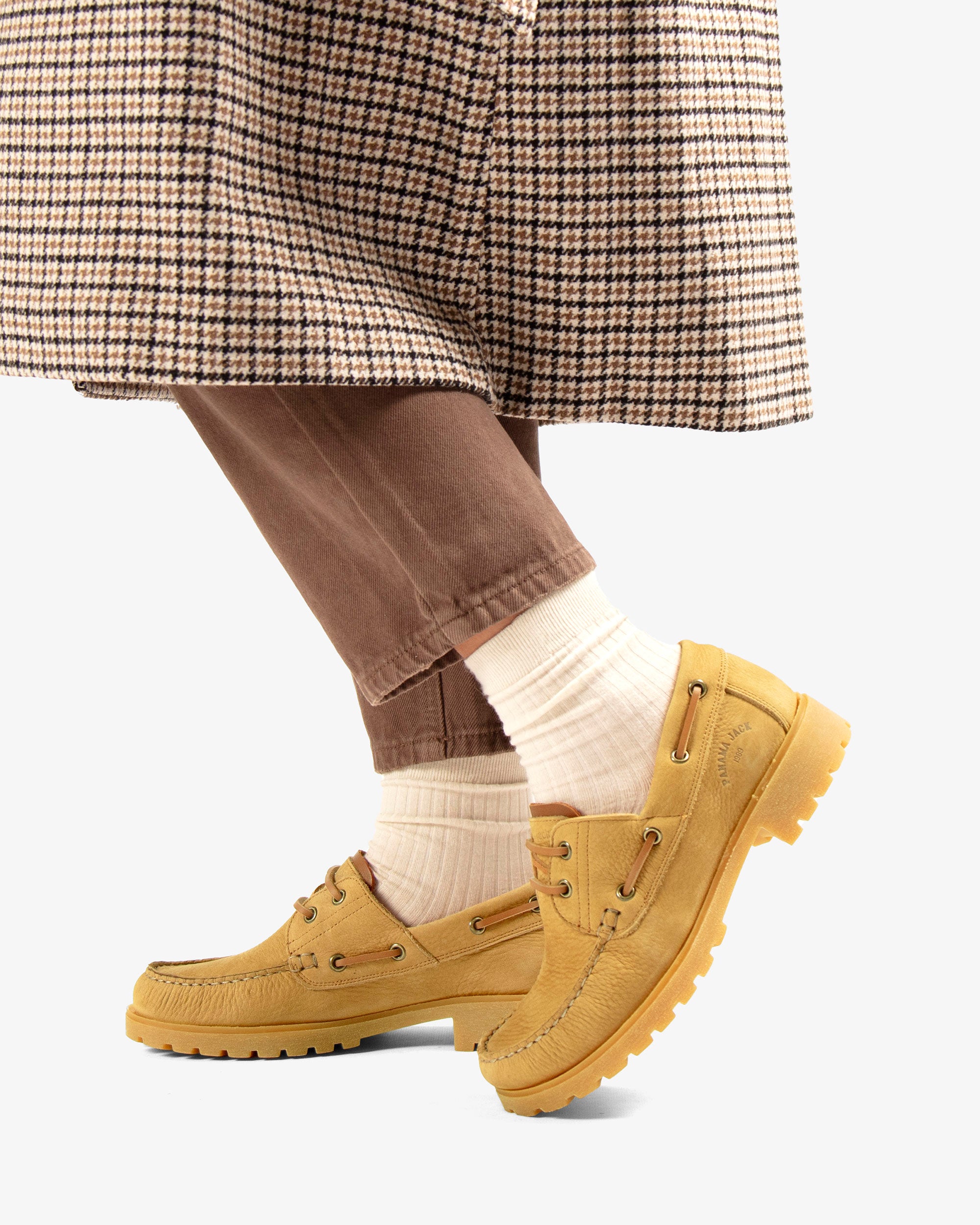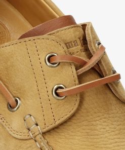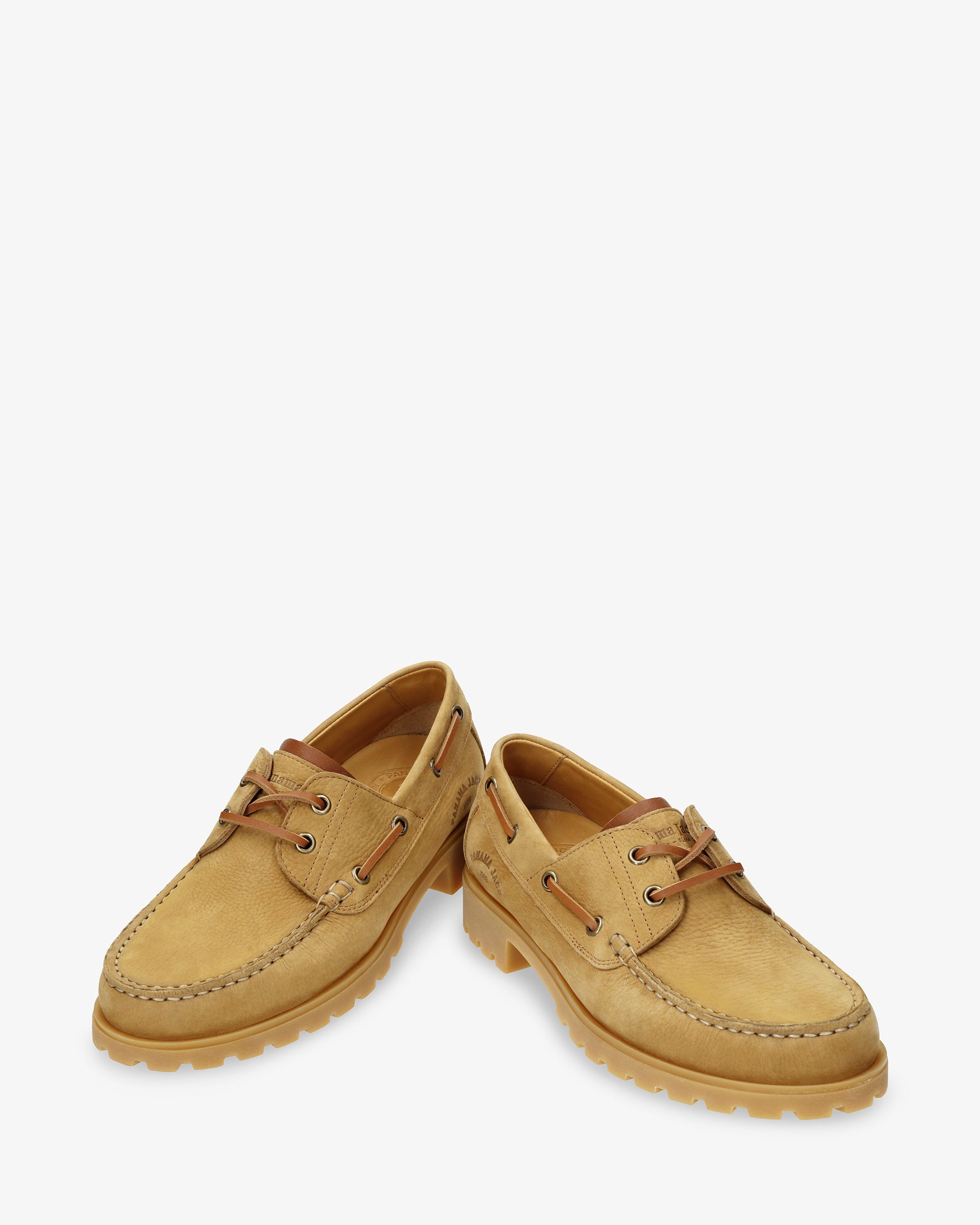 Náutico de mujer. Piel Nobuck Ocre WATERPROOF. Cierre de cordones. Forro interior de Piel. Plantilla anatómica extraíble. Suela de caucho natural, flexible y resistente. Altura tacón: 4 cm. 100% Hecho en España.