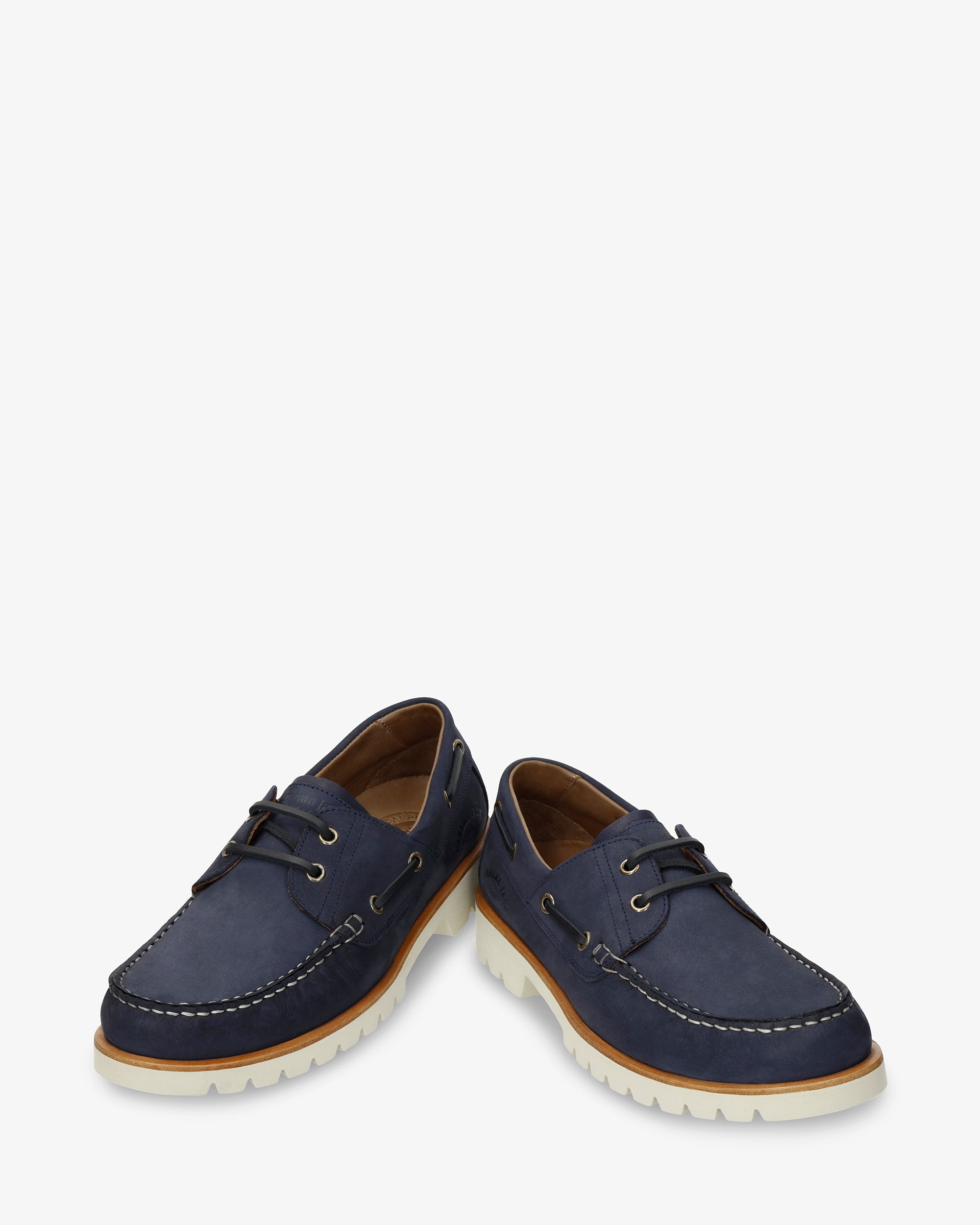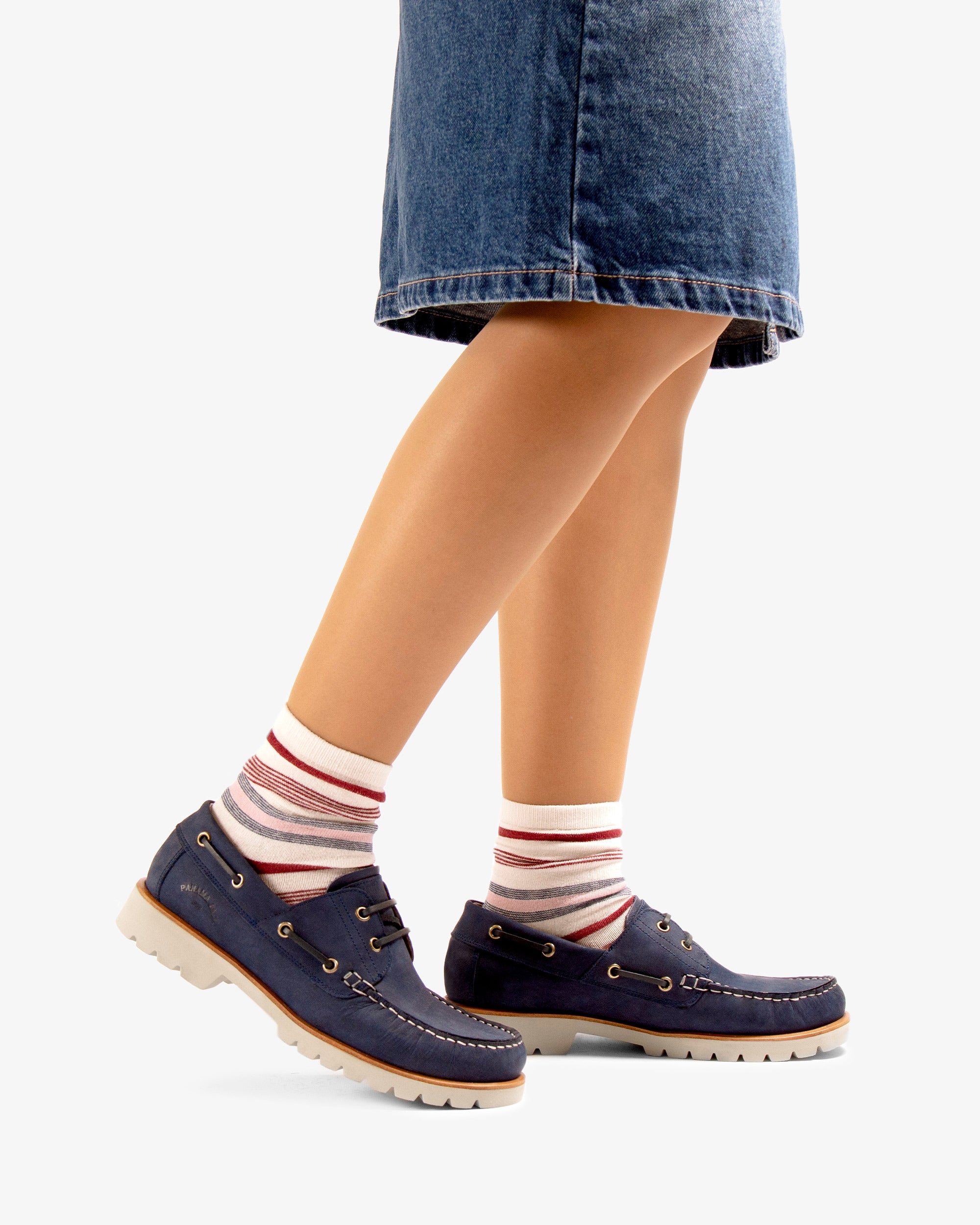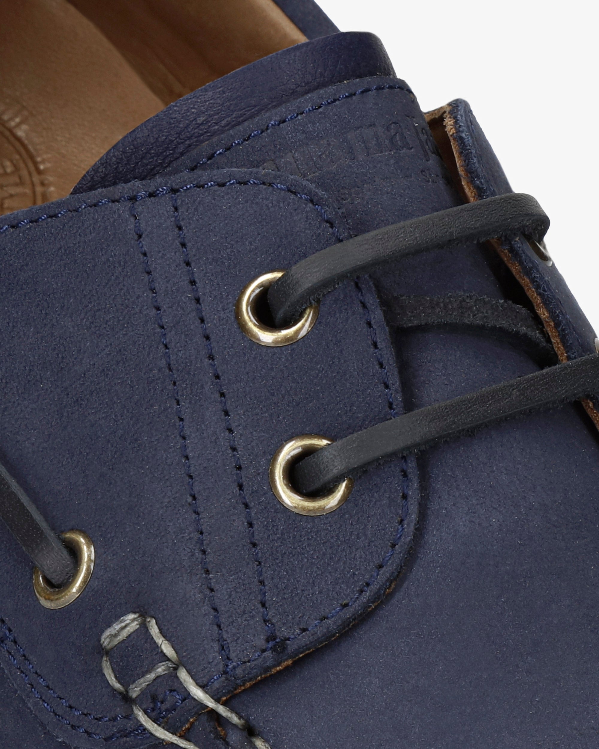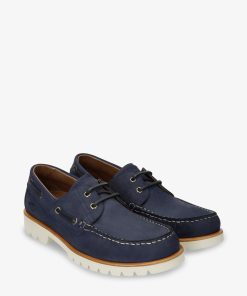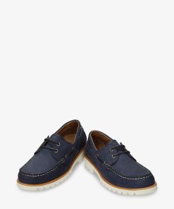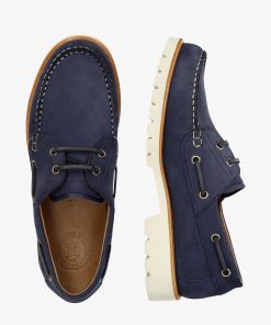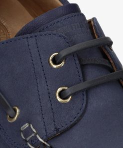 Náutico de mujer. Piel Nobuck Marino WATERPROOF. Cierre de cordones. Forro interior de Piel. Plantilla anatómica extraíble. Suela de EVA, ligero, flexible y resistente. Altura tacón: 4 cm. 100% Hecho en España.