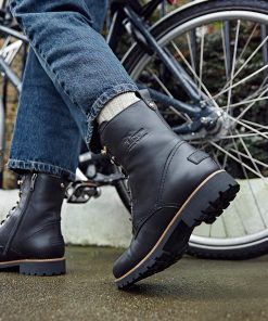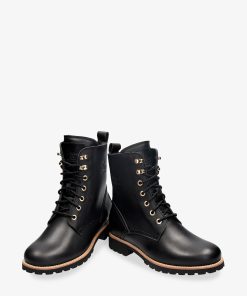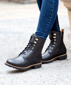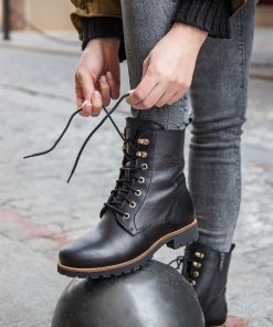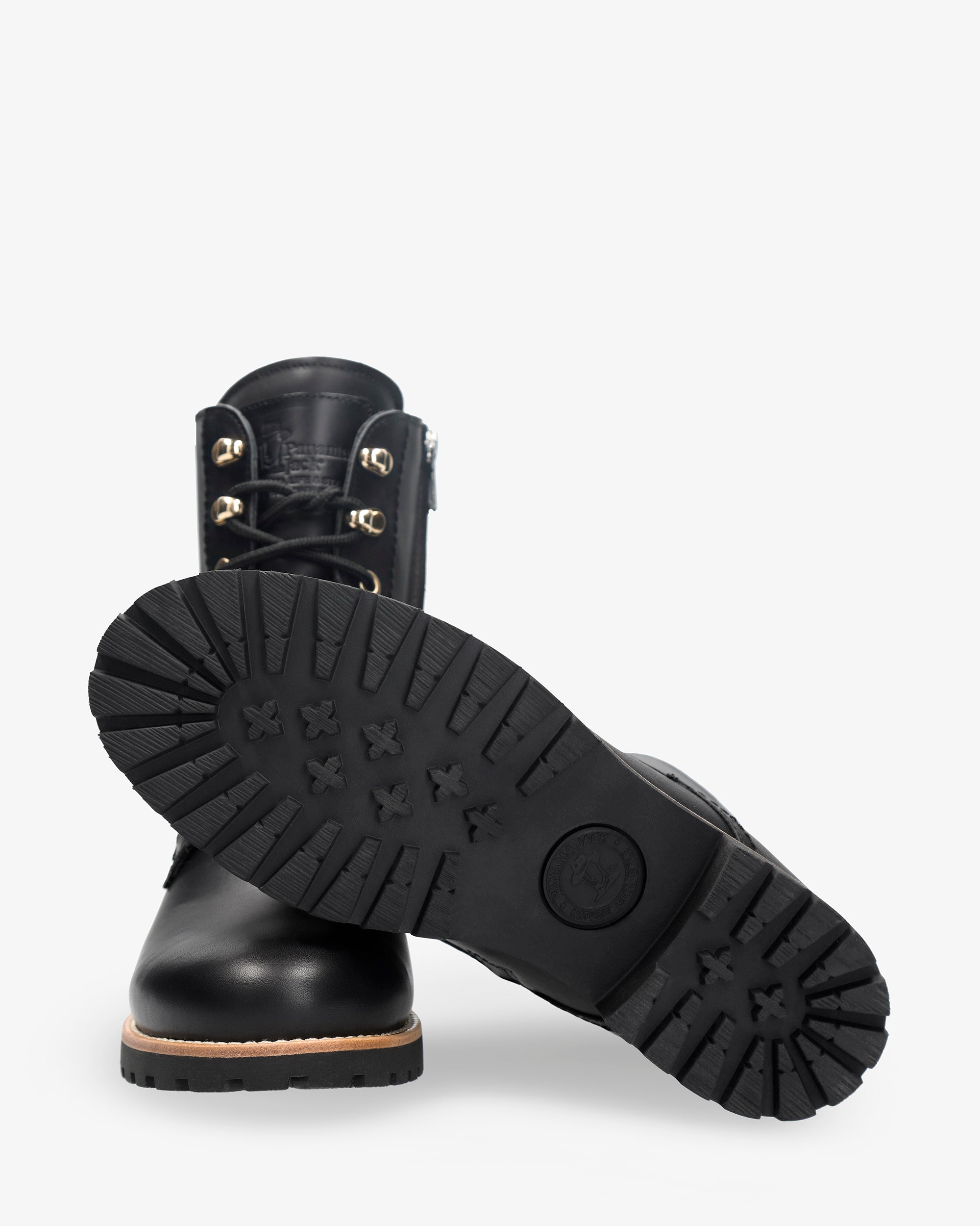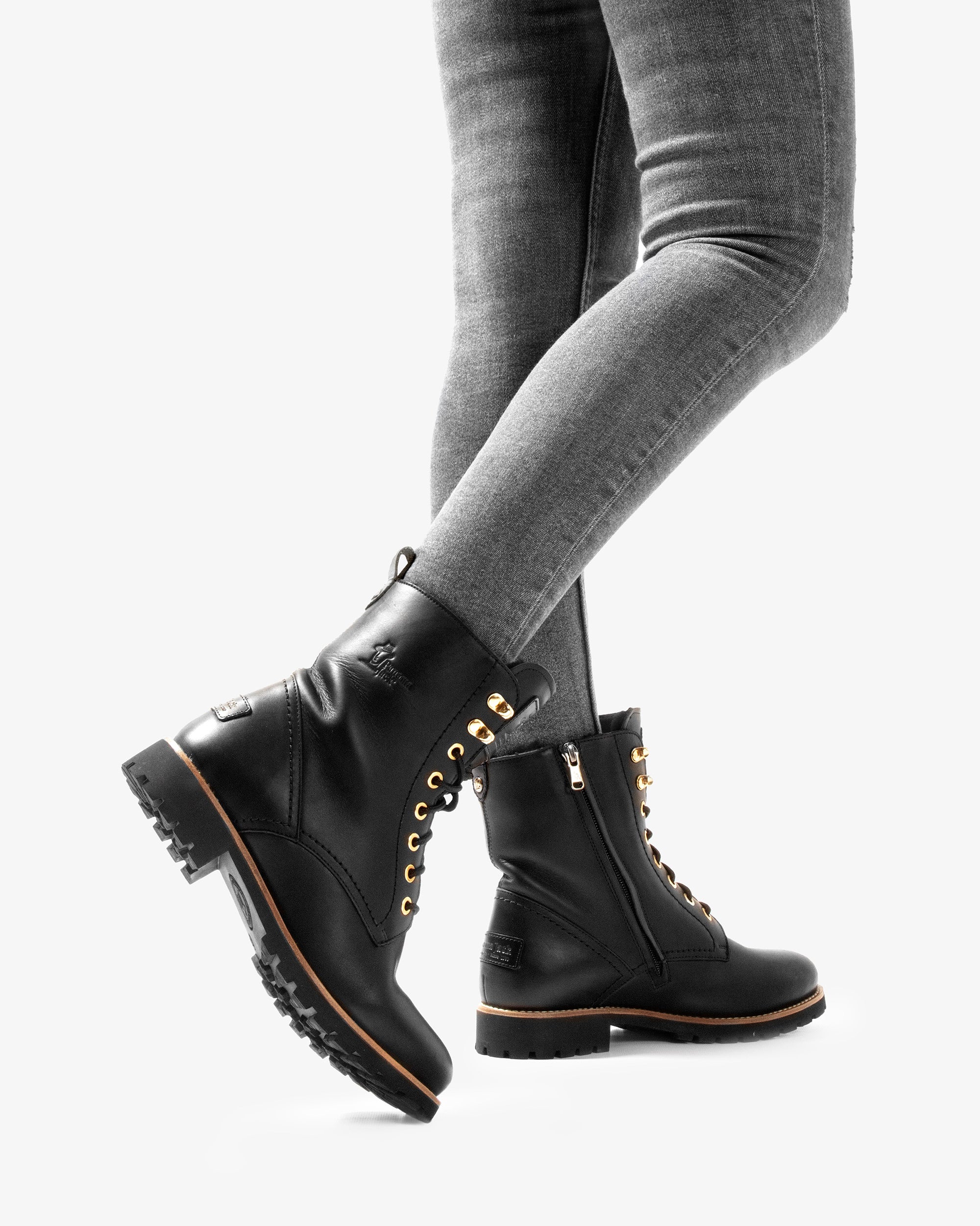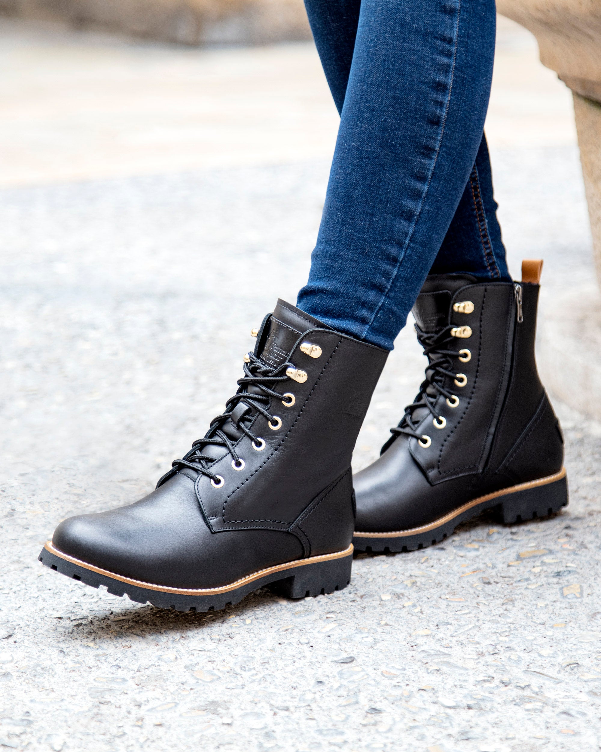 Bota de mujer plana. Piel Napa Negro WATERPROOF. Cierre de cordones y cremallera. Forro interior de Pelo natural. Plantilla anatómica extraíble. Suela de caucho natural, flexible y resistente. Altura caña: 16 cm. Altura tacón: 4 cm. 100% Hecho en España.