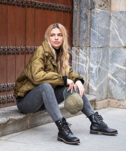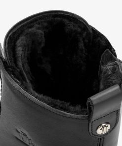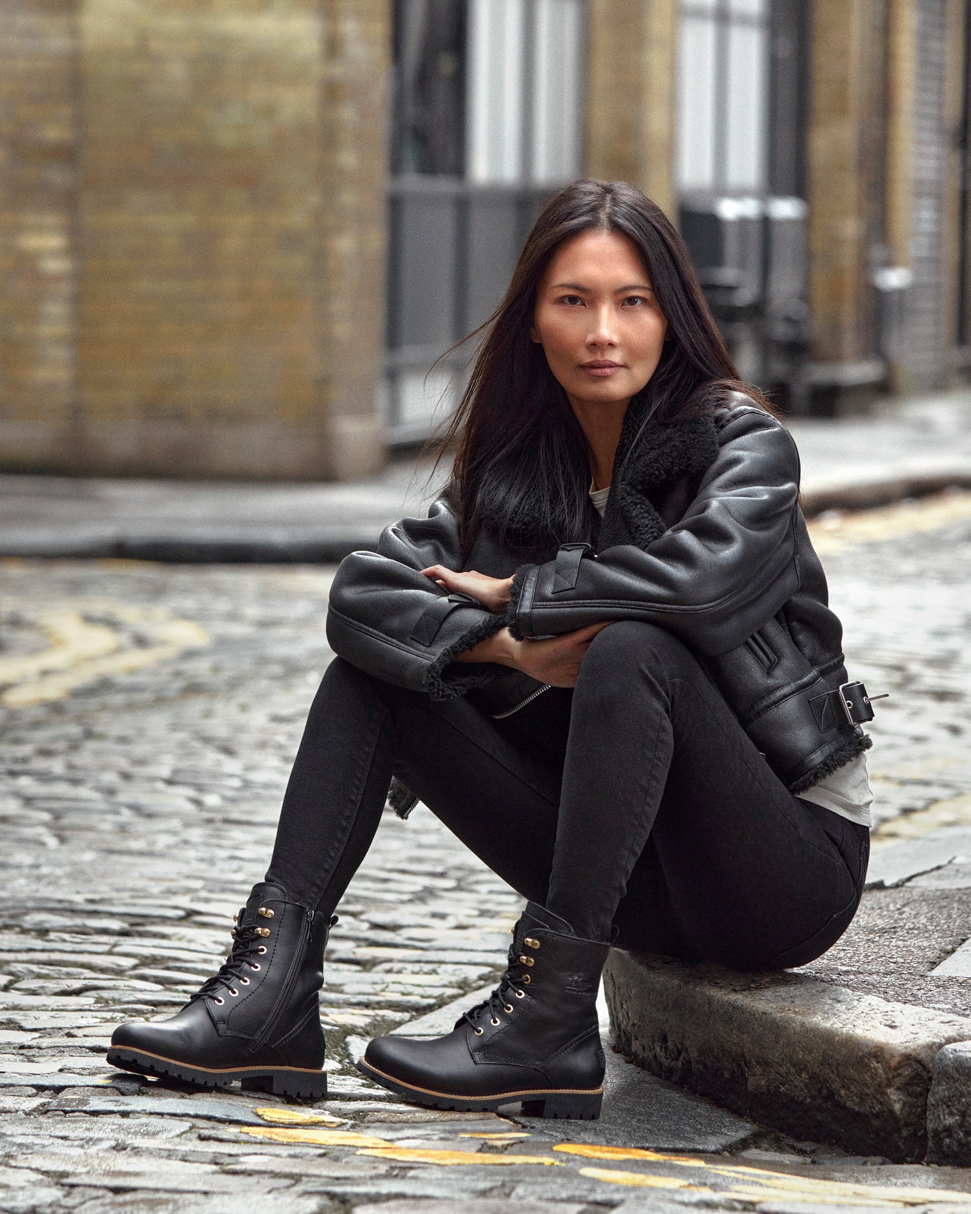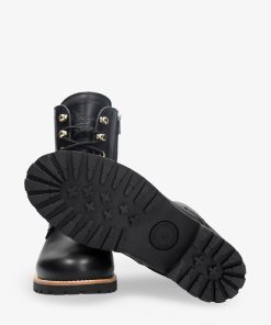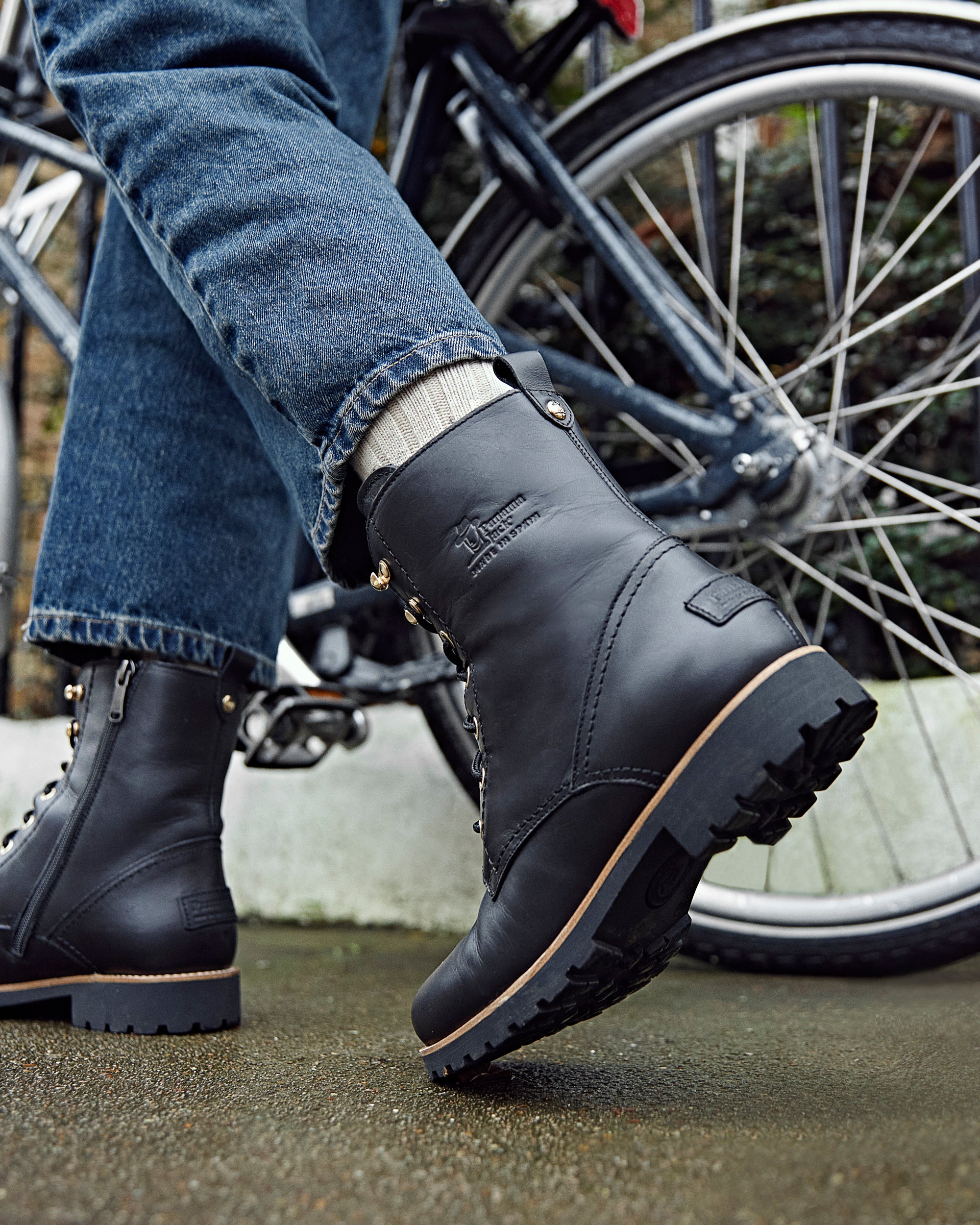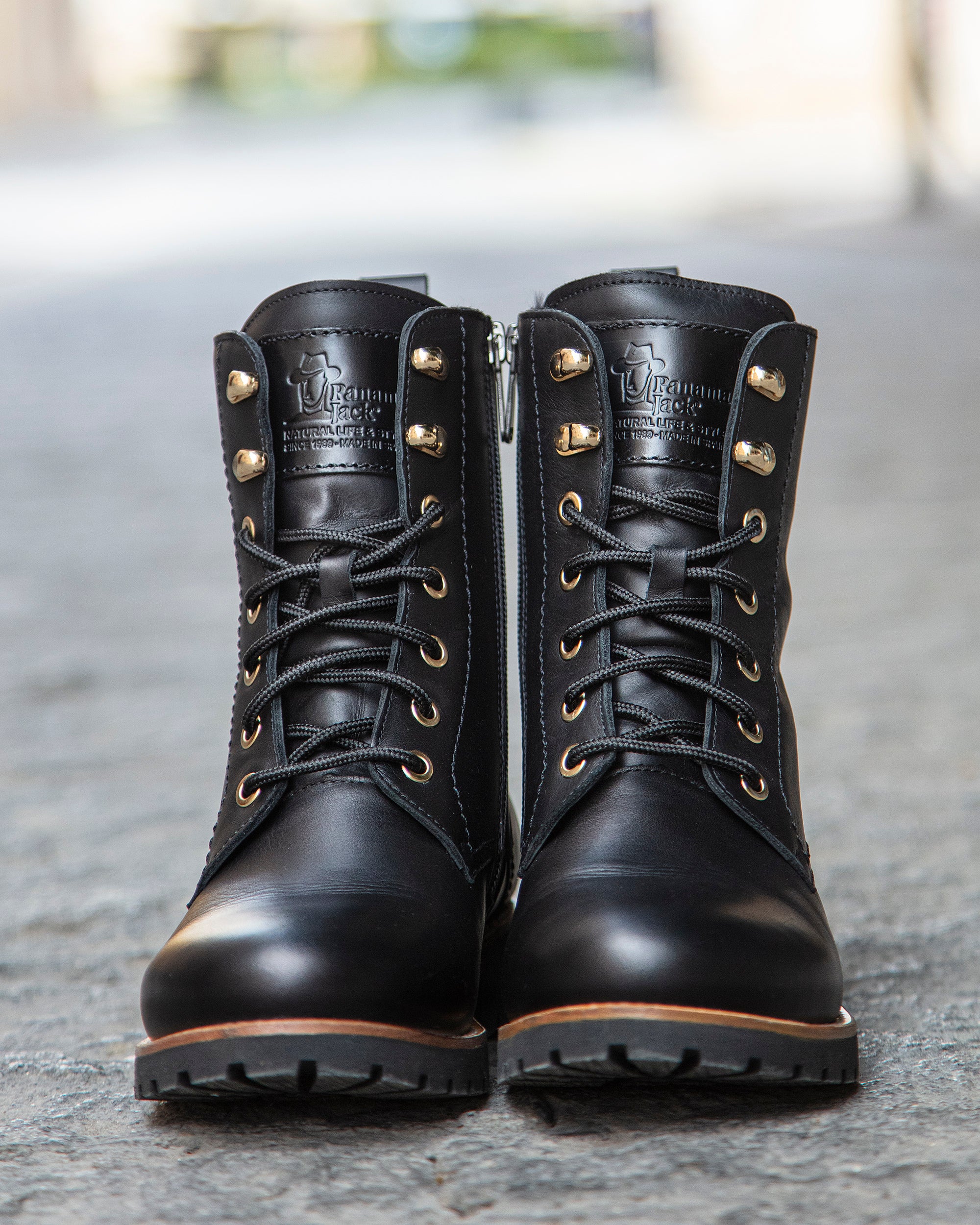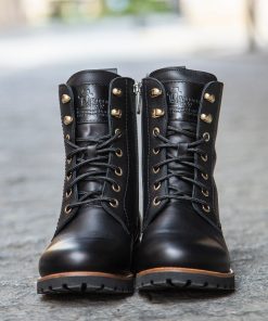 Bota de mujer plana. Piel Napa Negro WATERPROOF. Cierre de cordones y cremallera. Forro interior de Pelo natural. Plantilla anatómica extraíble. Suela de caucho natural, flexible y resistente. Altura caña: 16 cm. Altura tacón: 4 cm. 100% Hecho en España.