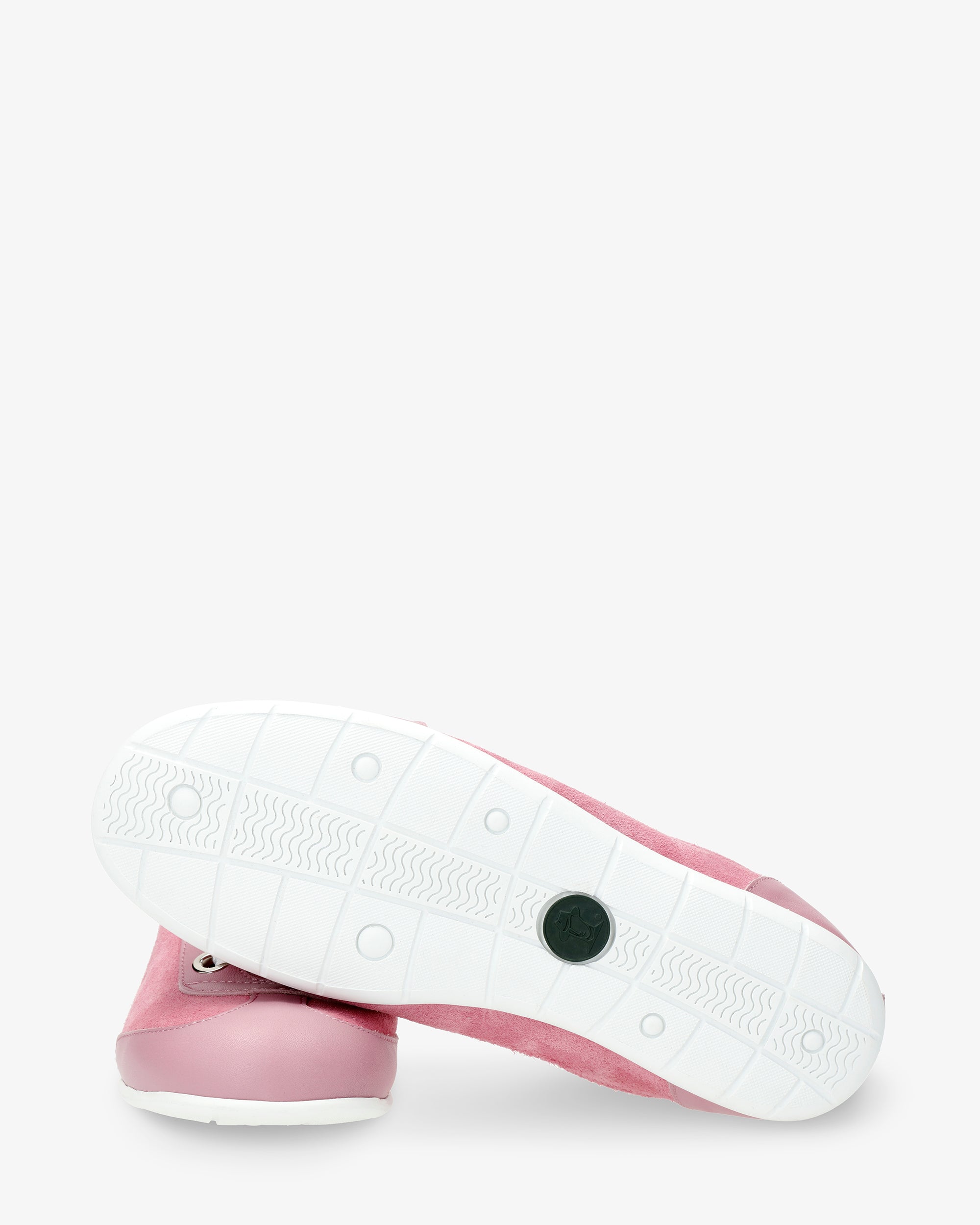 Sneakers de mujer. Piel Velour Rosa. Cierre de cordones. Forro interior de Piel. Plantilla anatómica extraíble. Suela de caucho natural, flexible y resistente. Altura tacón: 2 cm. 100% Hecho en España.