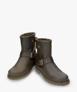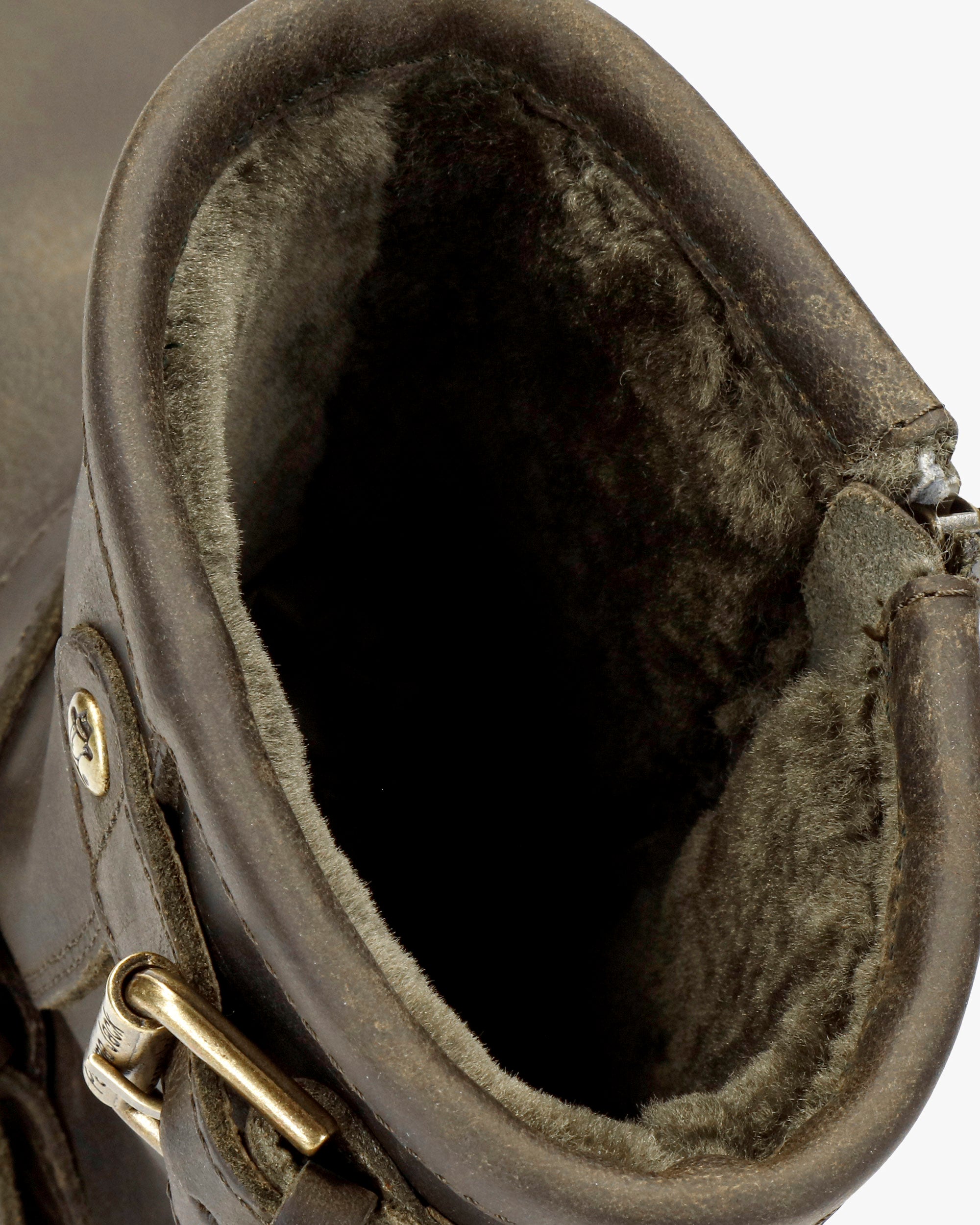 Bota de mujer plana. Piel Napa Grass Kaki WATERPROOF. Cierre de cremallera y hebilla. Forro interior de Pelo natural. Plantilla anatómica extraíble. Suela de caucho natural, flexible y resistente. Altura caña: 17 cm. Altura tacón: 4 cm. 100% Hecho en España.