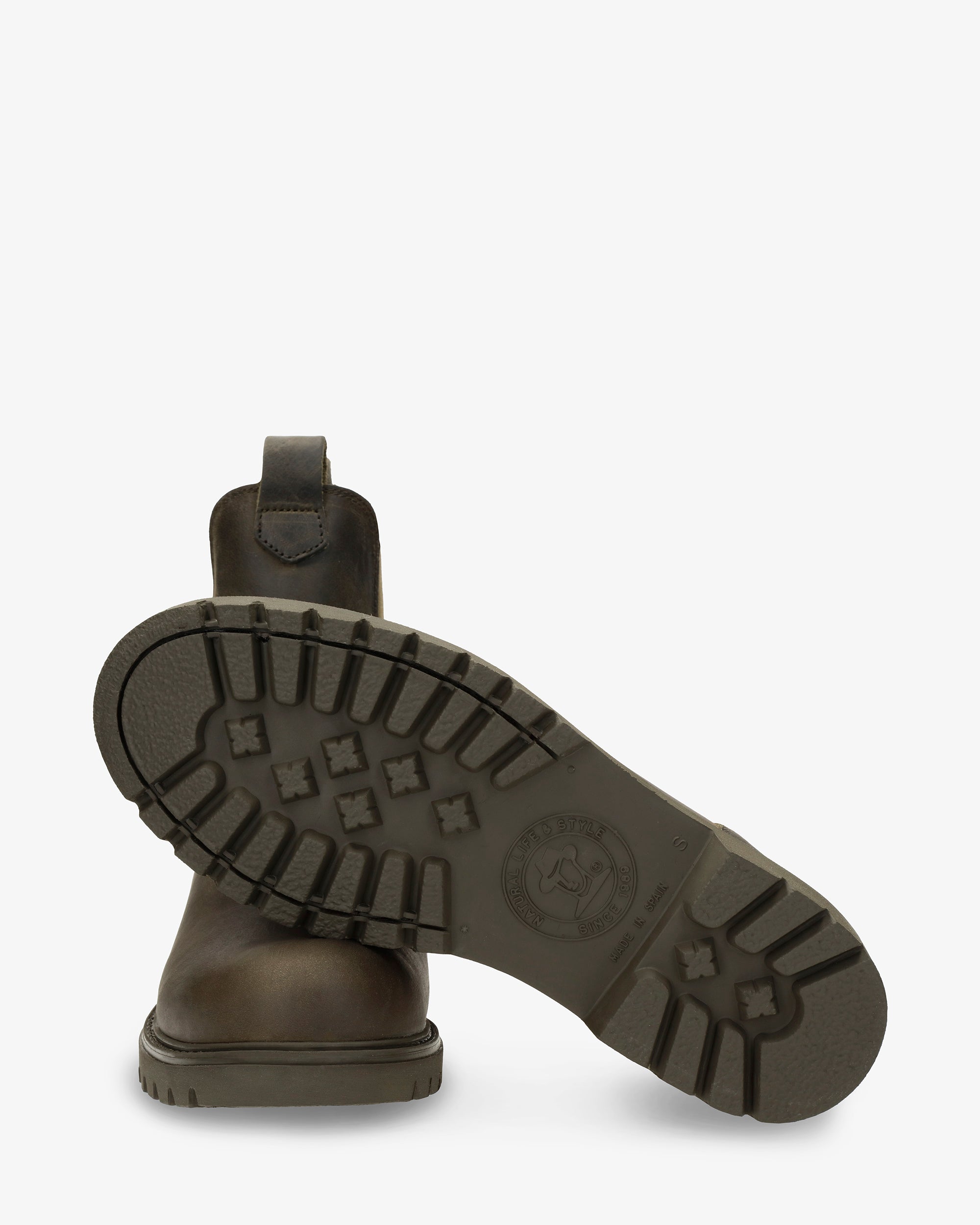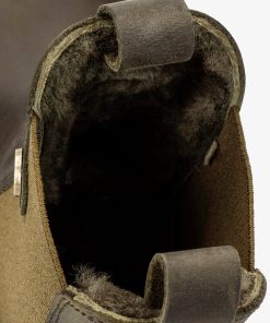Bota de mujer plana. Piel Napa Grass Kaki WATERPROOF. Forro interior de Pelo natural. Plantilla anatómica extraíble. Suela de caucho natural, flexible y resistente. Altura caña: 14,5 cm. Altura tacón: 4 cm. 100% Hecho en España.