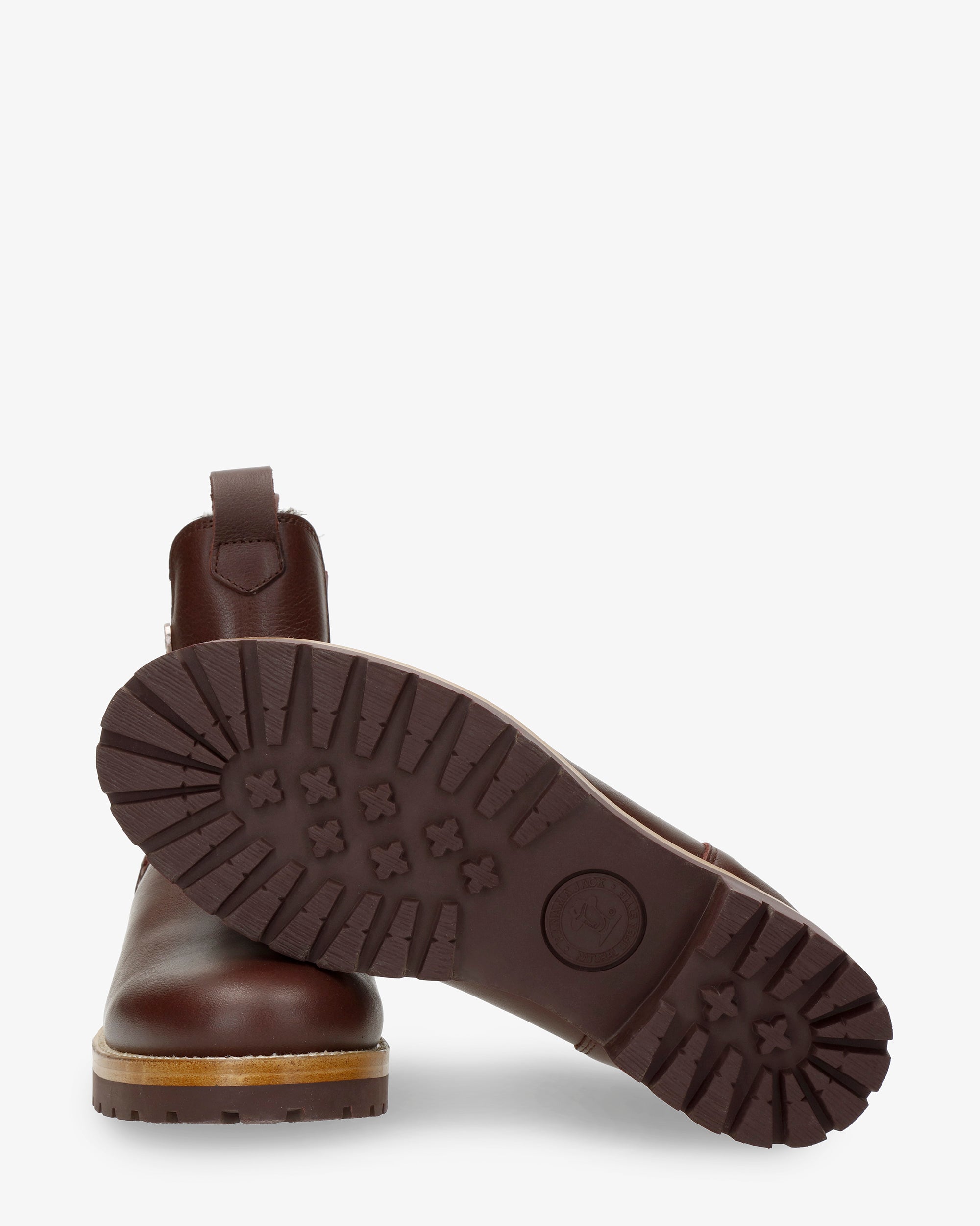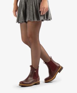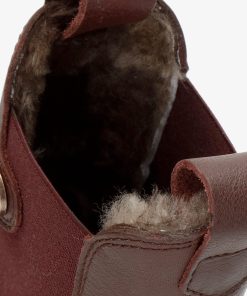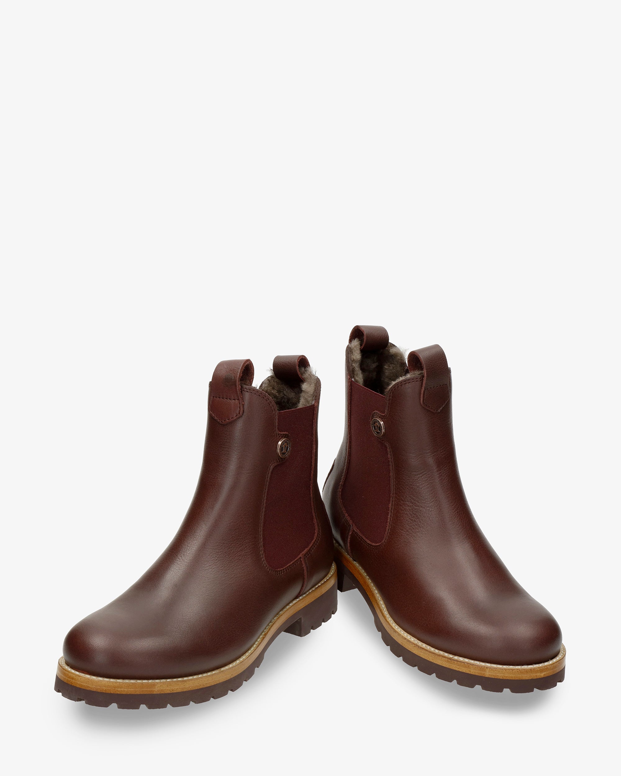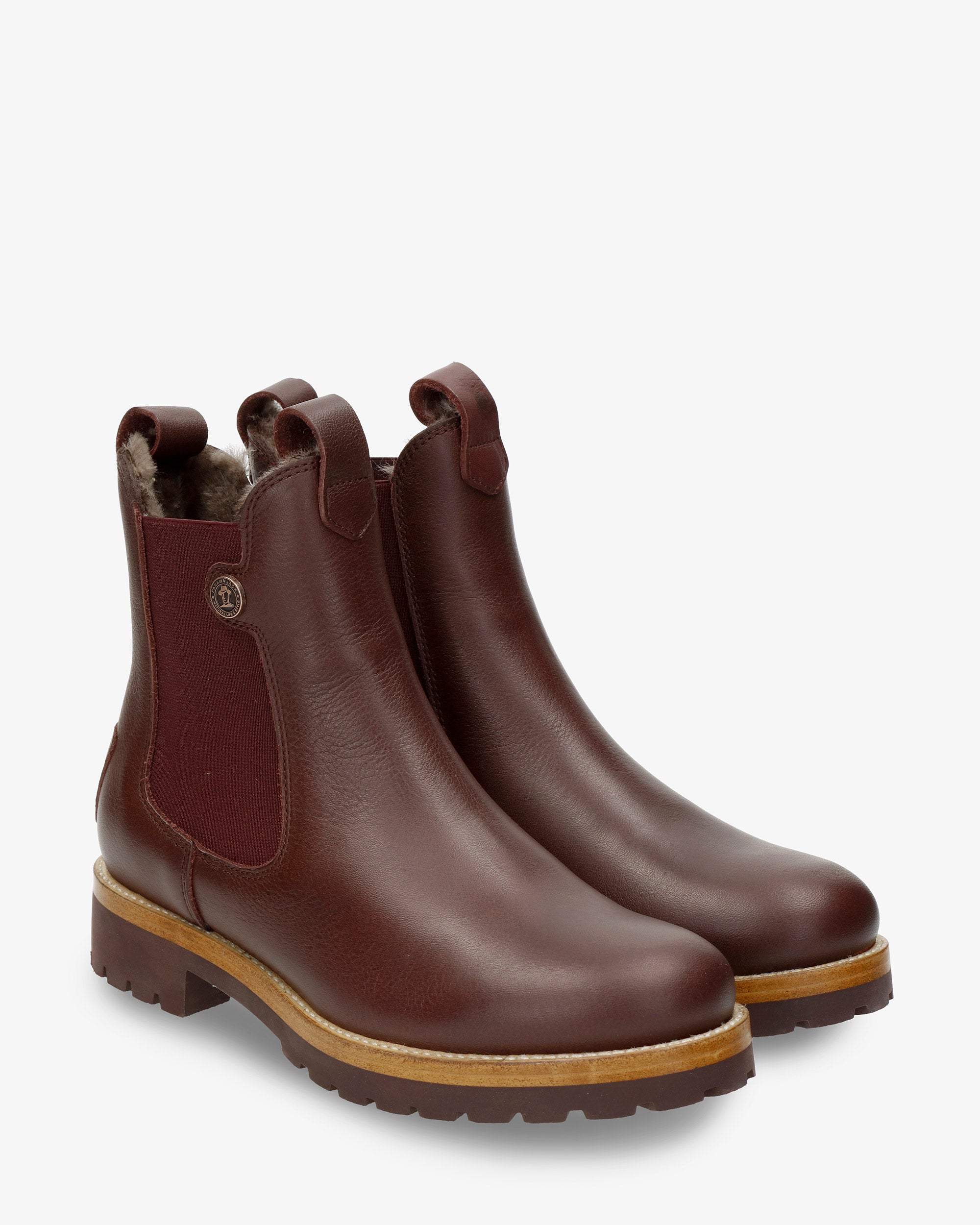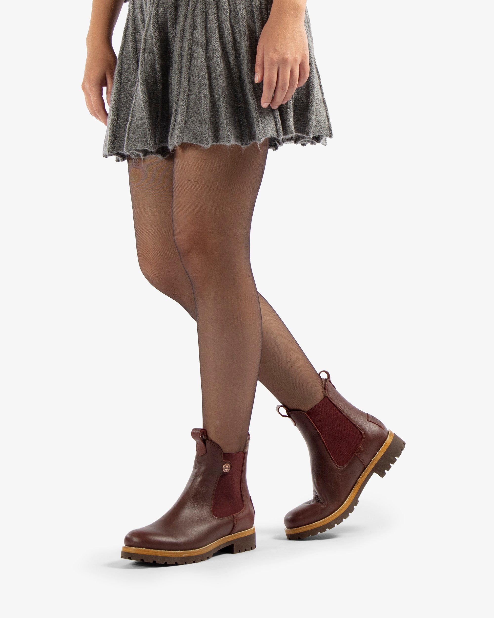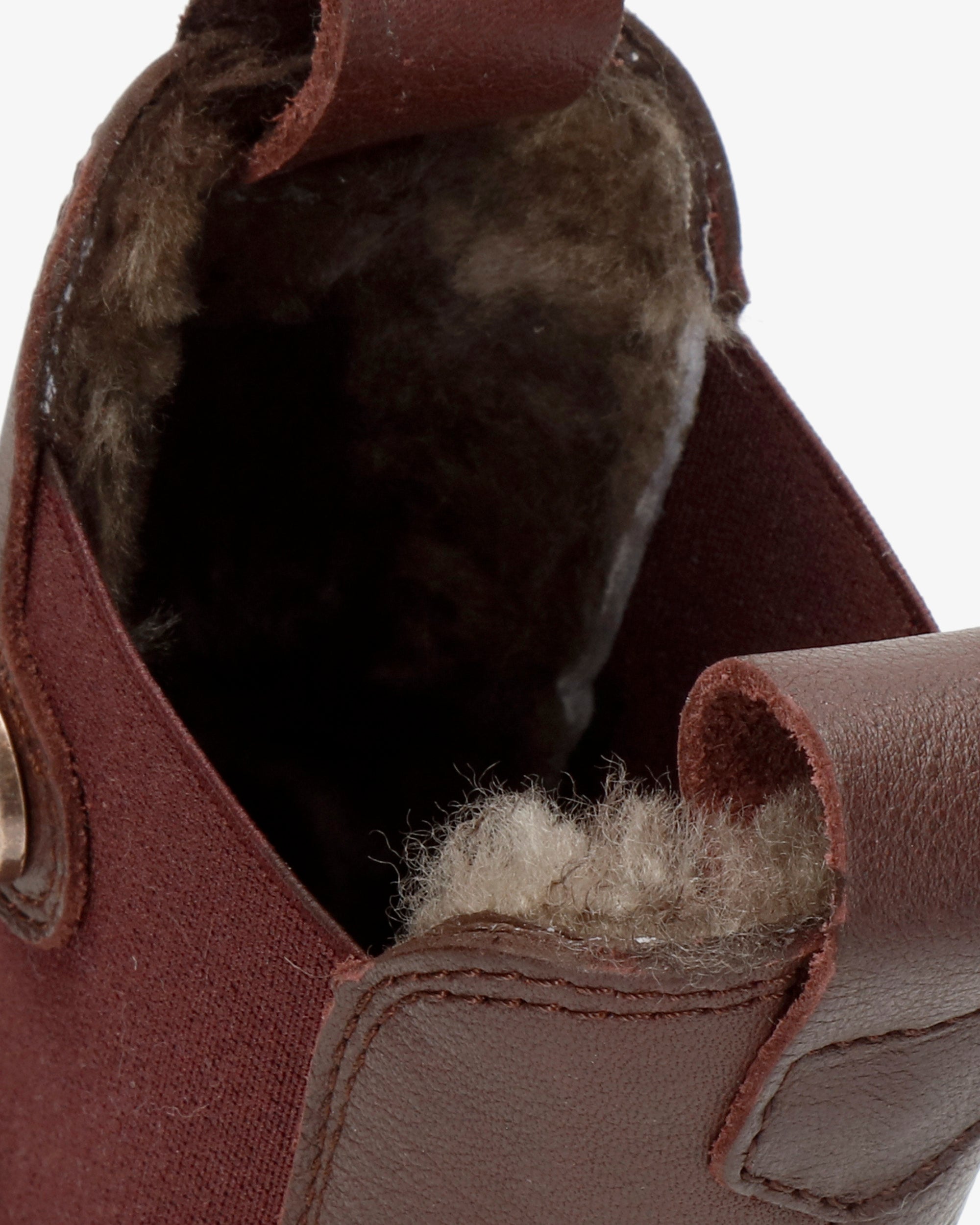 Bota de mujer plana. Piel Napa Burdeos WATERPROOF. Forro interior de Pelo natural. Plantilla anatómica extraíble. Suela de caucho natural, flexible y resistente. Altura caña: 14,5 cm. Altura tacón: 4 cm. 100% Hecho en España.