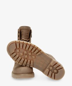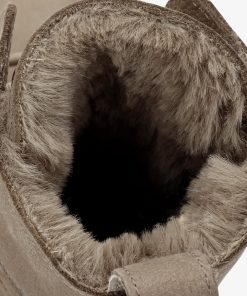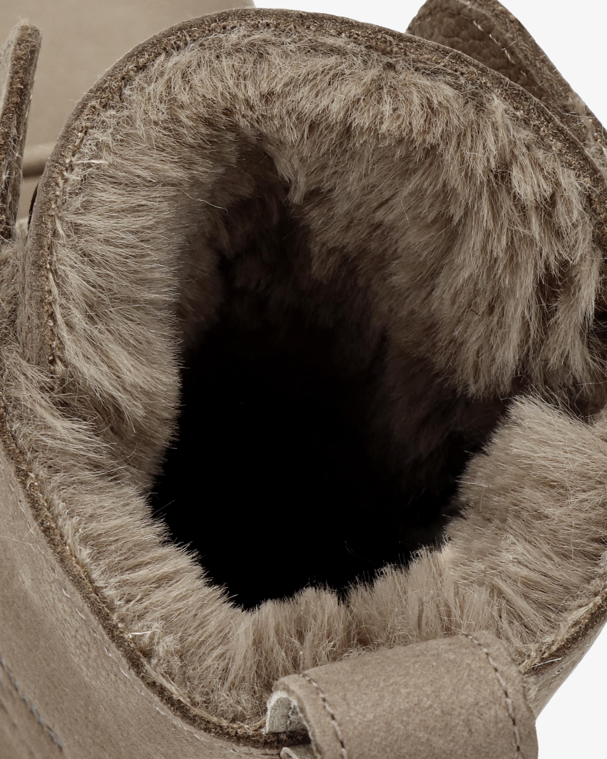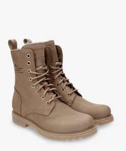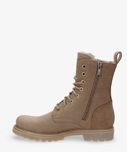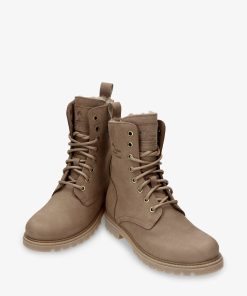 Bota de mujer plana. Piel Nobuck Taupe WATERPROOF. Cierre de cordones y cremallera. Forro interior de Pelo. Plantilla anatómica extraíble. Suela de caucho natural, flexible y resistente. Altura caña: 16,5 cm. Altura tacón: 4 cm. 100% Hecho en España.