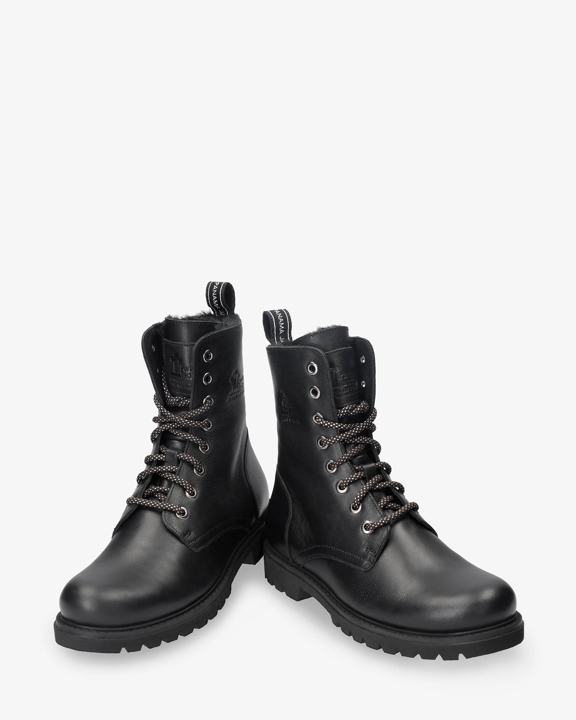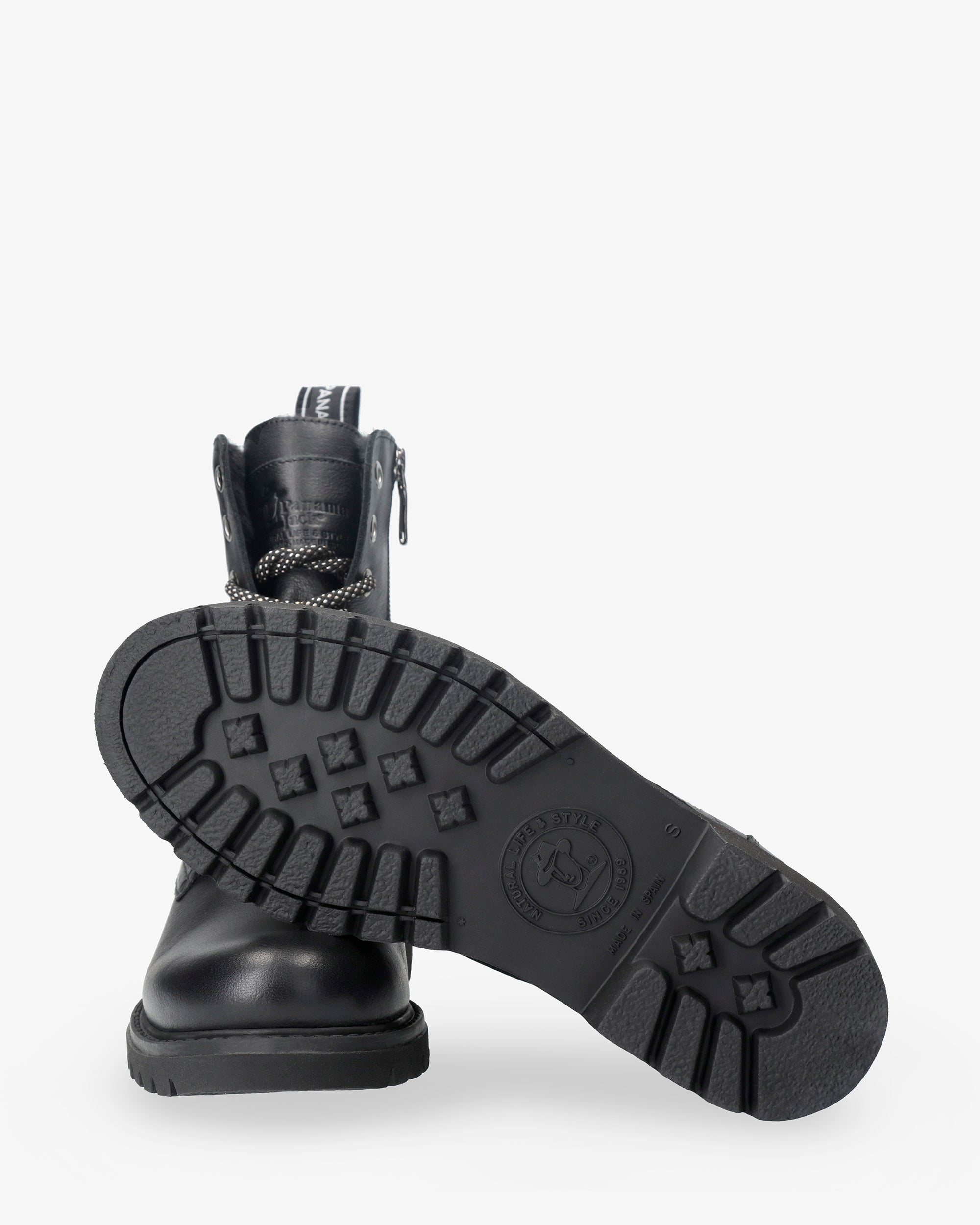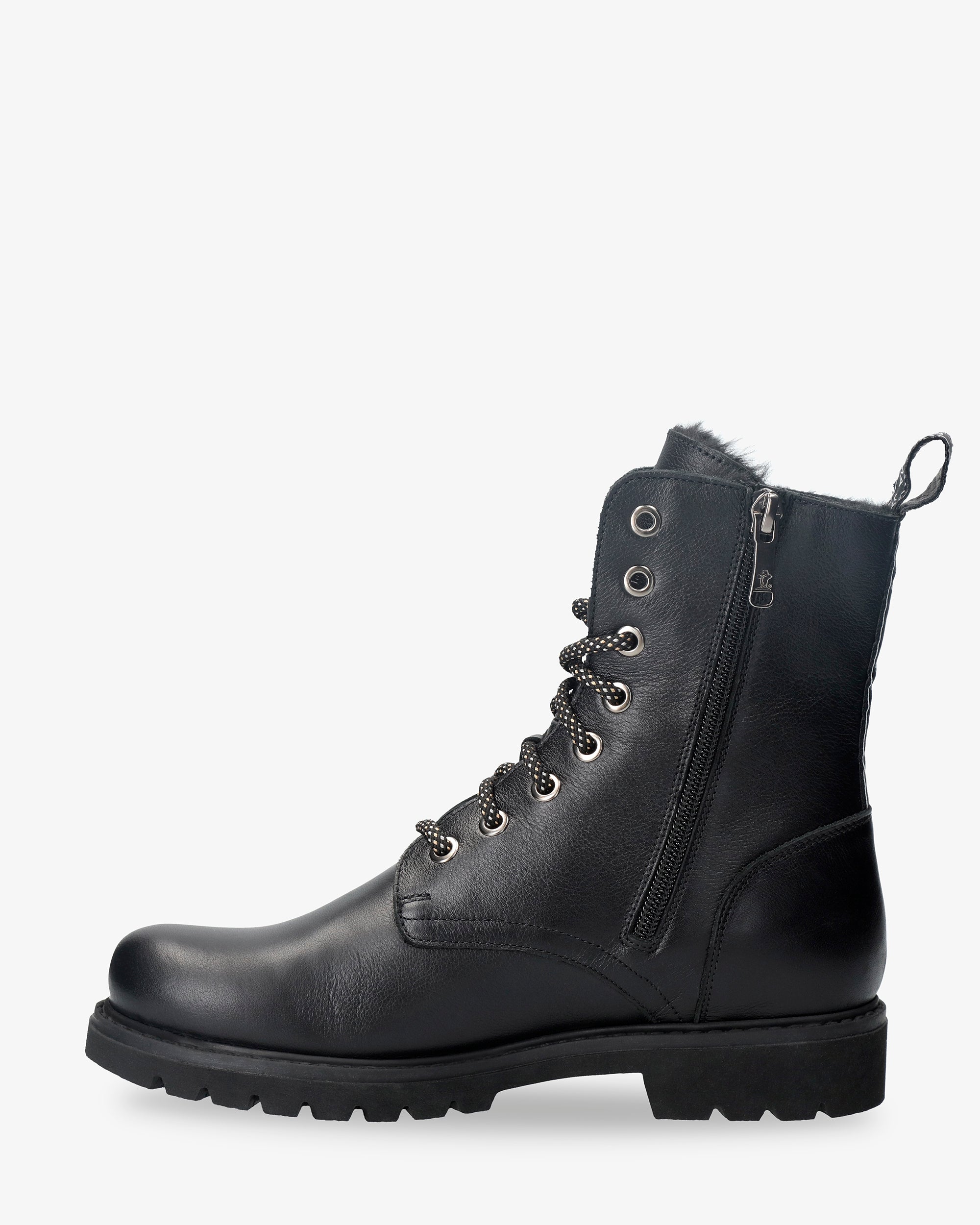 Bota de mujer plana. Piel Napa Negro WATERPROOF. Cierre de cordones y cremallera. Forro interior de Pelo natural. Plantilla anatómica extraíble. Suela de caucho natural, flexible y resistente. Altura caña: 16,5 cm. Altura tacón: 4 cm. 100% Hecho en España.
