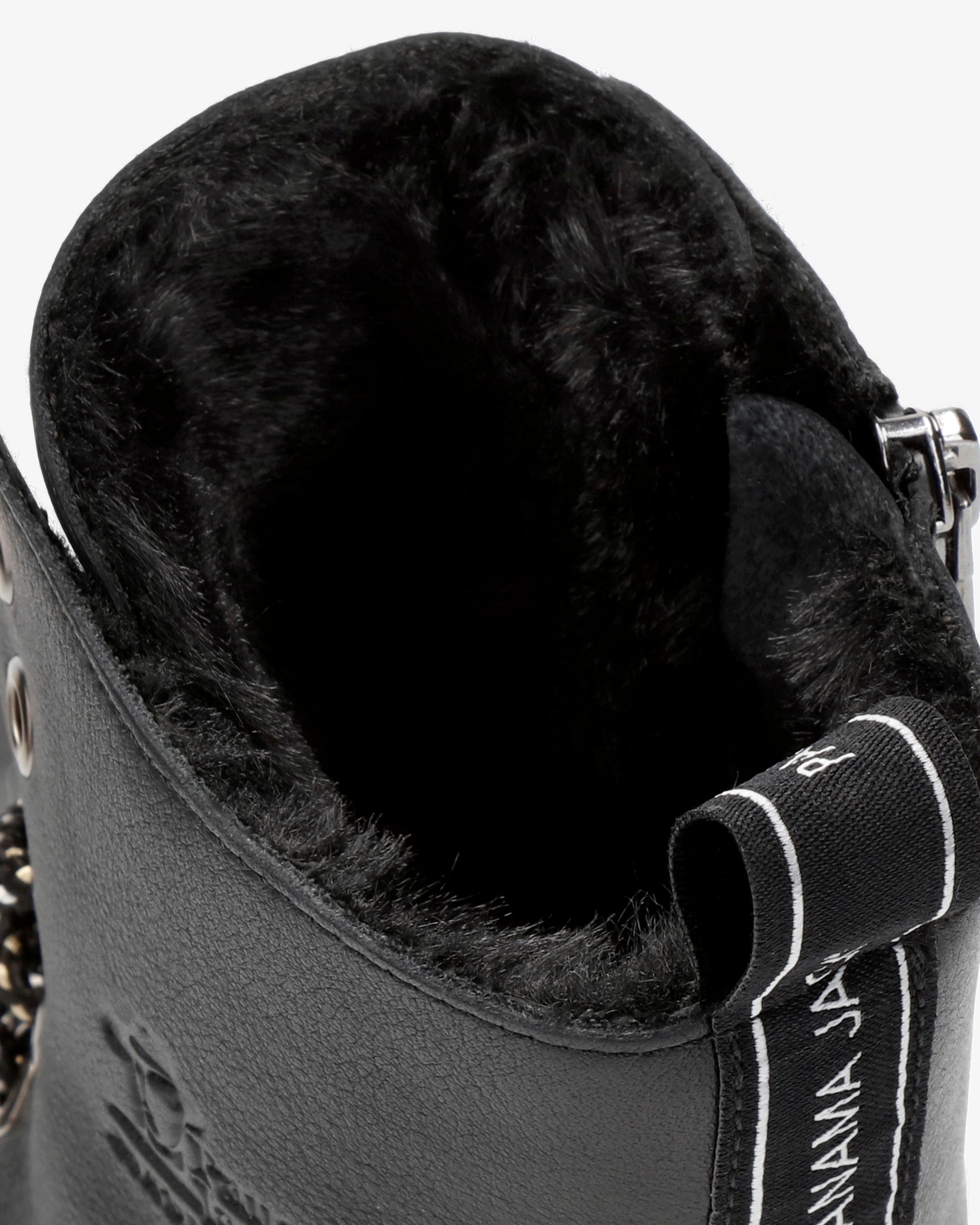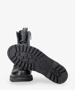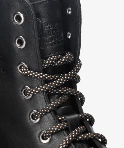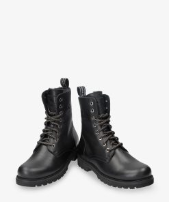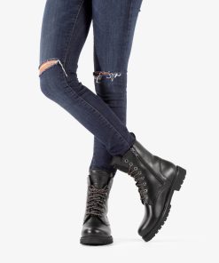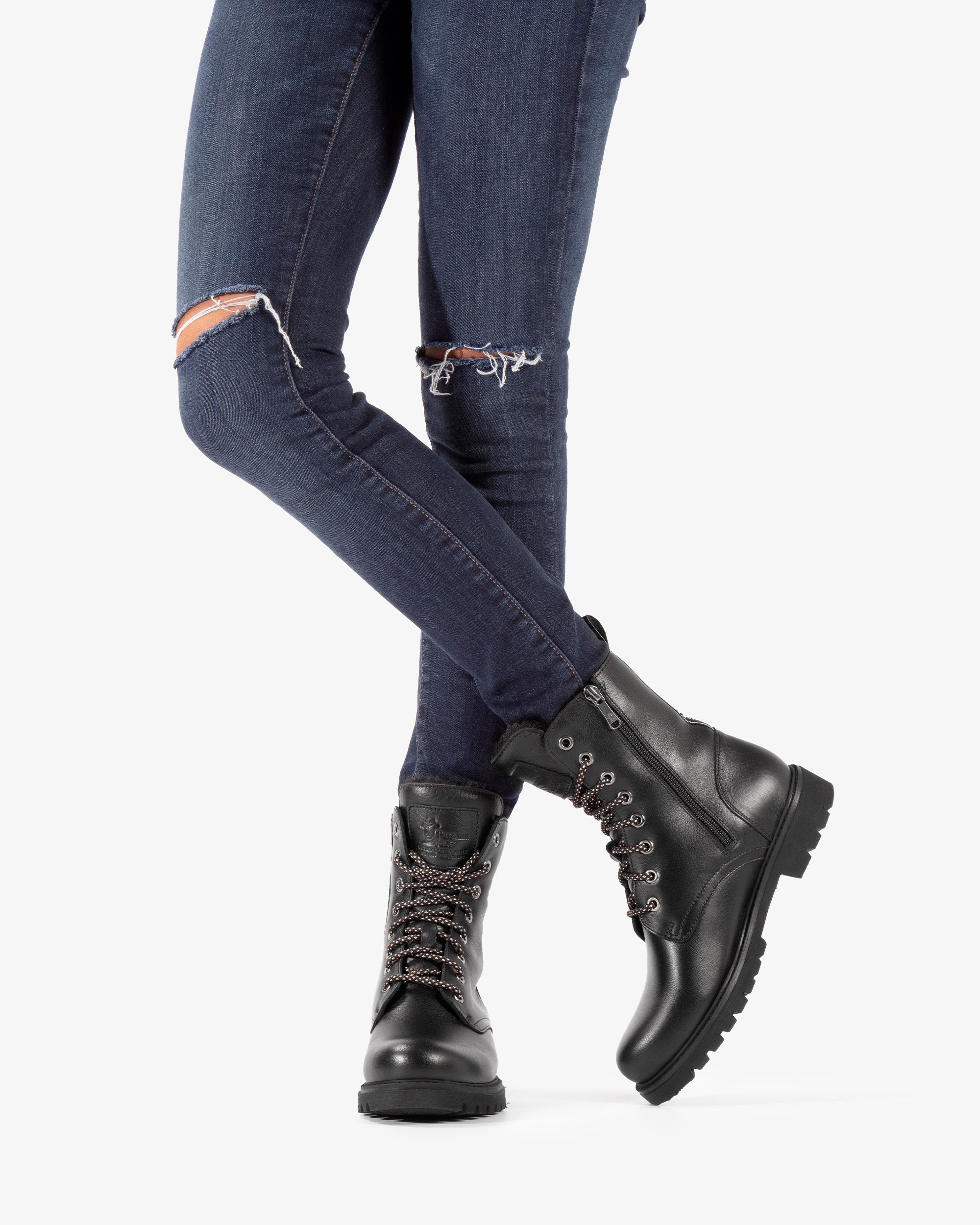 Bota de mujer plana. Piel Napa Negro WATERPROOF. Cierre de cordones y cremallera. Forro interior de Pelo natural. Plantilla anatómica extraíble. Suela de caucho natural, flexible y resistente. Altura caña: 16,5 cm. Altura tacón: 4 cm. 100% Hecho en España.