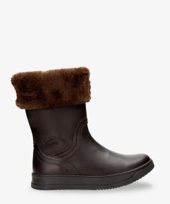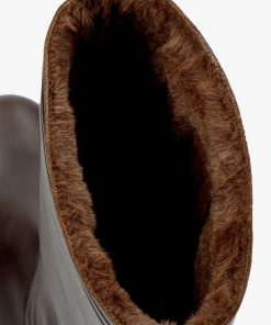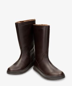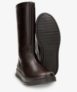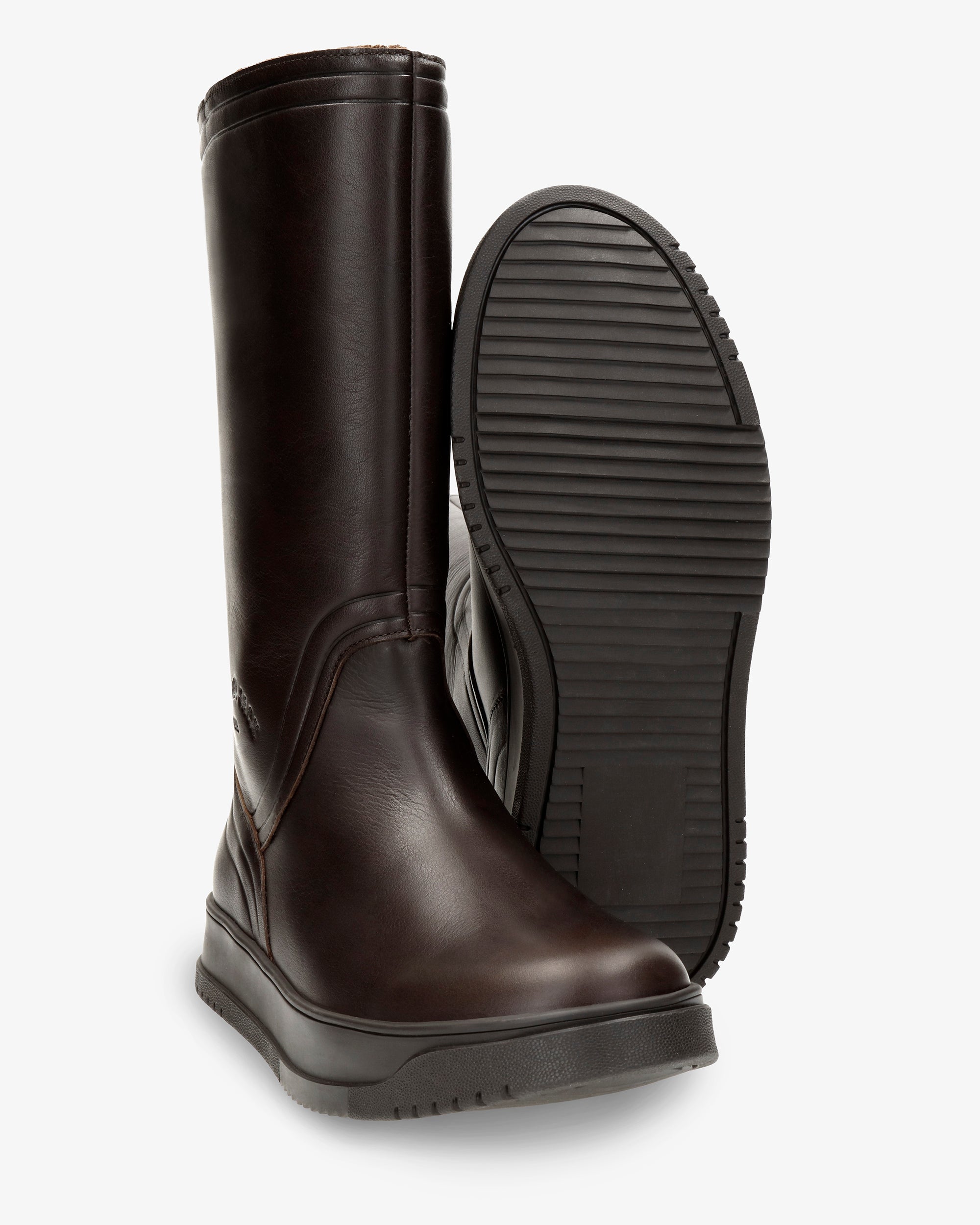 Bota de mujer plana. Piel Napa marrón WATERPROOF. Forro interior de Pelo. Plantilla anatómica extraíble. Suela de goma, flexible y resistente. Altura caña: 27 cm. Altura tacón: 4.3 cm. 100% Hecho en España.