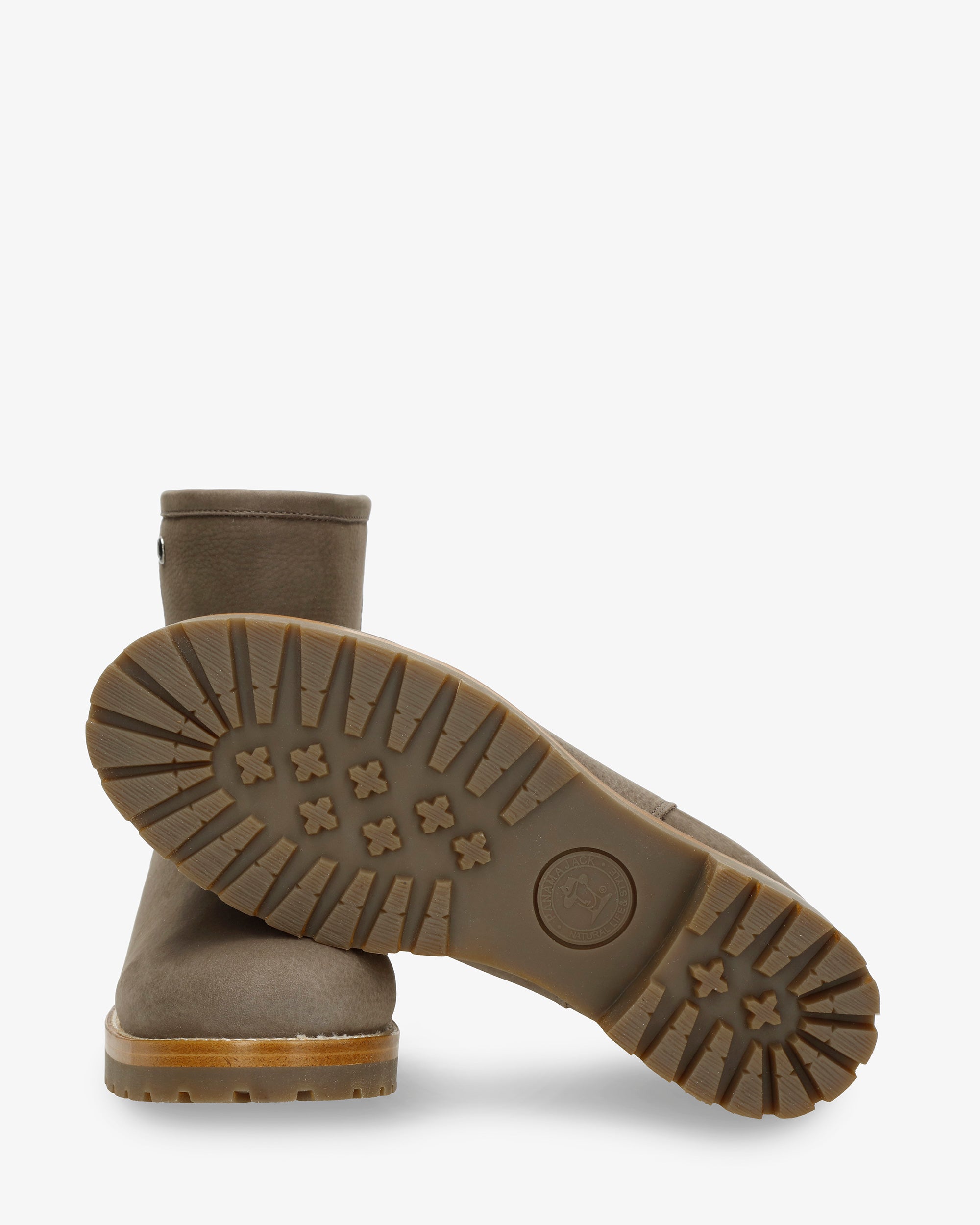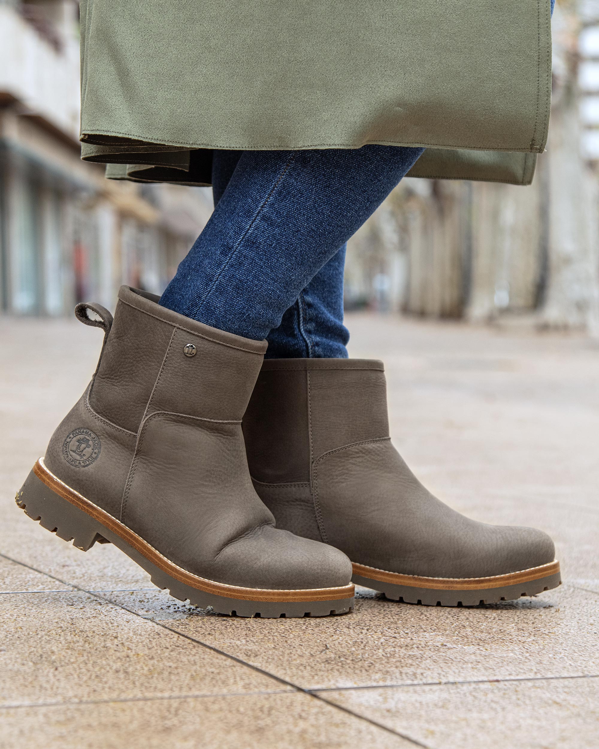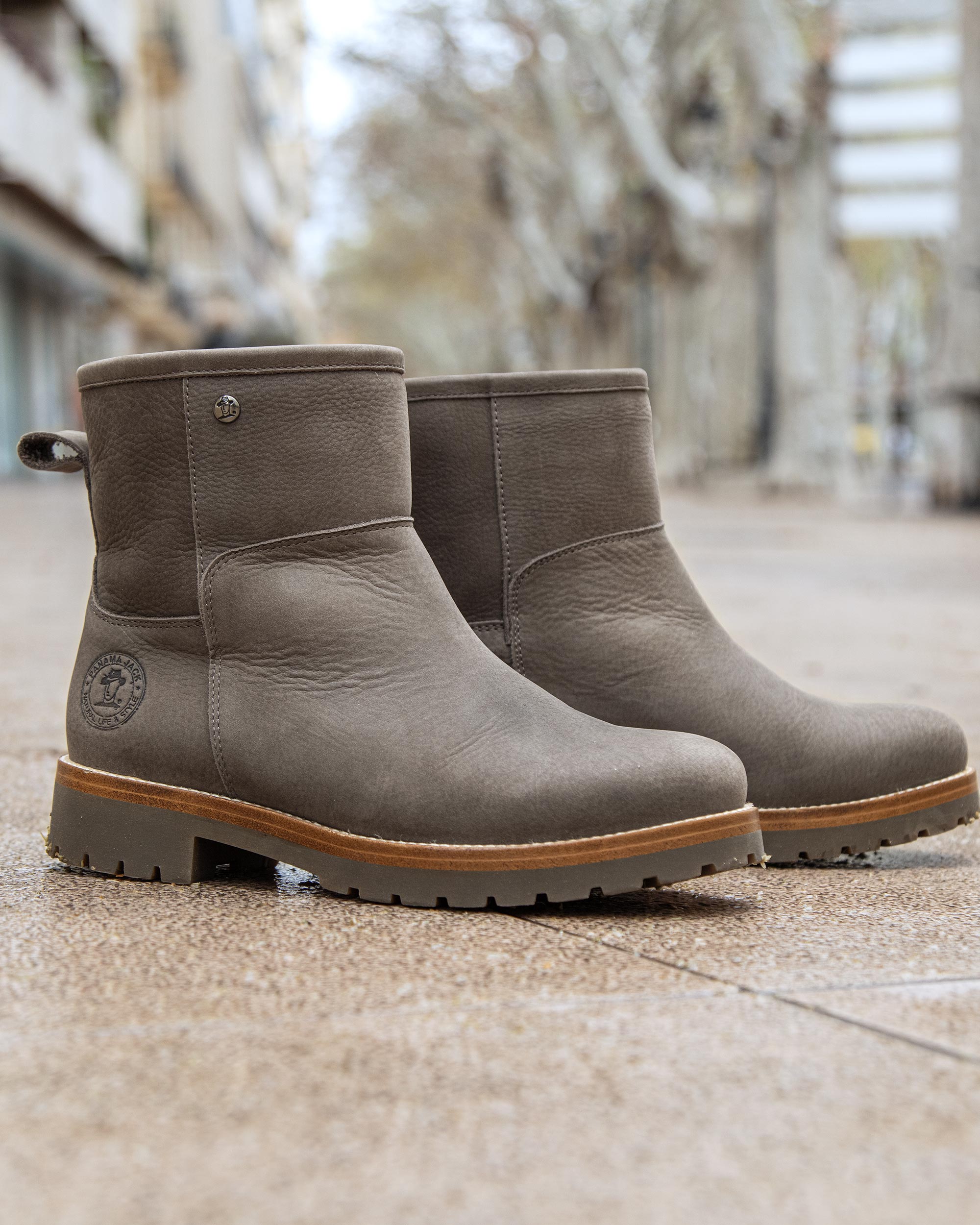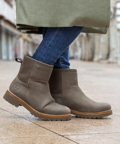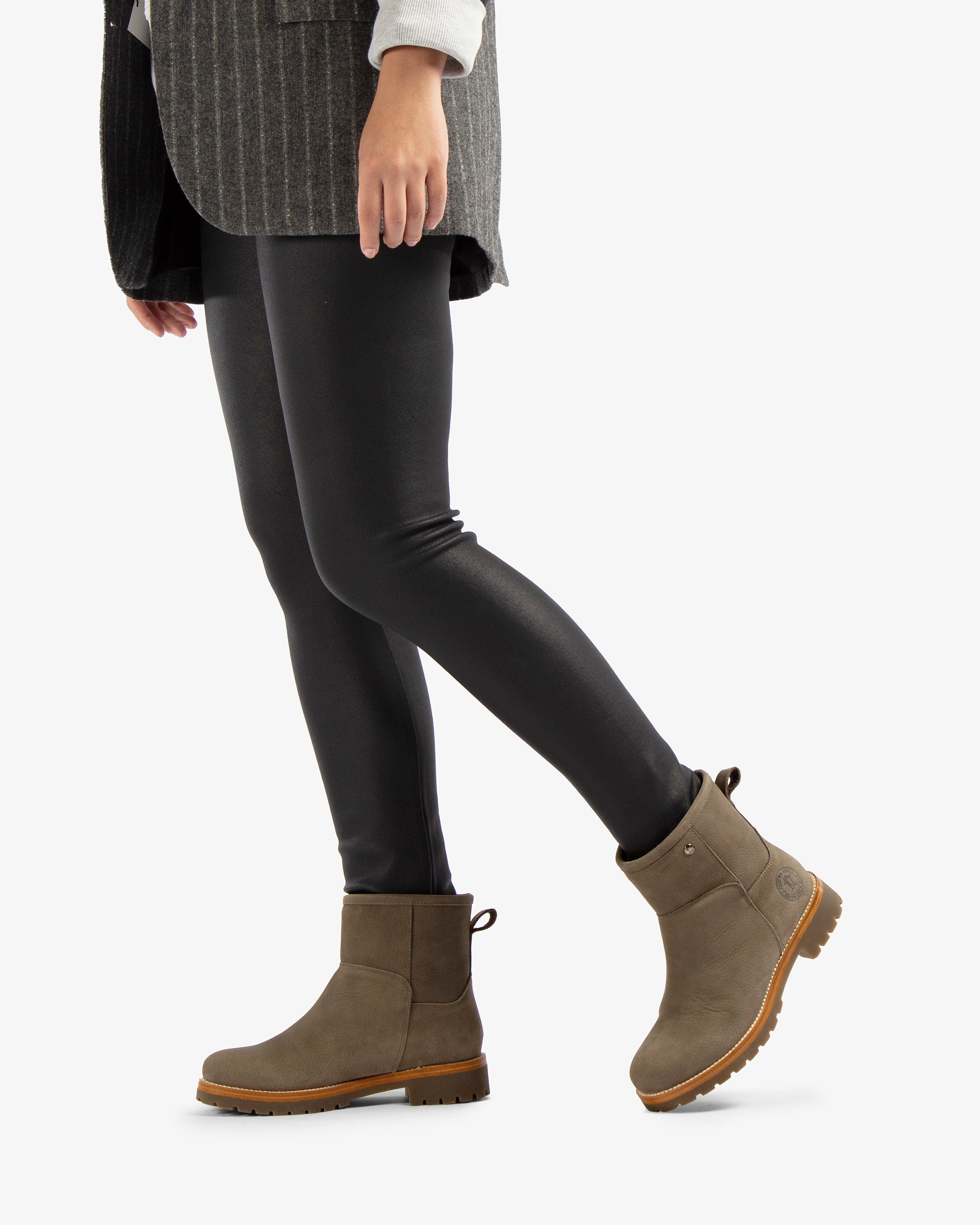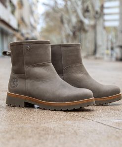Bota de mujer plana. Piel Nobuck Gris WATERPROOF. Forro interior de Pelo. Plantilla anatómica extraíble. Suela de caucho natural, flexible y resistente. Altura caña: 14 cm. Altura tacón: 4 cm. 100% Hecho en España.
