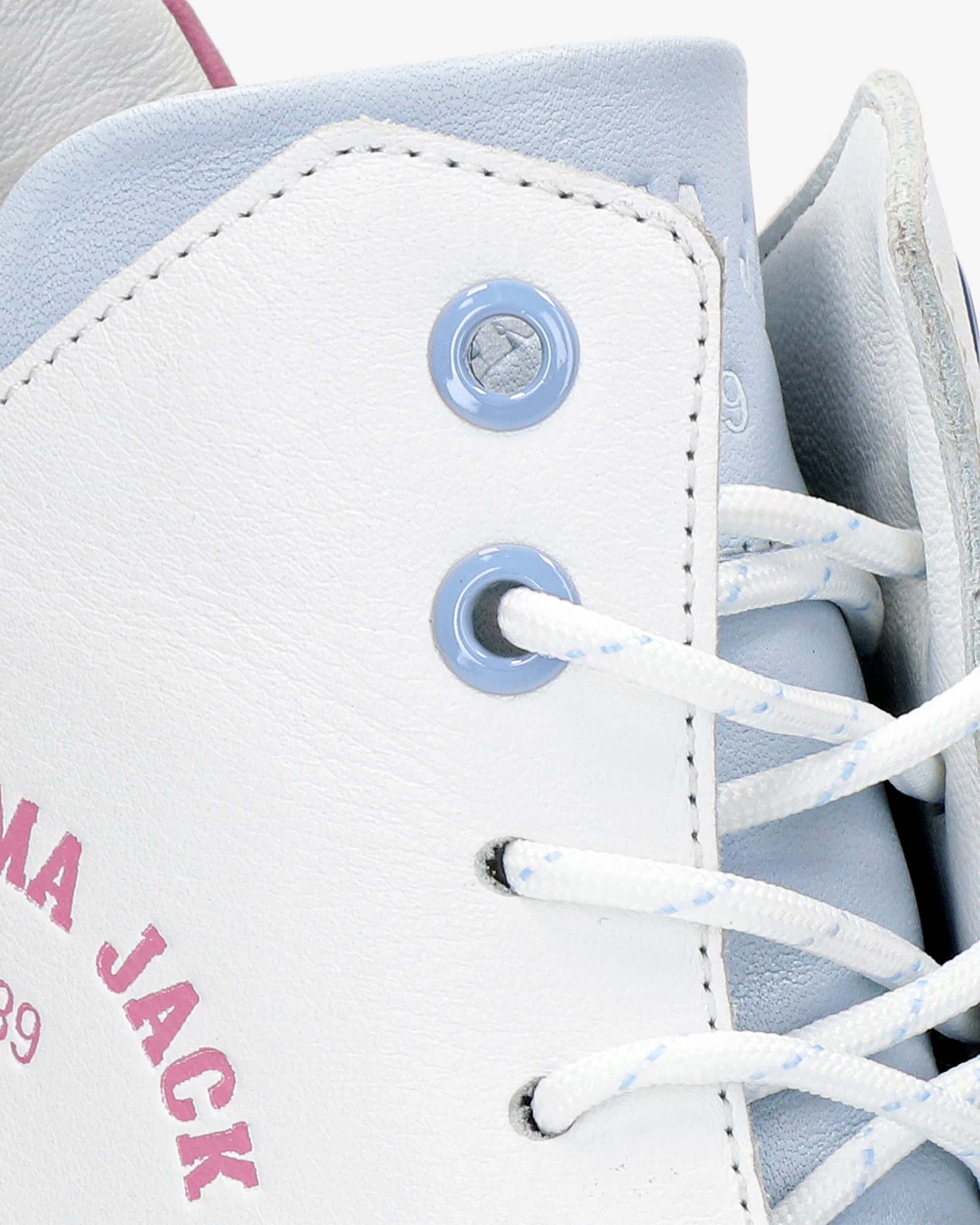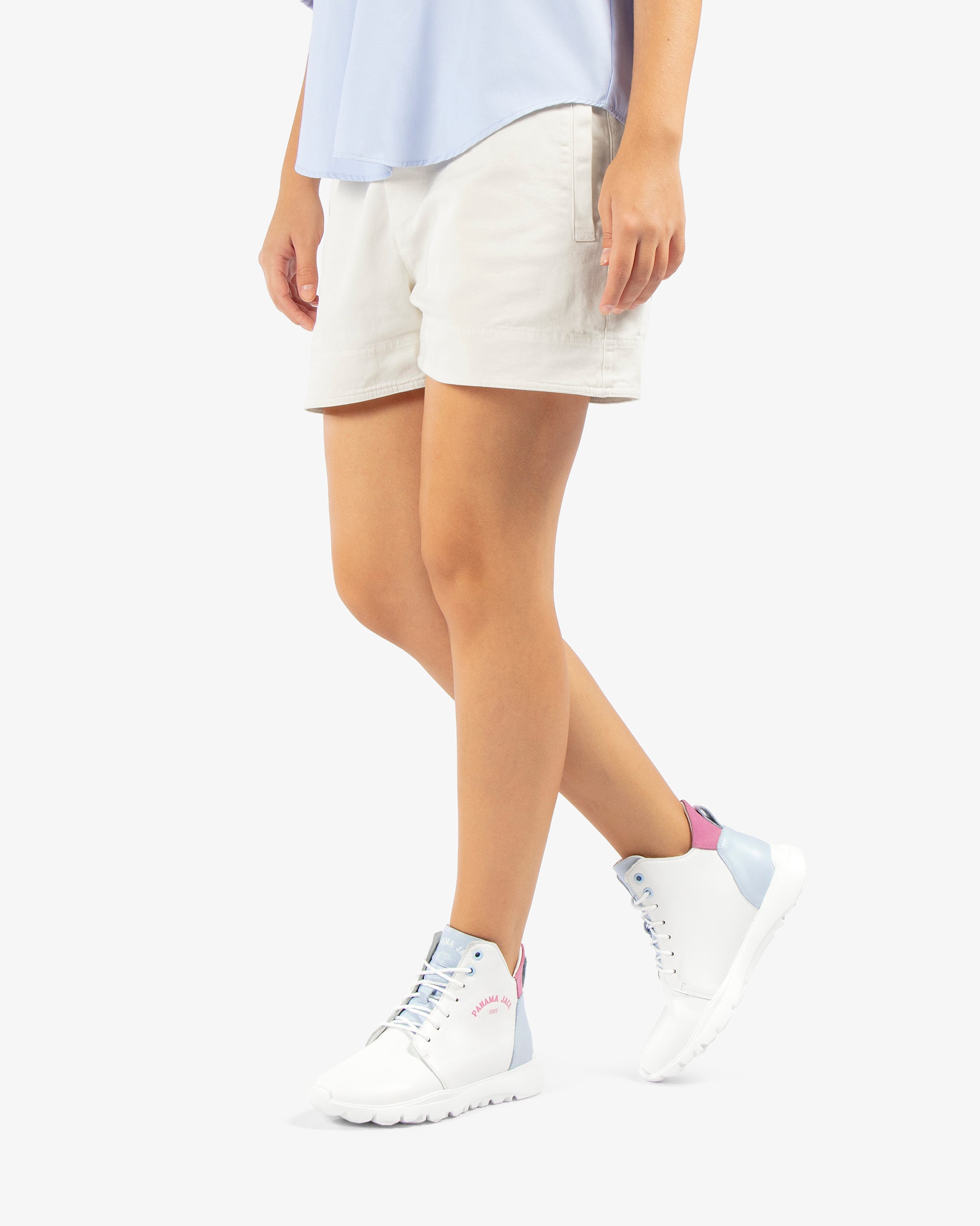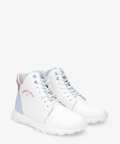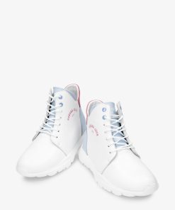 Sneakers de mujer. Piel Napa Blanco. Cierre de cordones. Forro interior de Piel. Plantilla anatómica extraíble. Suela de EVA, ligero, flexible y resistente. Altura caña: 8,5 cm. Altura tacón: 5 cm. 100% Hecho en España.