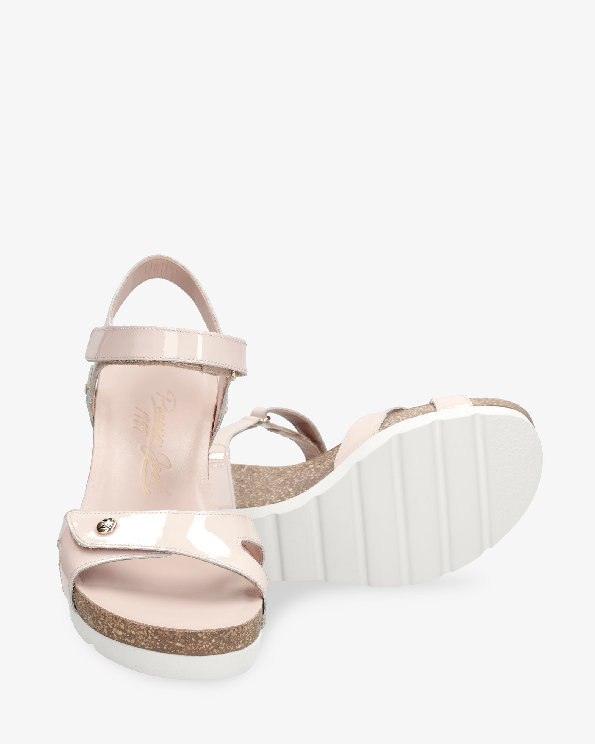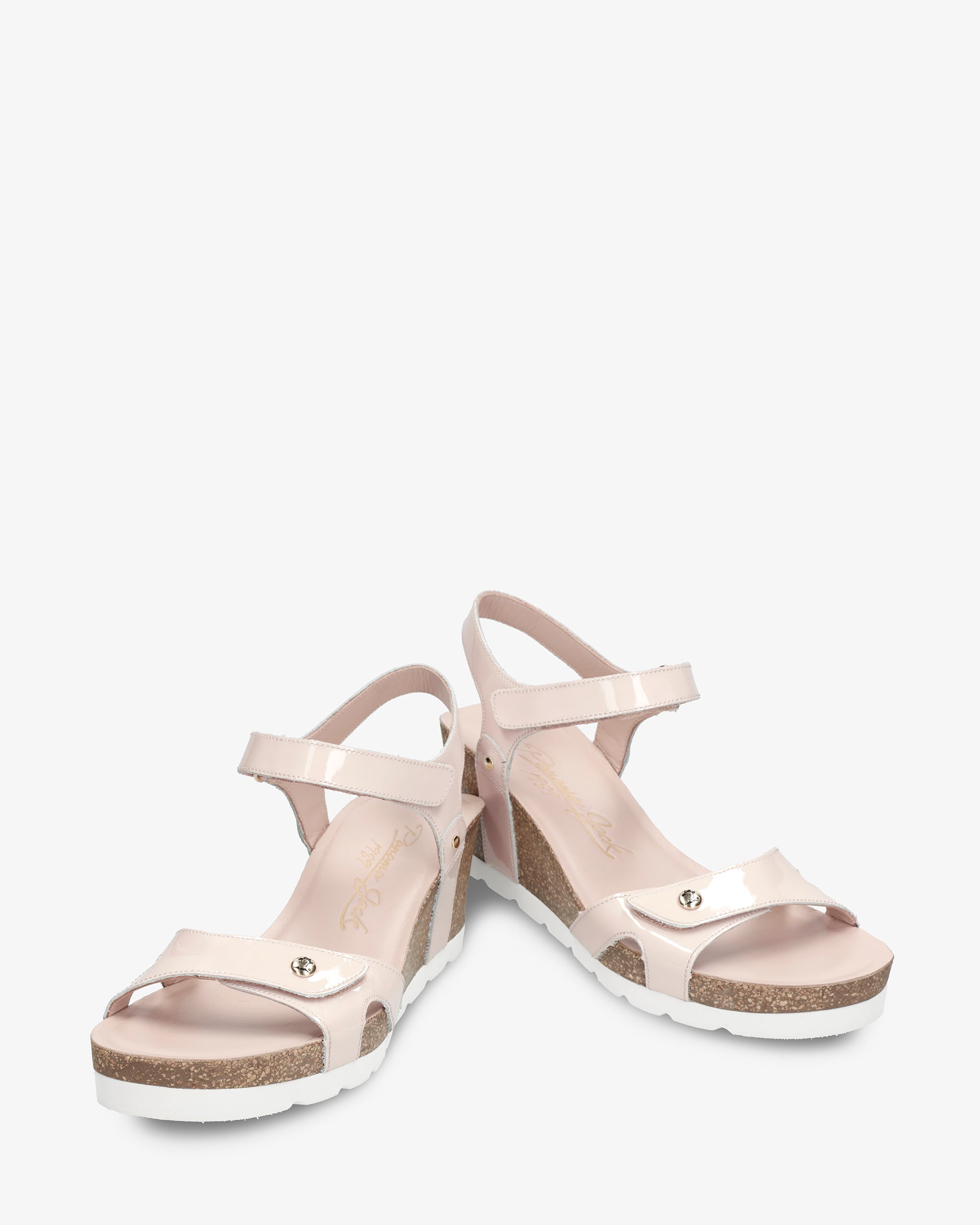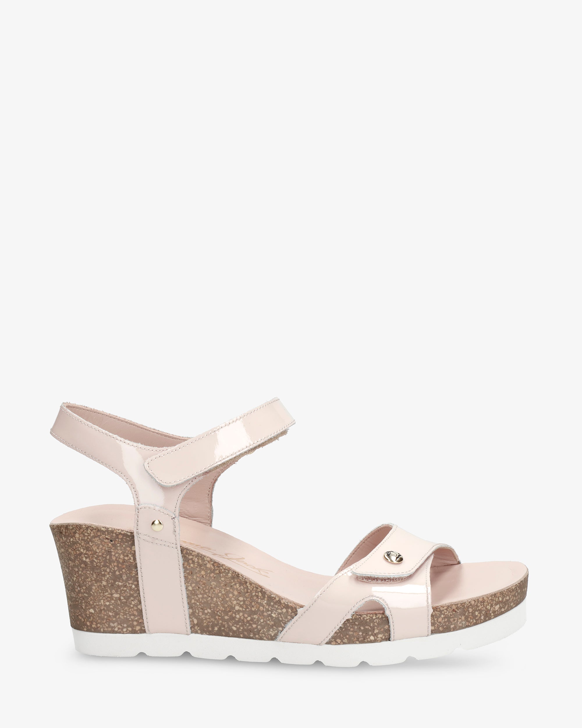 Sandalia de mujer con cuña. Piel Charol Rosa. Cierre de velcro. Forro interior de Piel. Plantilla anatómica. Suela de corcho y EVA, ligero, flexible y resistente. Altura tacón: 6.5 cm. 100% Hecho en España.