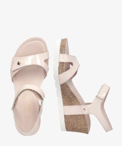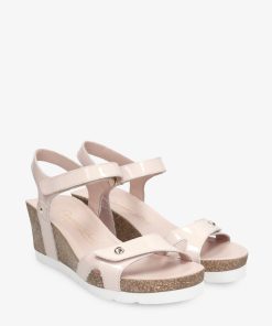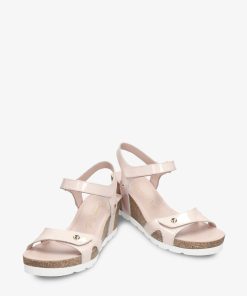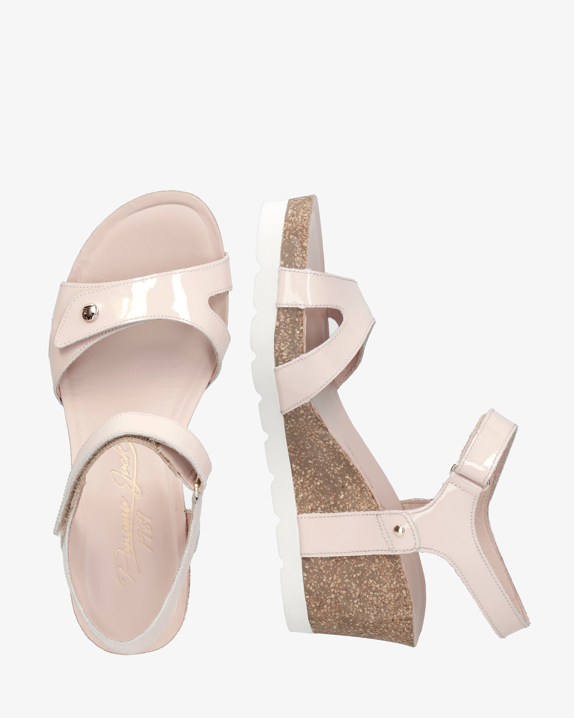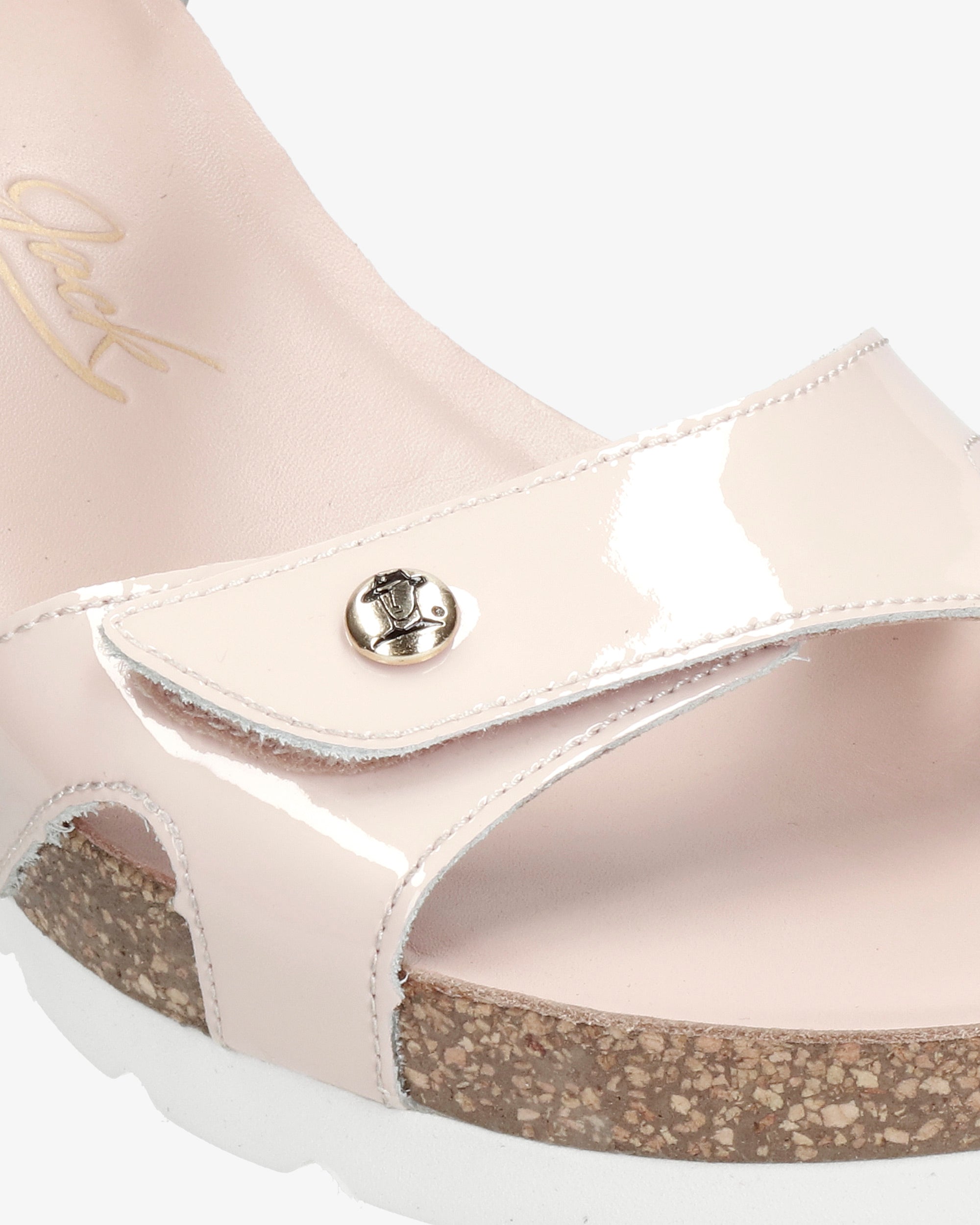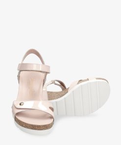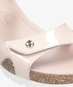 Sandalia de mujer con cuña. Piel Charol Rosa. Cierre de velcro. Forro interior de Piel. Plantilla anatómica. Suela de corcho y EVA, ligero, flexible y resistente. Altura tacón: 6.5 cm. 100% Hecho en España.