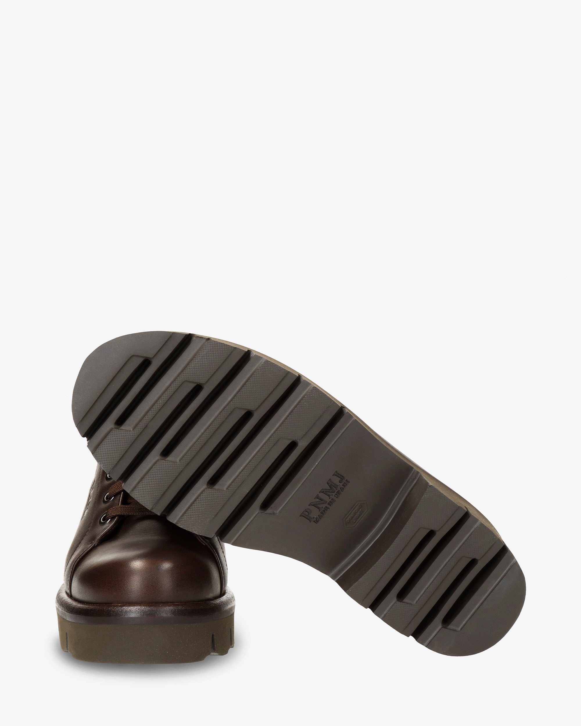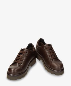 Zapato de mujer con tacón. Piel Napa marrón WATERPROOF. Cierre de cordones. Forro interior de Piel. Plantilla anatómica extraíble. Suela de EVA, ligero, flexible y resistente. Altura tacón: 5.4 cm. 100% Hecho en España.
