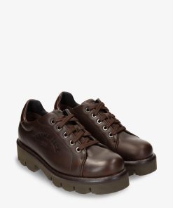 Zapato de mujer con tacón. Piel Napa marrón WATERPROOF. Cierre de cordones. Forro interior de Piel. Plantilla anatómica extraíble. Suela de EVA, ligero, flexible y resistente. Altura tacón: 5.4 cm. 100% Hecho en España.