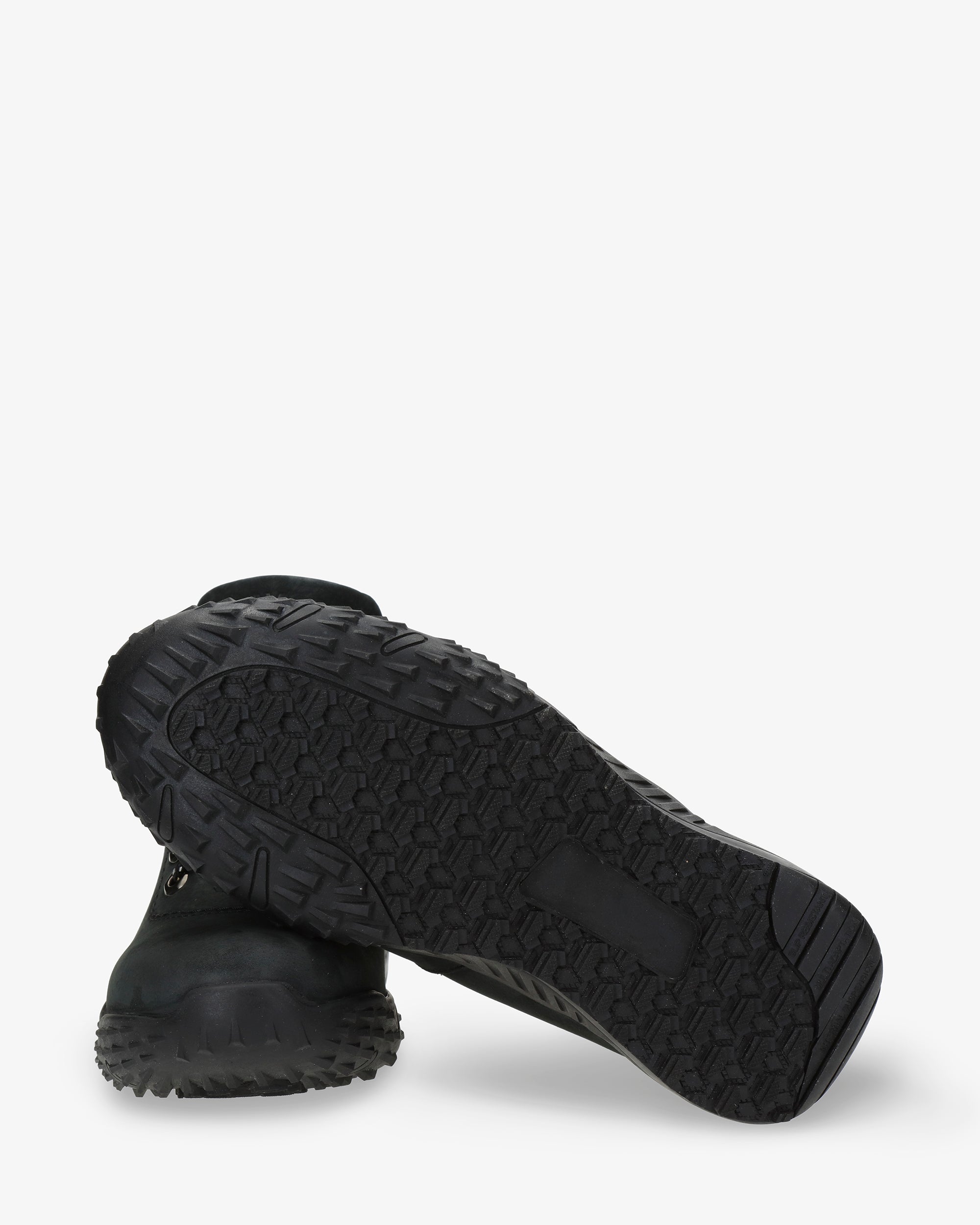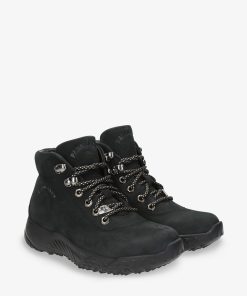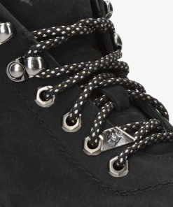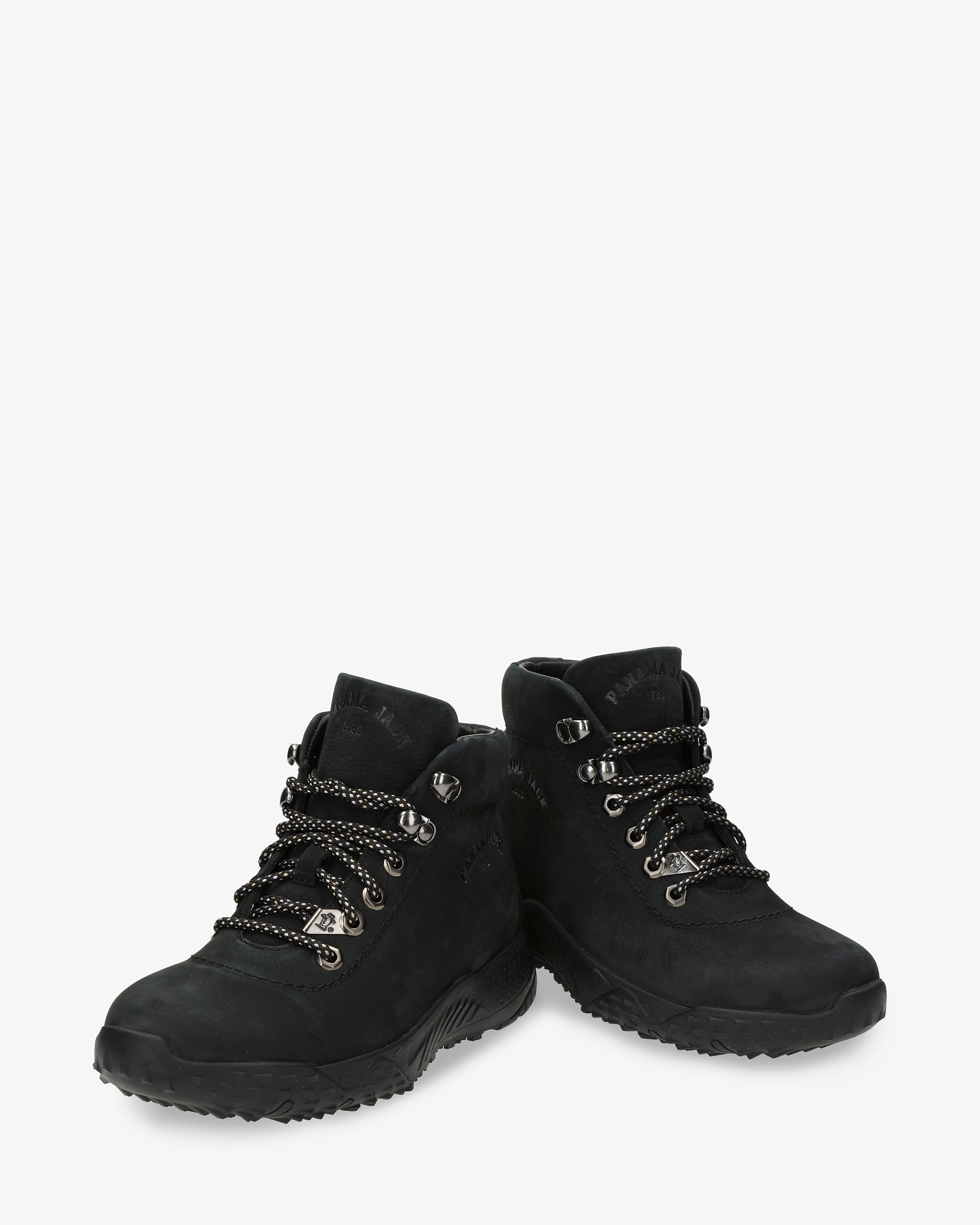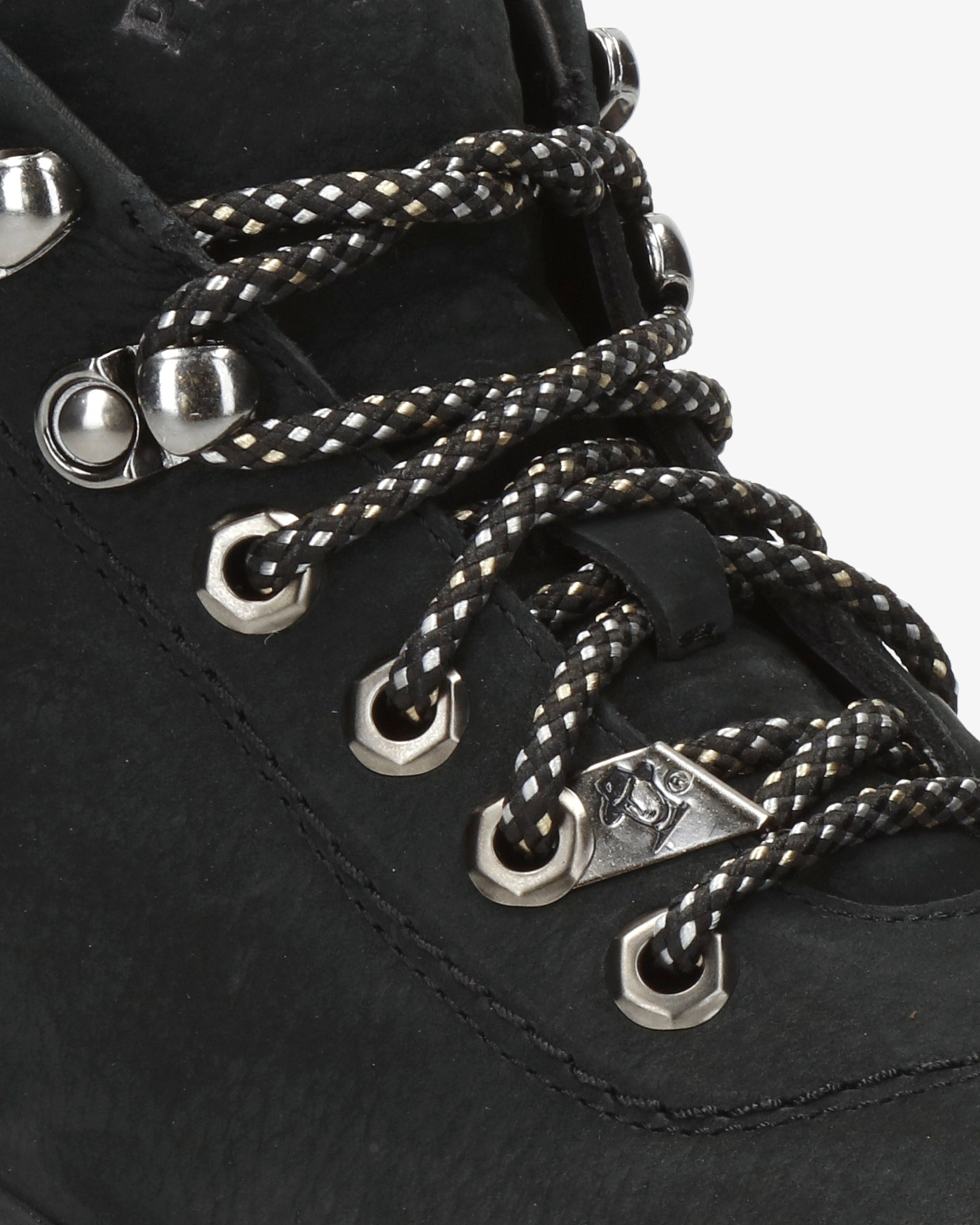 Botín de mujer plano. Piel Nobuck Negro WATERPROOF. Cierre de cordones. Forro interior de Piel. Plantilla anatómica extraíble. Suela de goma, flexible y resistente. Altura caña: 10 cm. Altura tacón: 5 cm. 100% Hecho en España.
