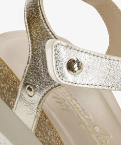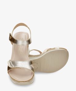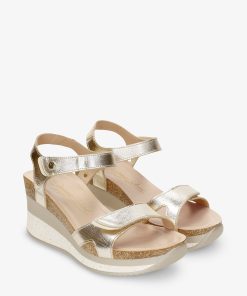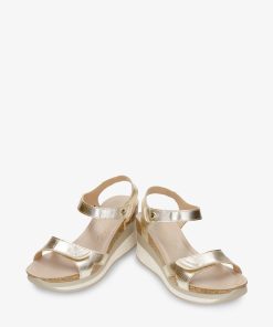 Sandalia de mujer con cuña. Piel Napa Oro. Cierre de velcro. Forro interior de Piel. Plantilla anatómica. Suela de corcho y poliuretano, flexible y resistente. Altura tacón: 7 cm. 100% Hecho en España.