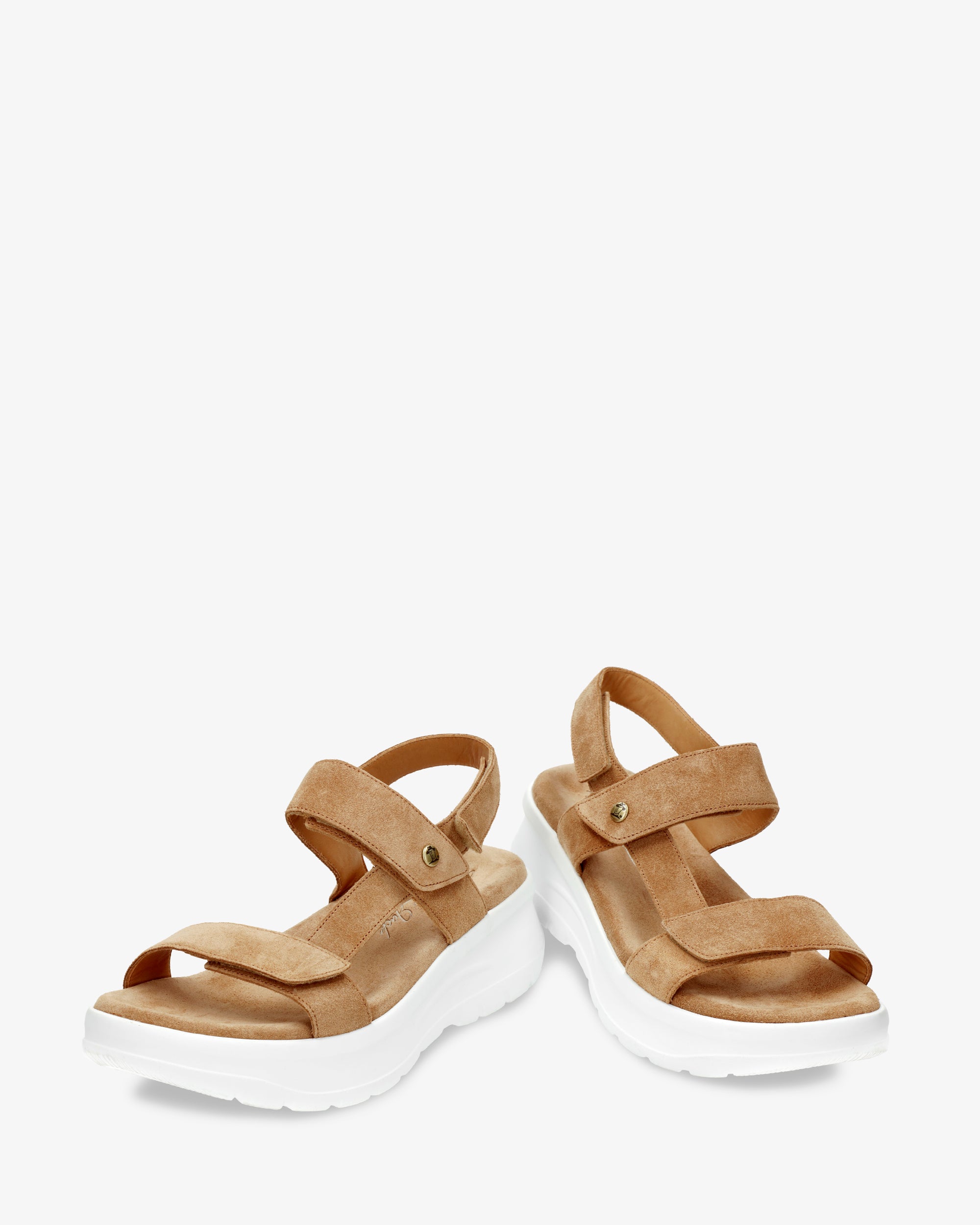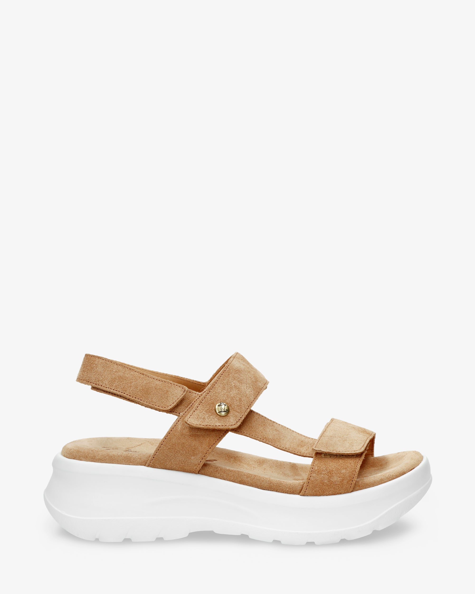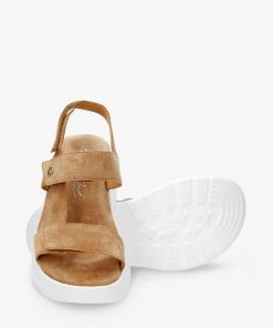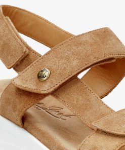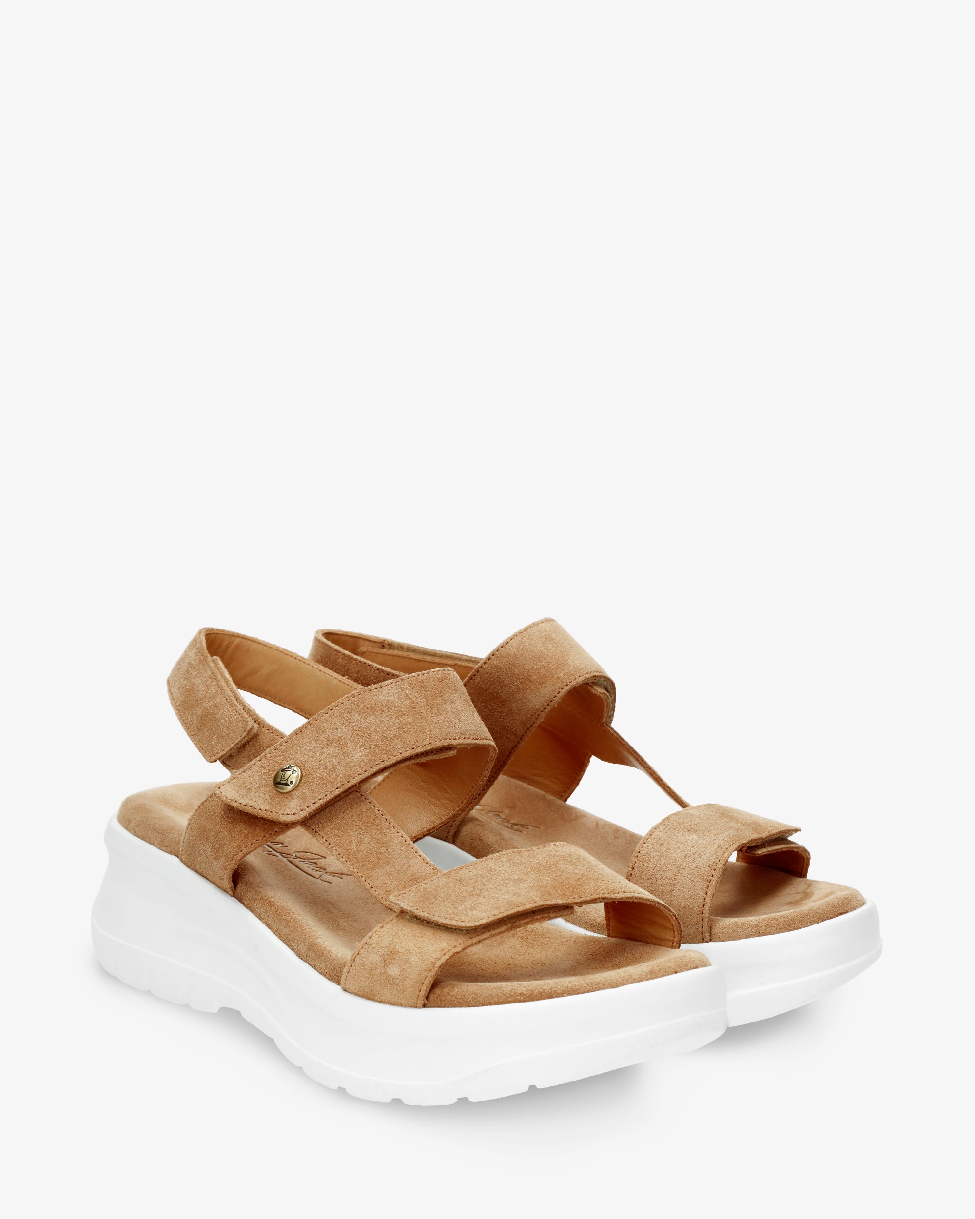 Sandalia de mujer con plataforma. Piel Velour Cuero. Cierre de velcro. Forro interior de Piel. Plantilla anatómica. Suela de poliuretano, flexible y resistente. Altura tacón: 6.5 cm. 100% Hecho en España.