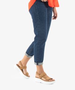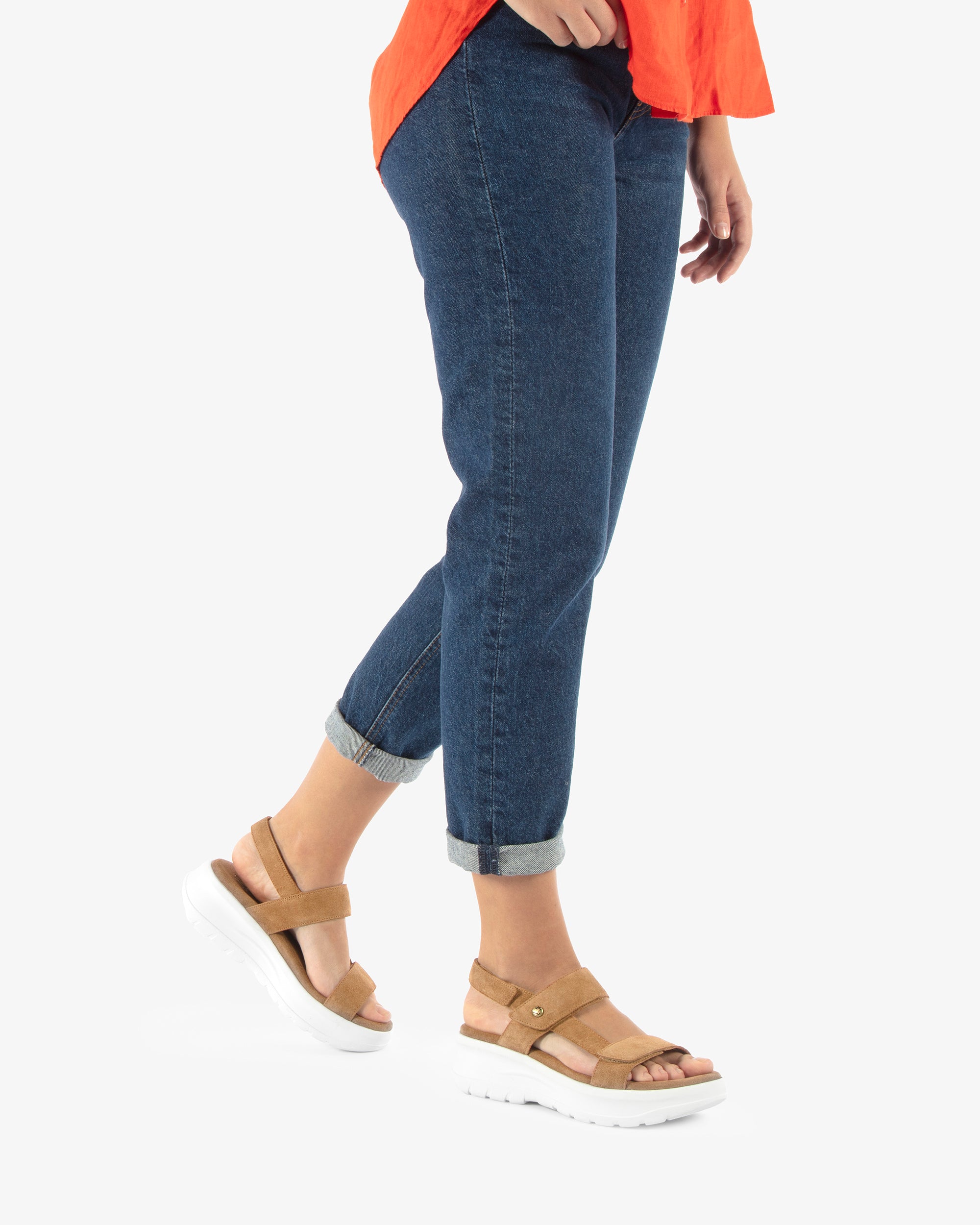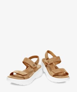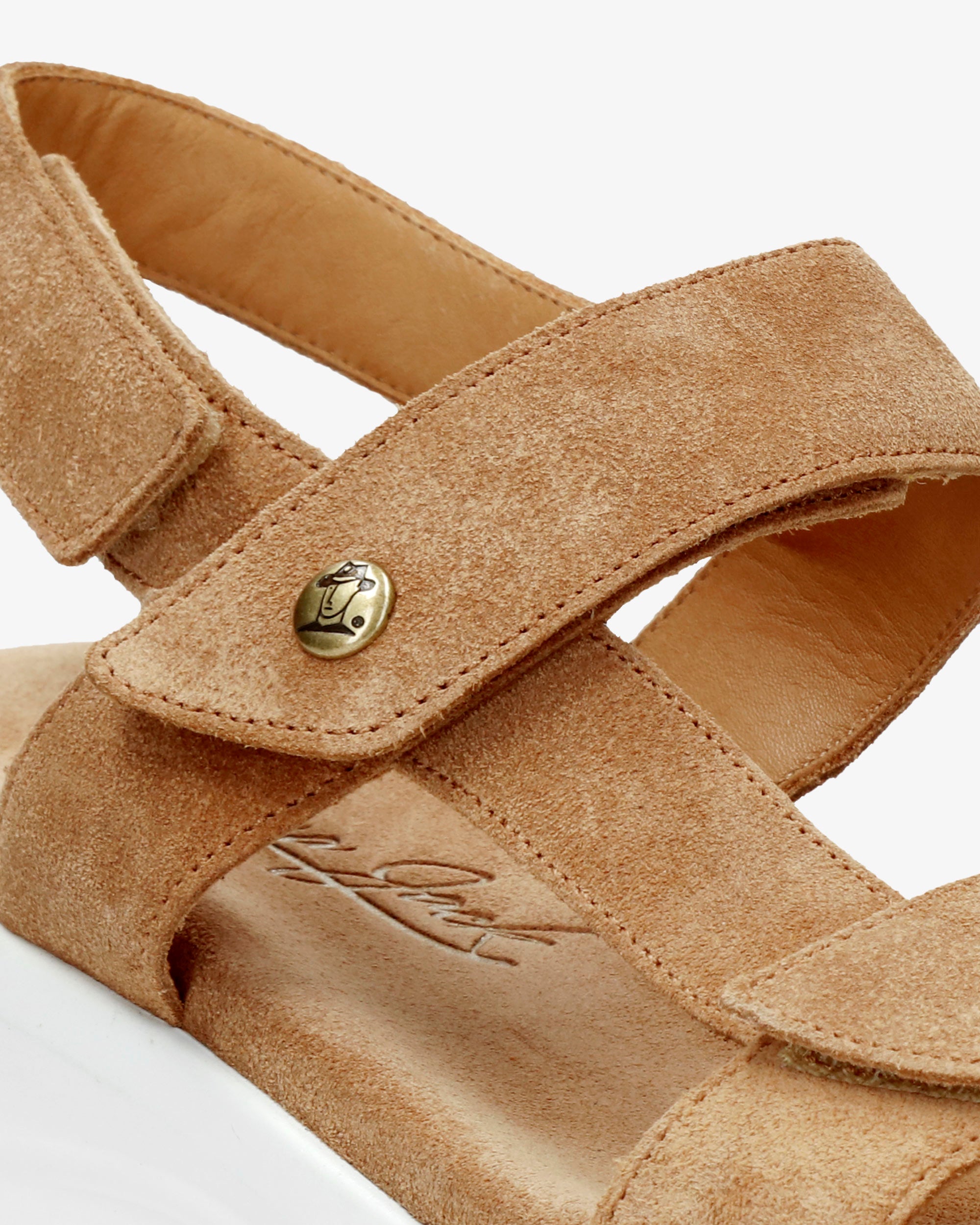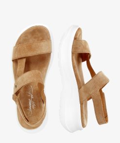 Sandalia de mujer con plataforma. Piel Velour Cuero. Cierre de velcro. Forro interior de Piel. Plantilla anatómica. Suela de poliuretano, flexible y resistente. Altura tacón: 6.5 cm. 100% Hecho en España.