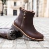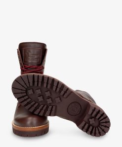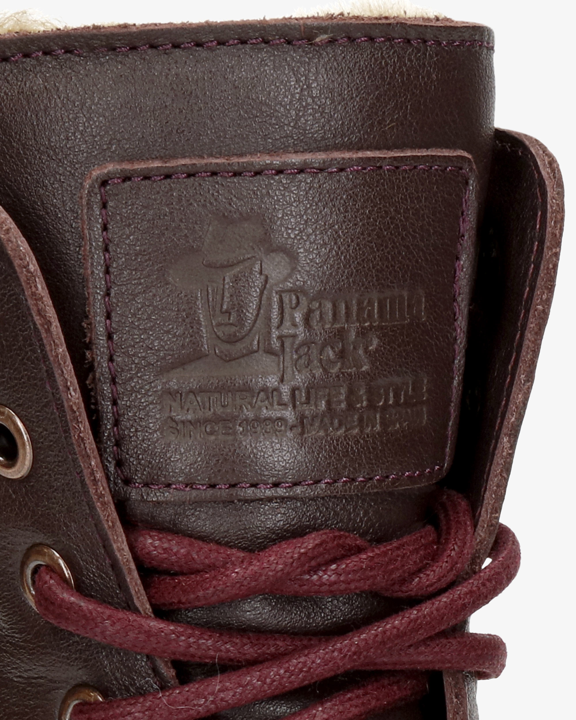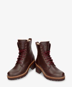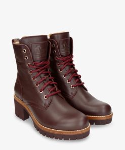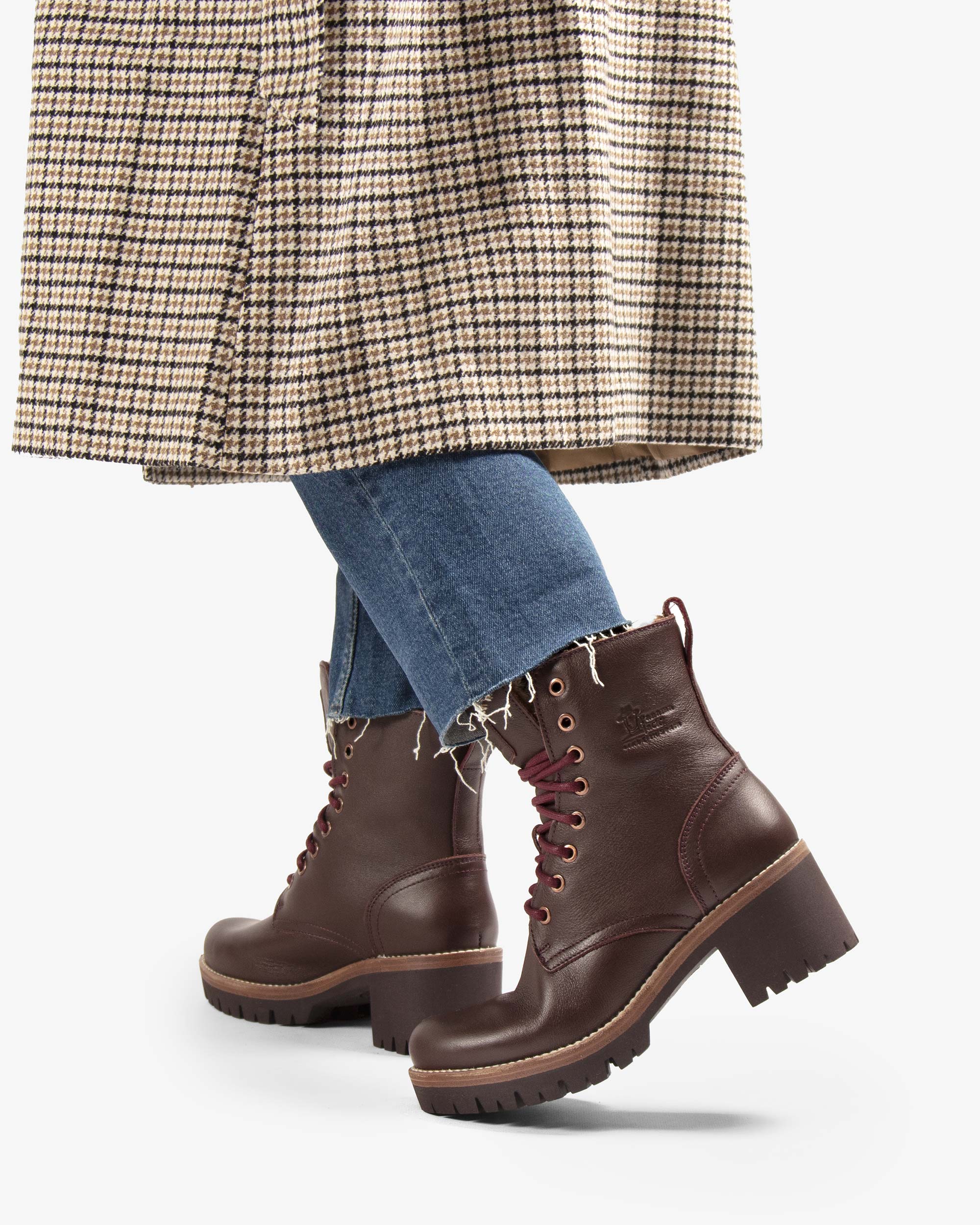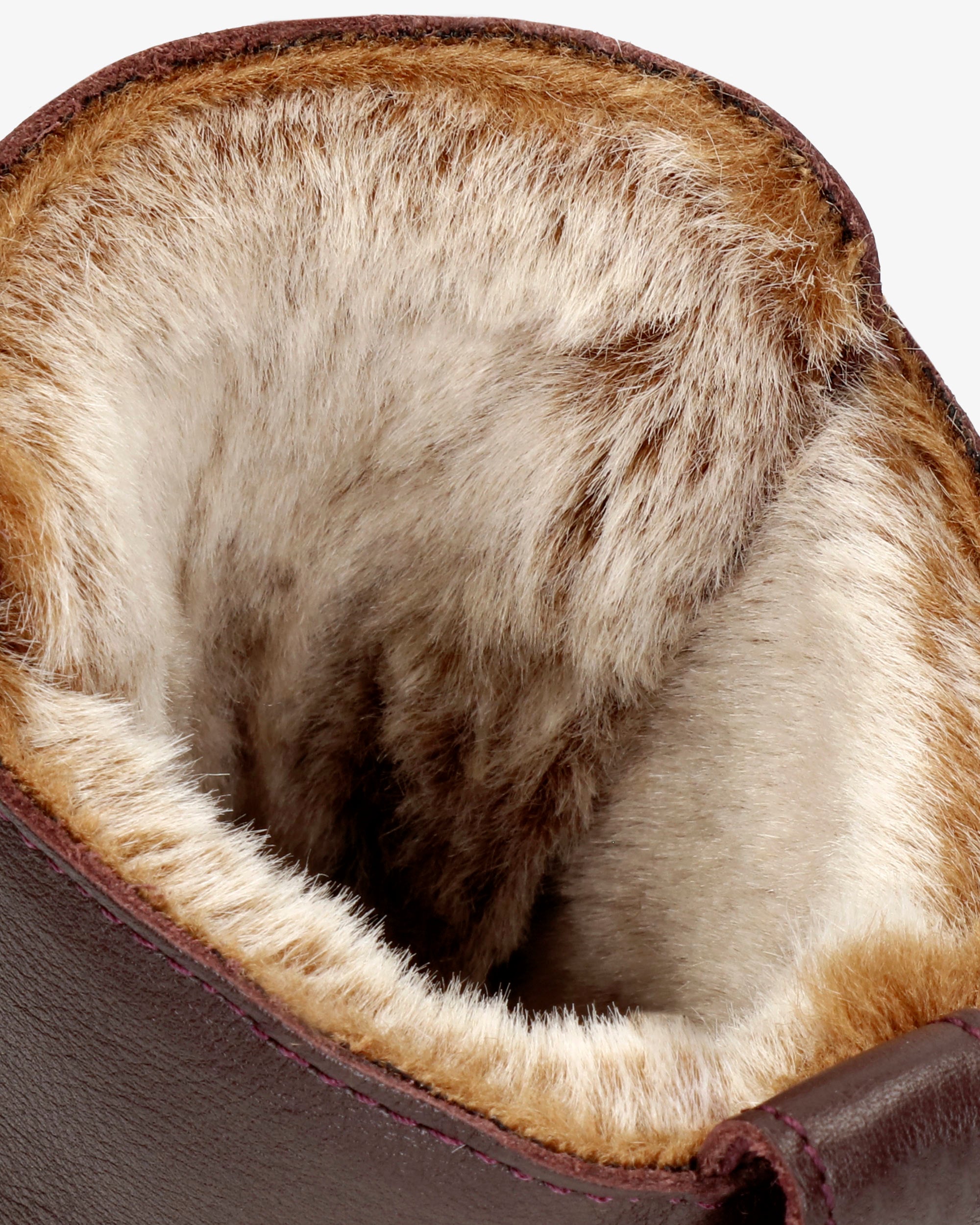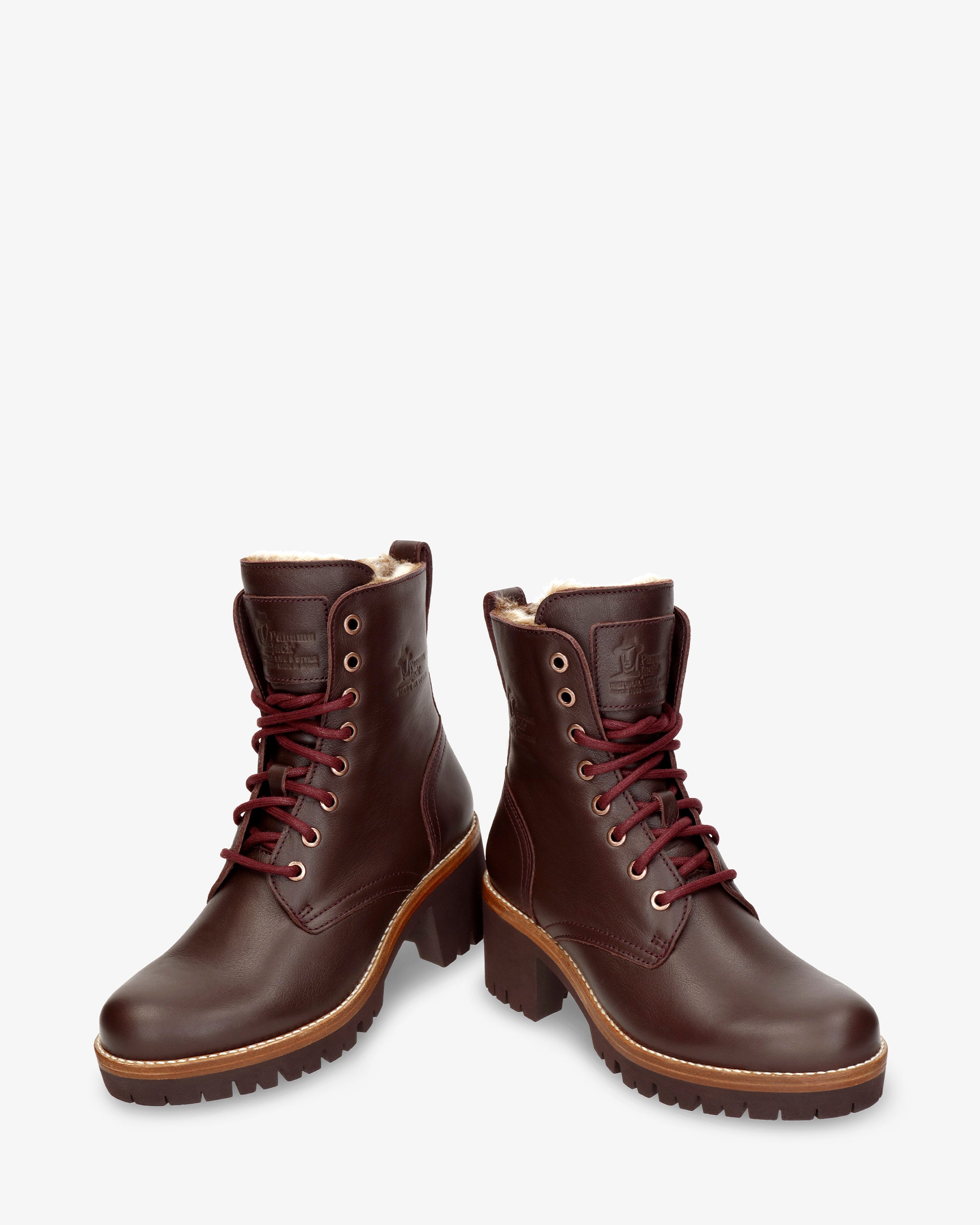 Bota de mujer con tacón. Piel Napa Burdeos WATERPROOF. Cierre de cordones. Forro interior de Pelo. Plantilla anatómica. Suela de TPU, flexible y resistente. Altura caña: 15 cm. Altura tacón: 7.5 cm. 100% Hecho en España.