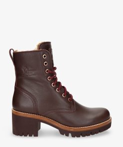 Bota de mujer con tacón. Piel Napa Burdeos WATERPROOF. Cierre de cordones. Forro interior de Pelo. Plantilla anatómica. Suela de TPU, flexible y resistente. Altura caña: 15 cm. Altura tacón: 7.5 cm. 100% Hecho en España.