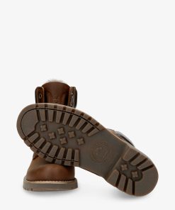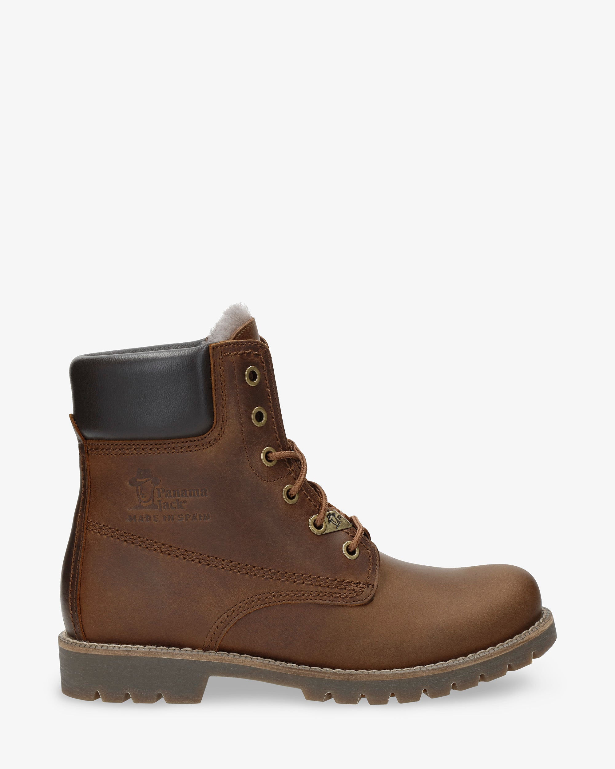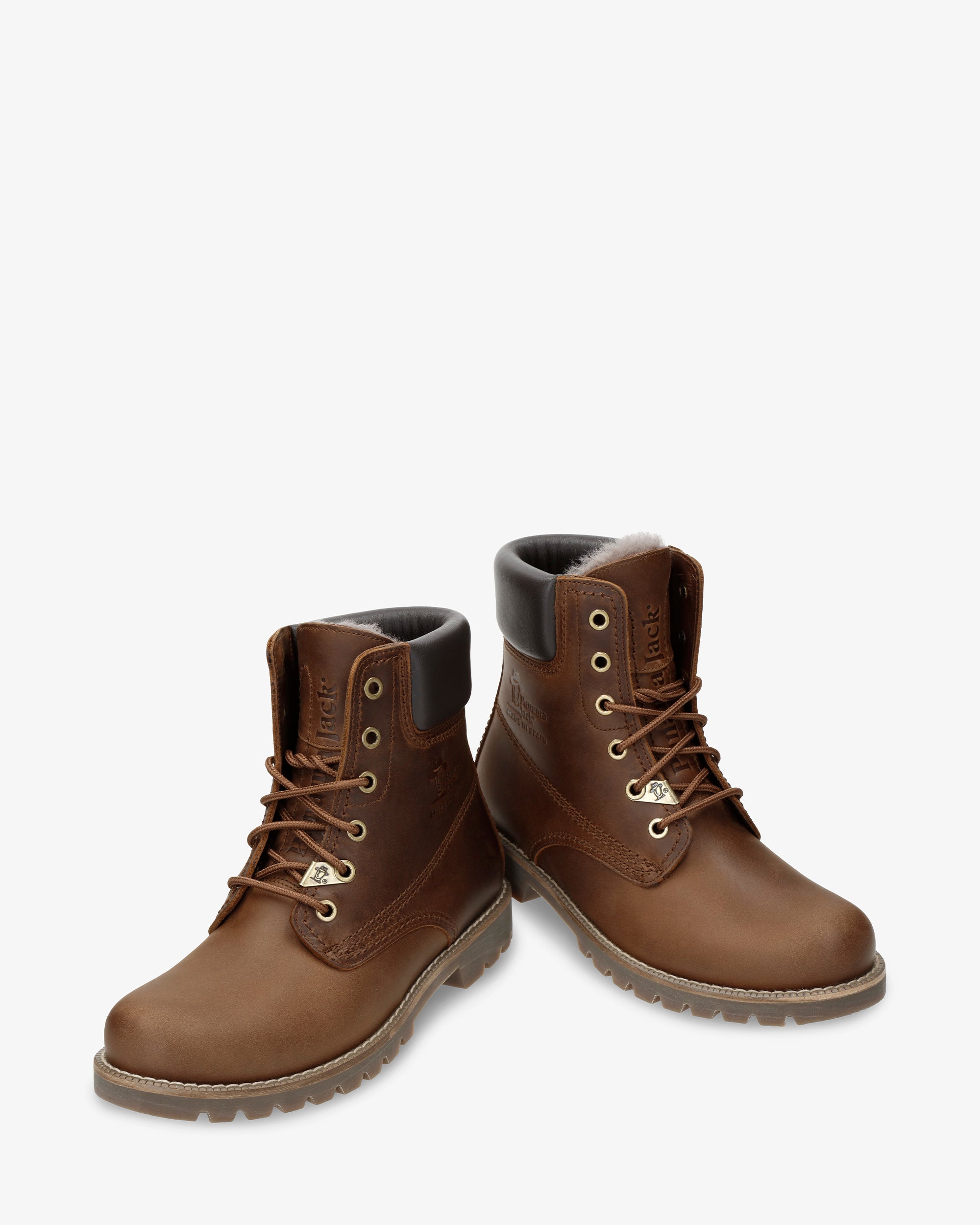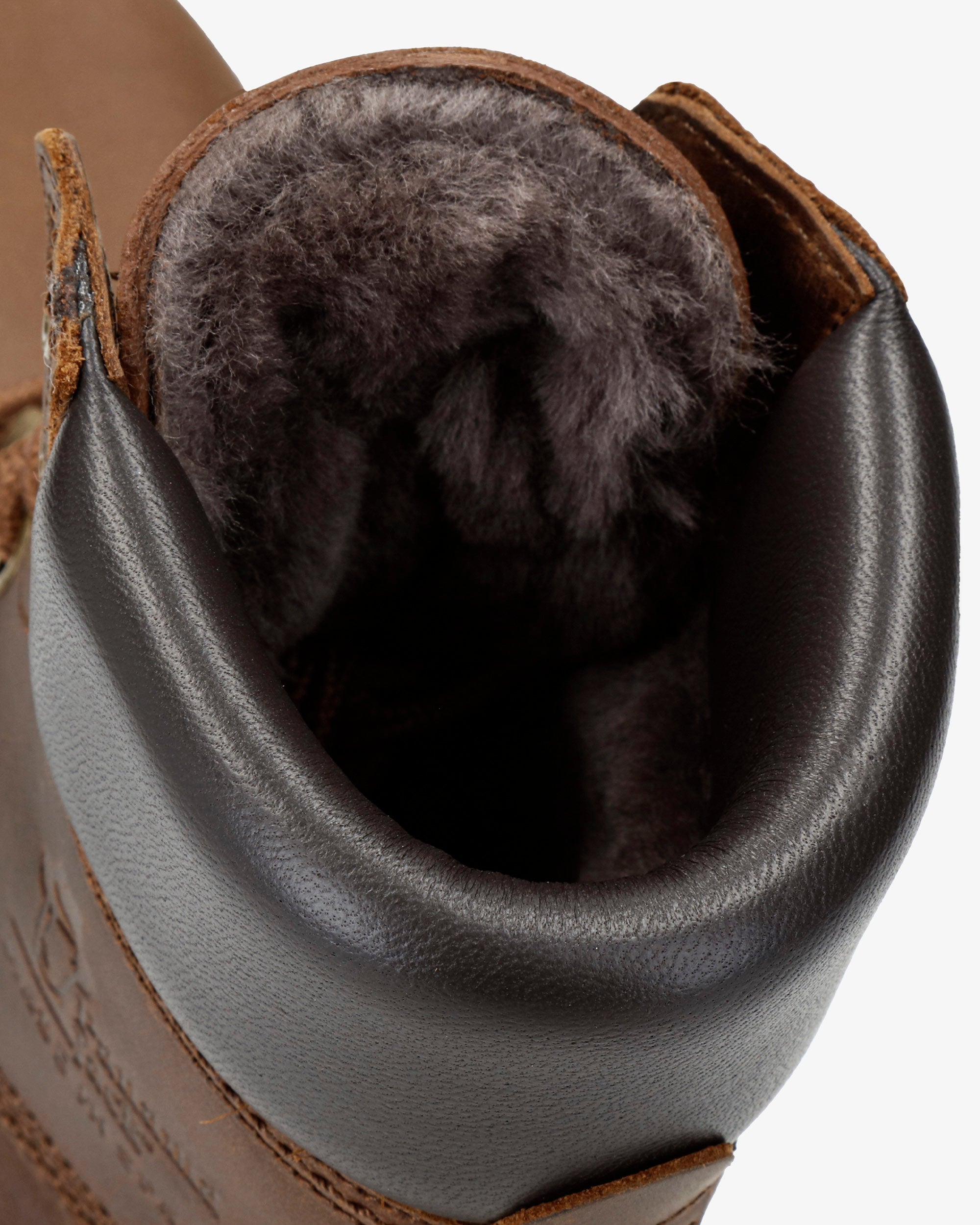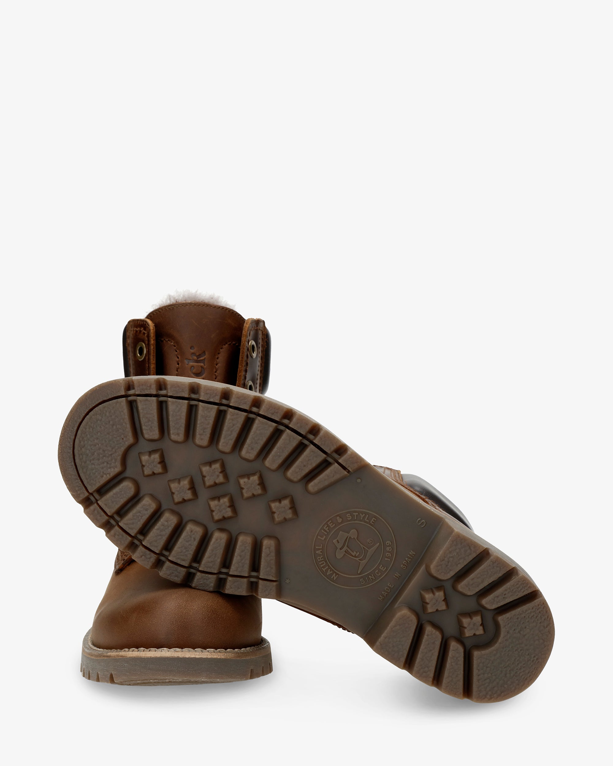 Bota de mujer plana. Piel Napa Grass Cuero WATERPROOF. Cierre de cordones. Forro interior de Pelo natural. Plantilla anatómica extraíble. Suela de caucho natural, flexible y resistente. Altura caña: 14 cm. Altura tacón: 4 cm. 100% Hecho en España.