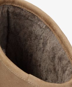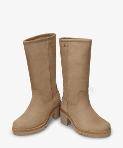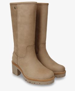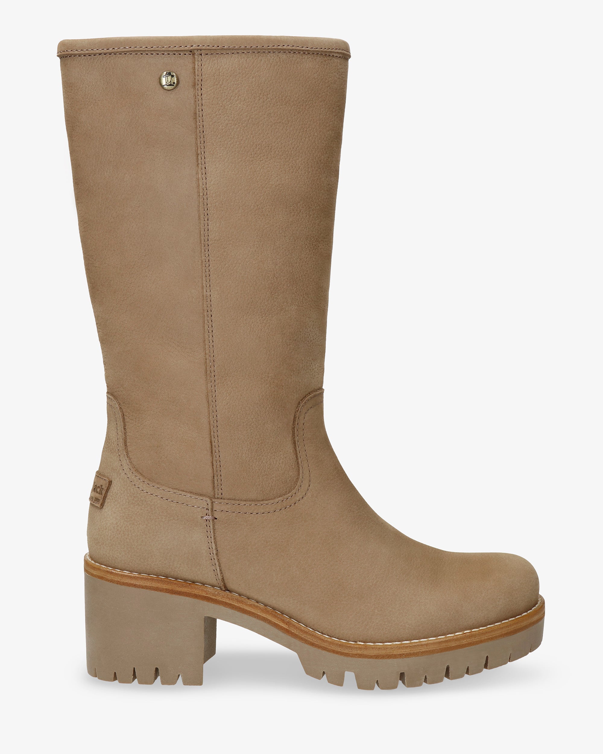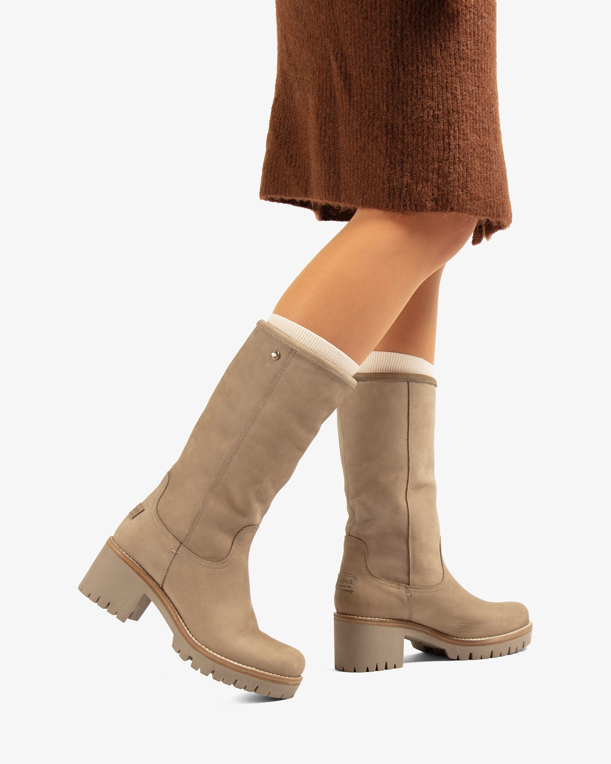 Bota de mujer con tacón. Piel Nobuck Taupe WATERPROOF. Forro interior de Pelo natural. Plantilla anatómica. Suela de TPU, flexible y resistente. Altura caña: 30 cm. Altura tacón: 7.5 cm. 100% Hecho en España.