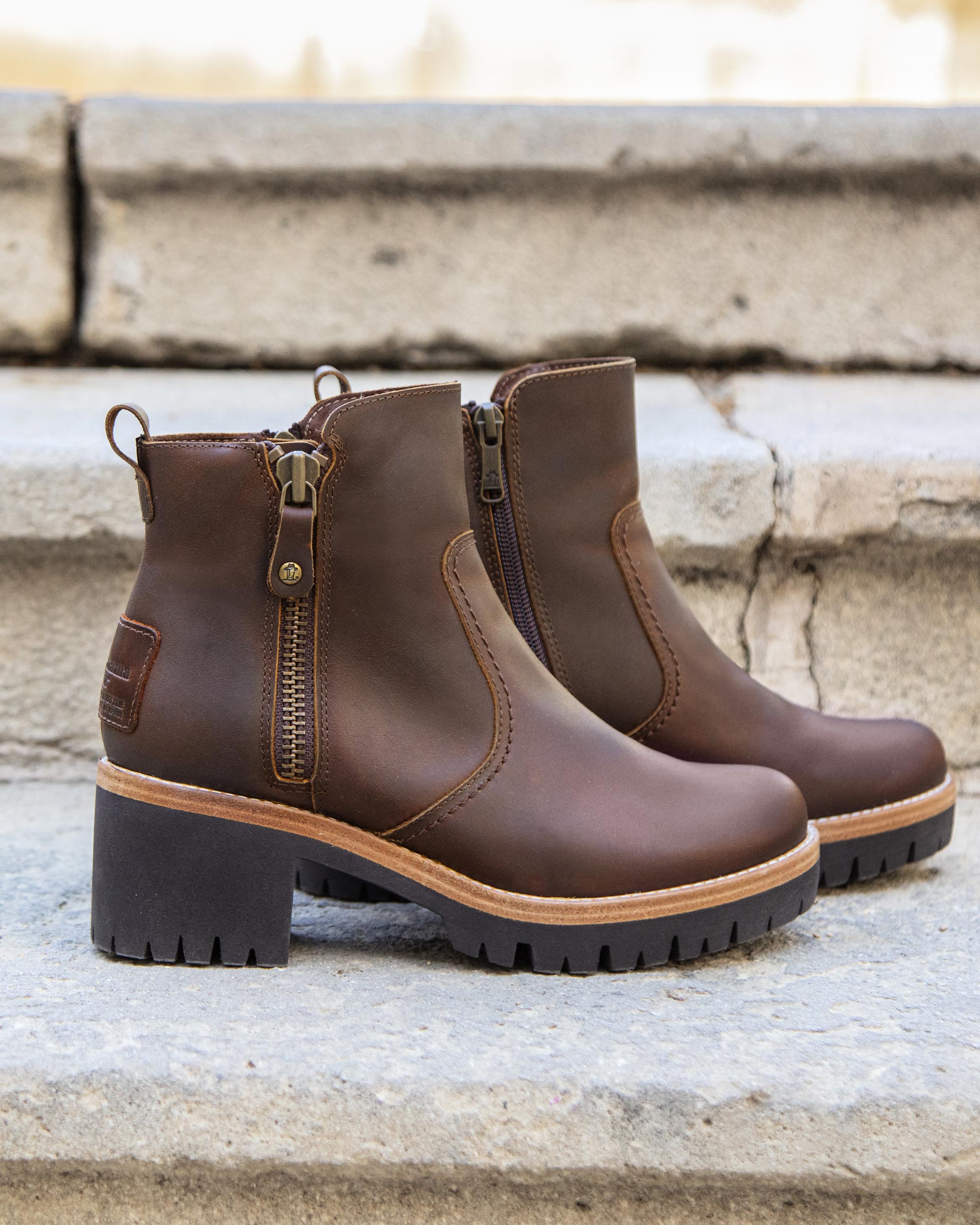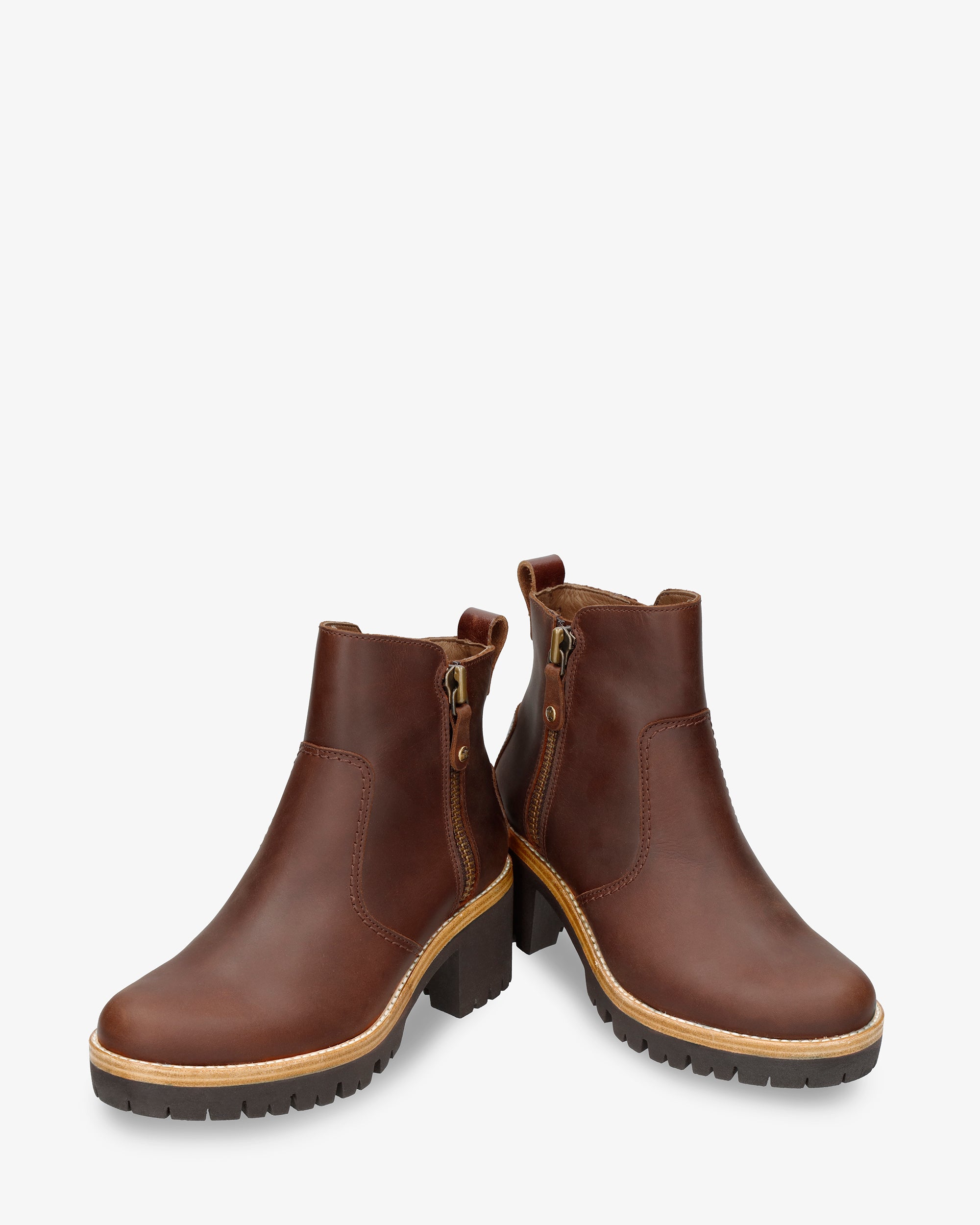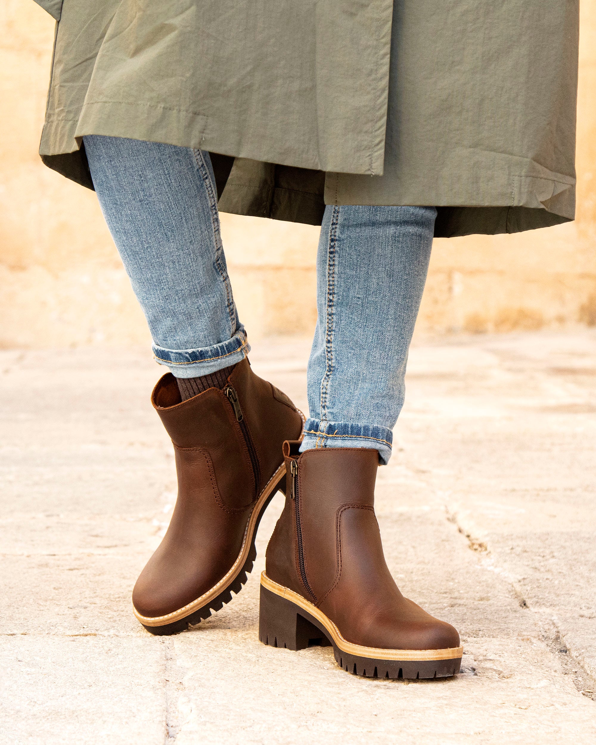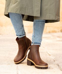 Botín de mujer con tacón. Piel Napa Cuero WATERPROOF. Cierre de cremallera. Forro interior de Piel. Plantilla anatómica extraíble. Suela de TPU, flexible y resistente. Altura caña: 11,5 cm. Altura tacón: 7.5 cm. 100% Hecho en España.