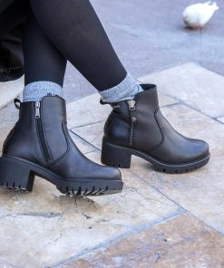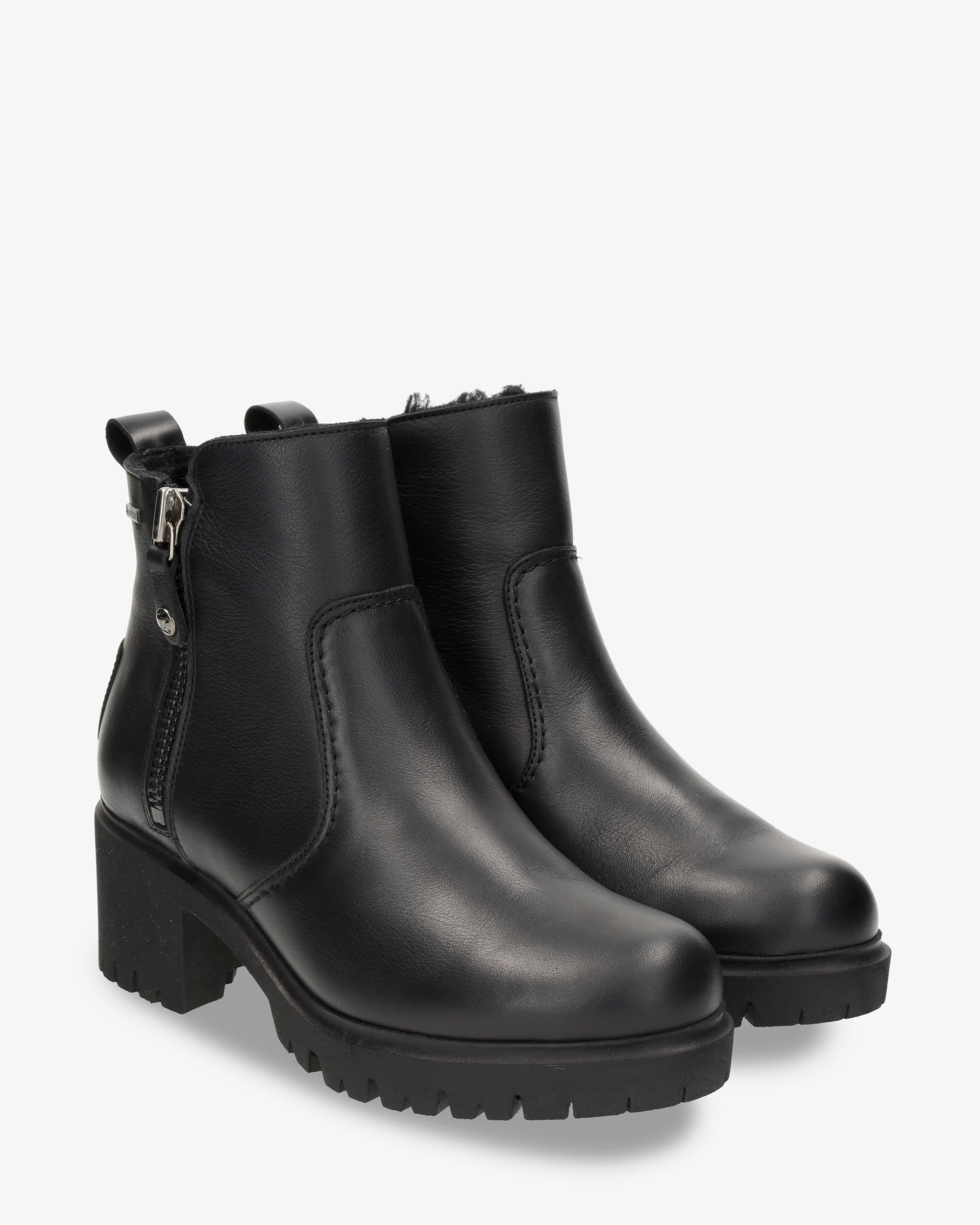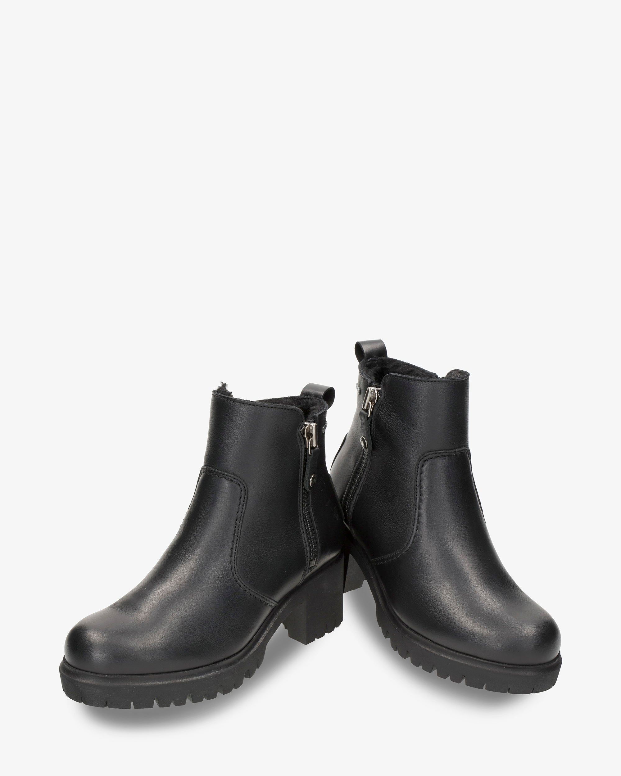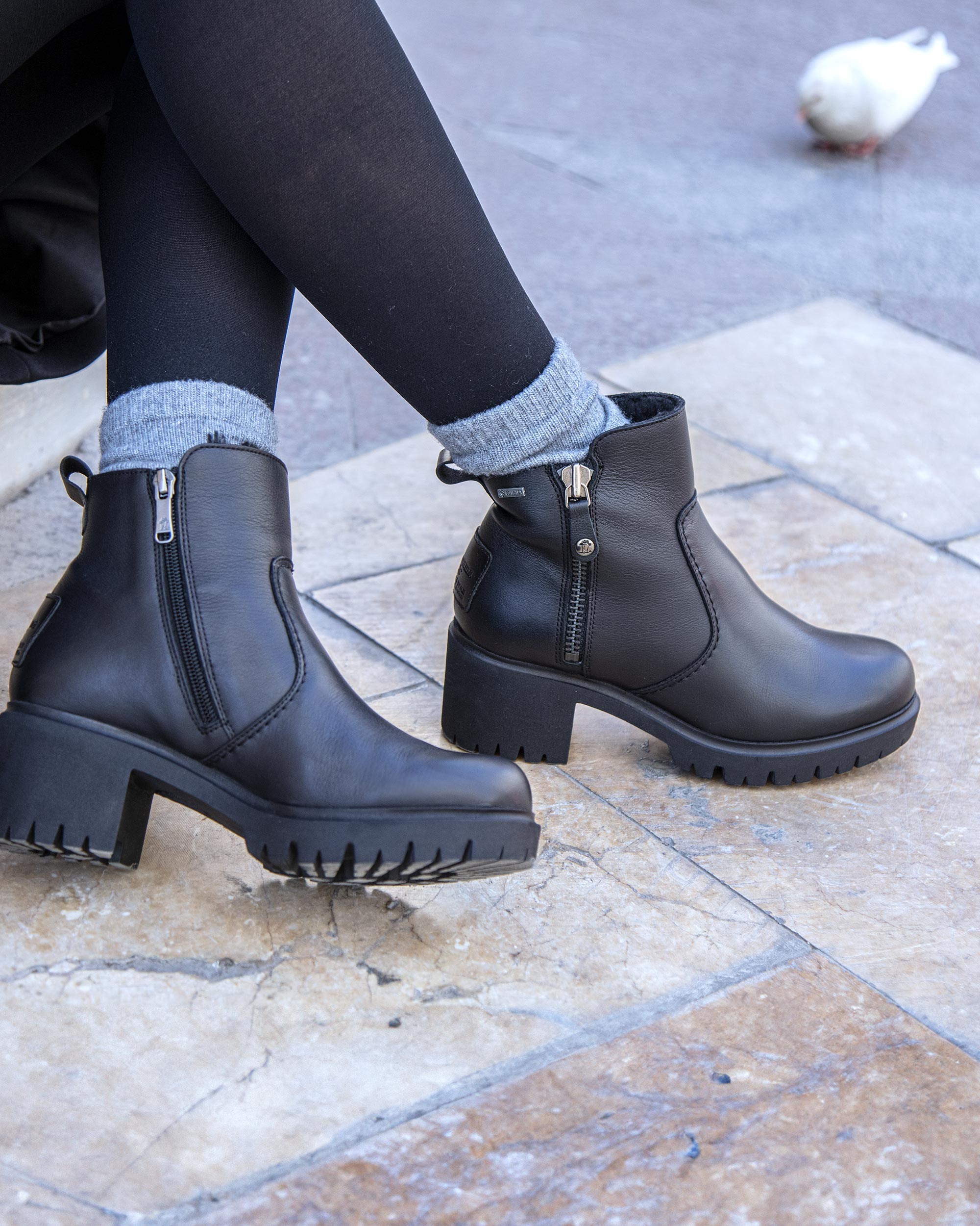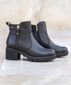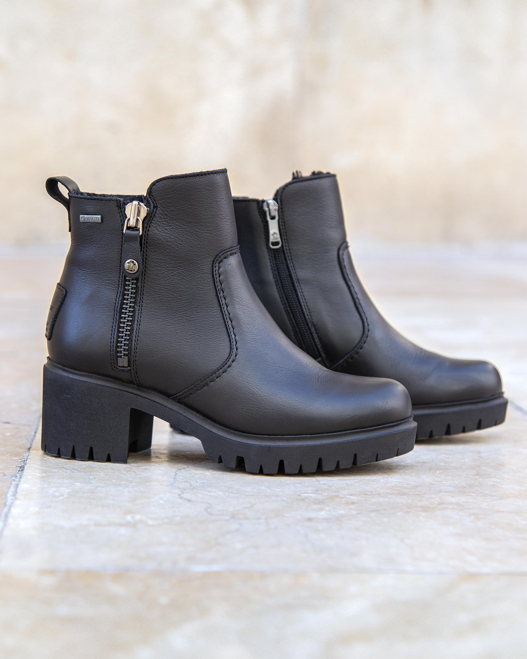 Botín de mujer con tacón. Piel Napa Negro WATERPROOF. Cierre de cremallera. Forro interior de Lana y Gore-Tex®. Plantilla anatómica extraíble. Suela de TPU, flexible y resistente. Altura caña: 11,5 cm. Altura tacón: 7.5 cm. 100% Hecho en España.