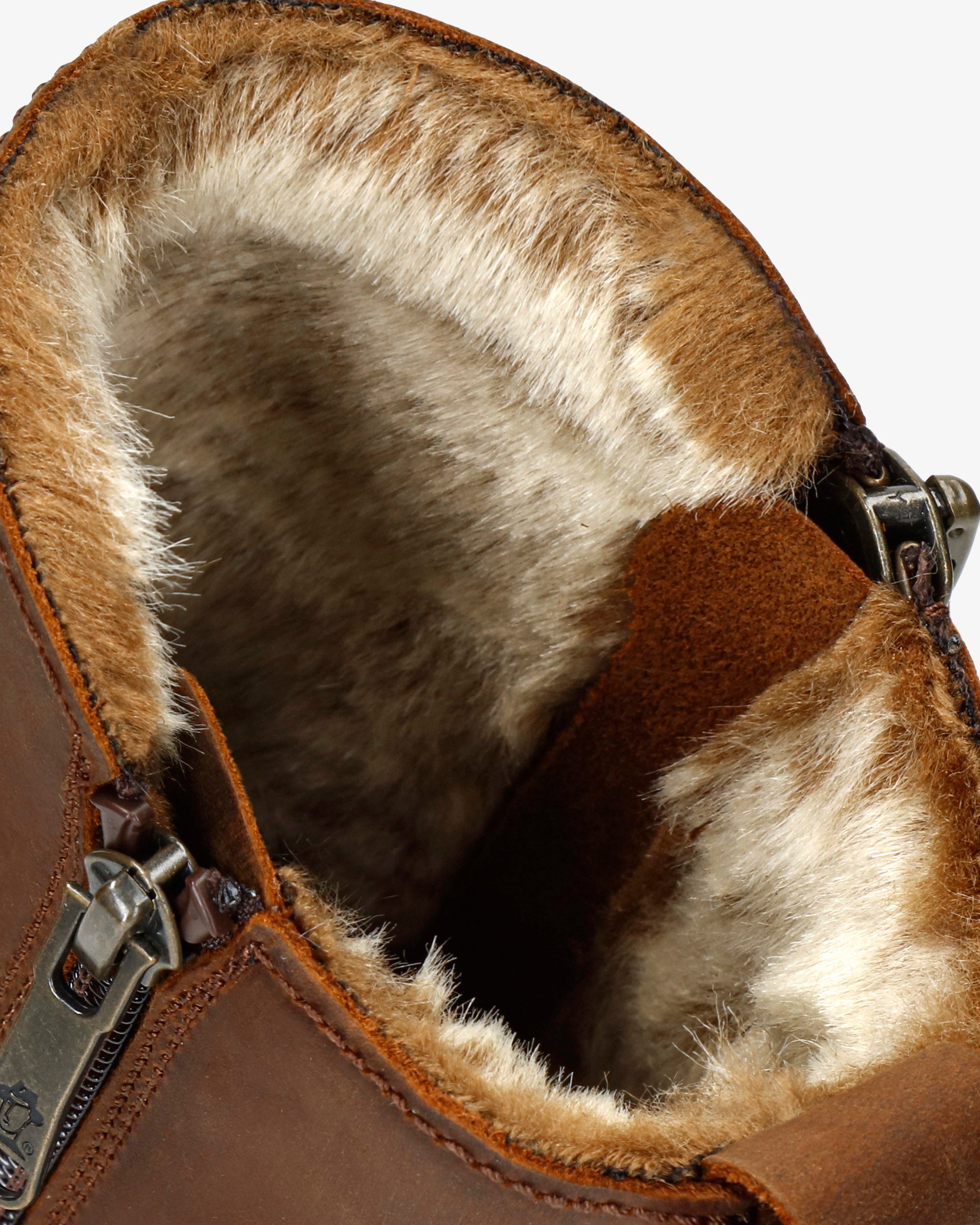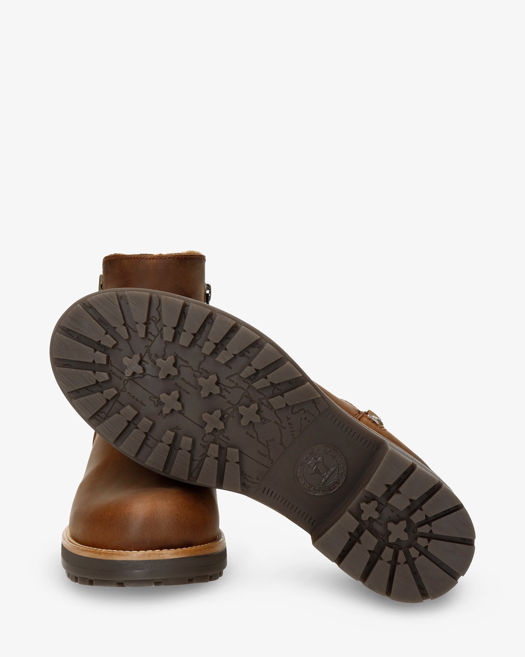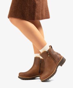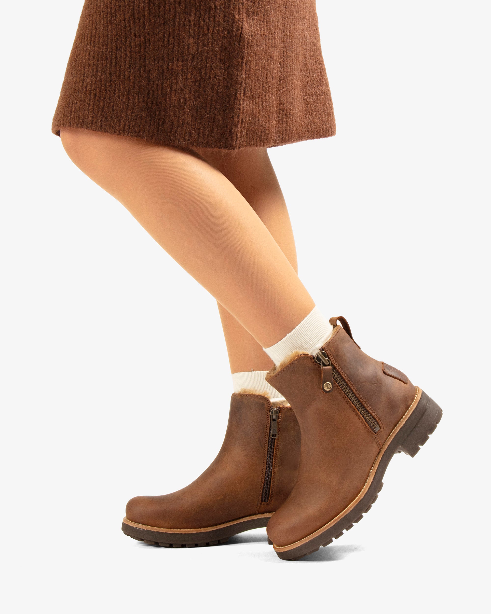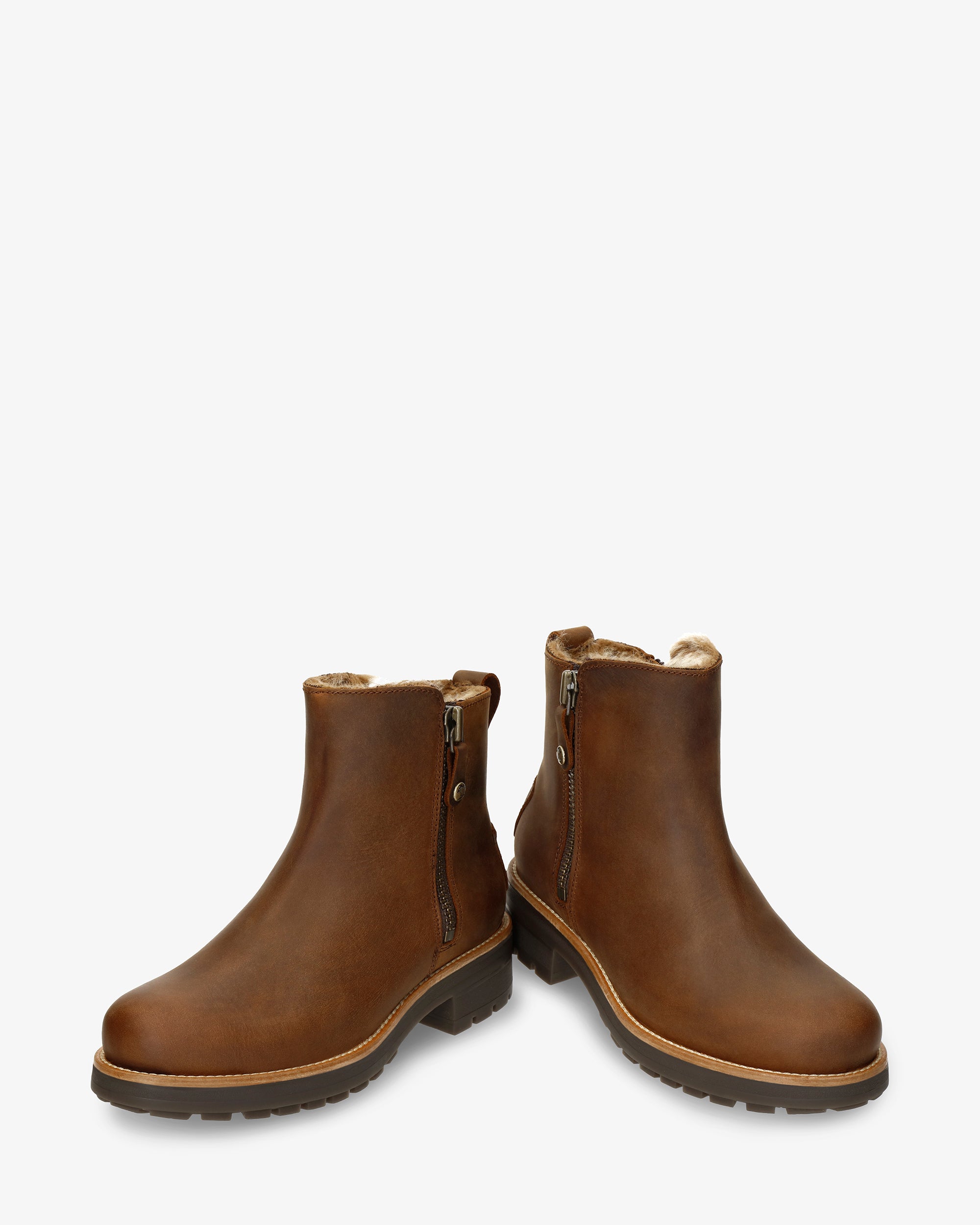 Bota de mujer plana. Piel Napa Cuero WATERPROOF. Cierre de cremallera. Forro interior de Pelo. Plantilla anatómica extraíble. Suela de TPU, flexible y resistente. Altura caña: 12 cm. Altura tacón: 4 cm. 100% Hecho en España.