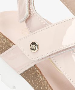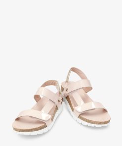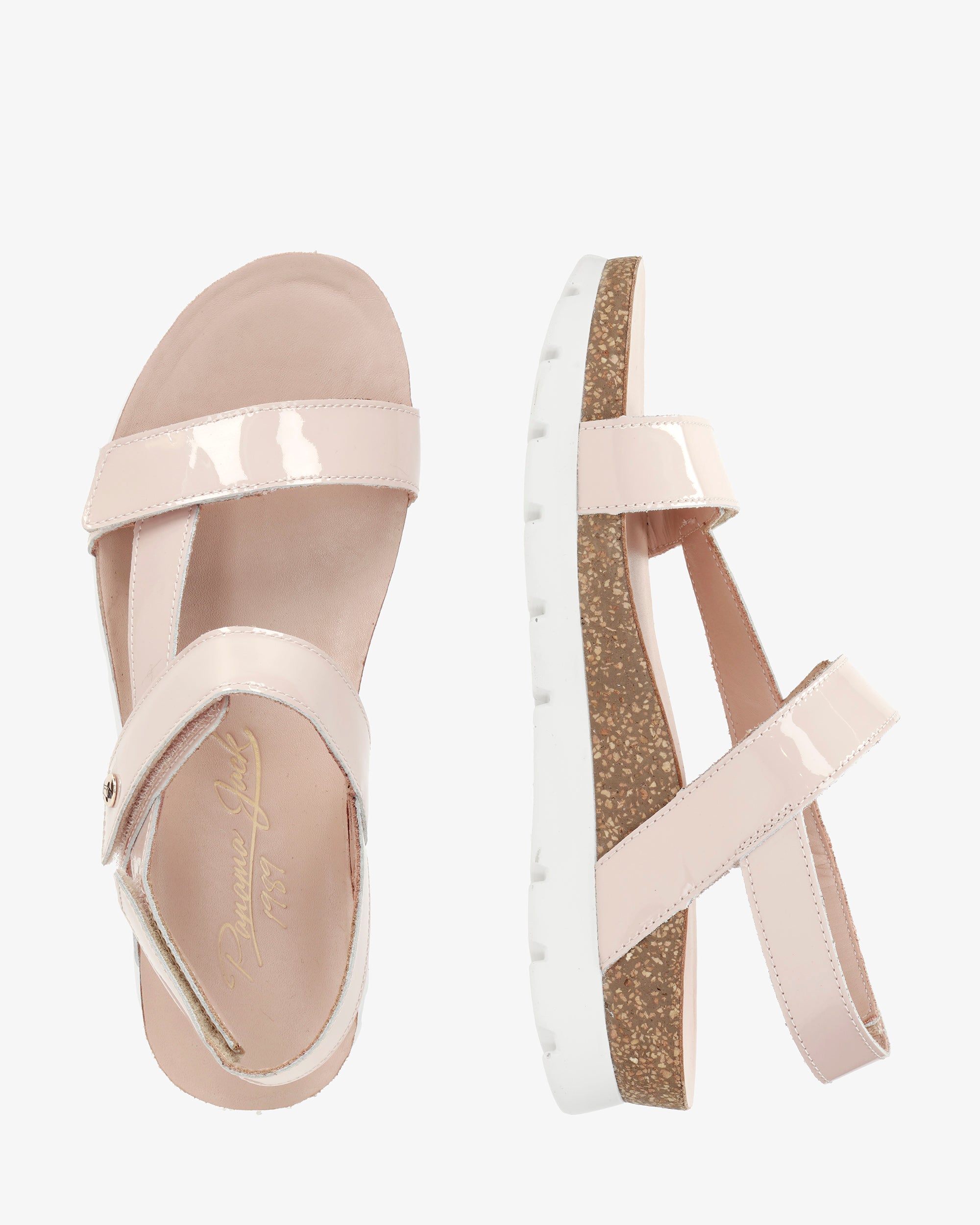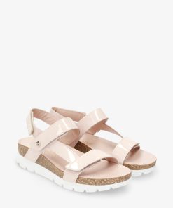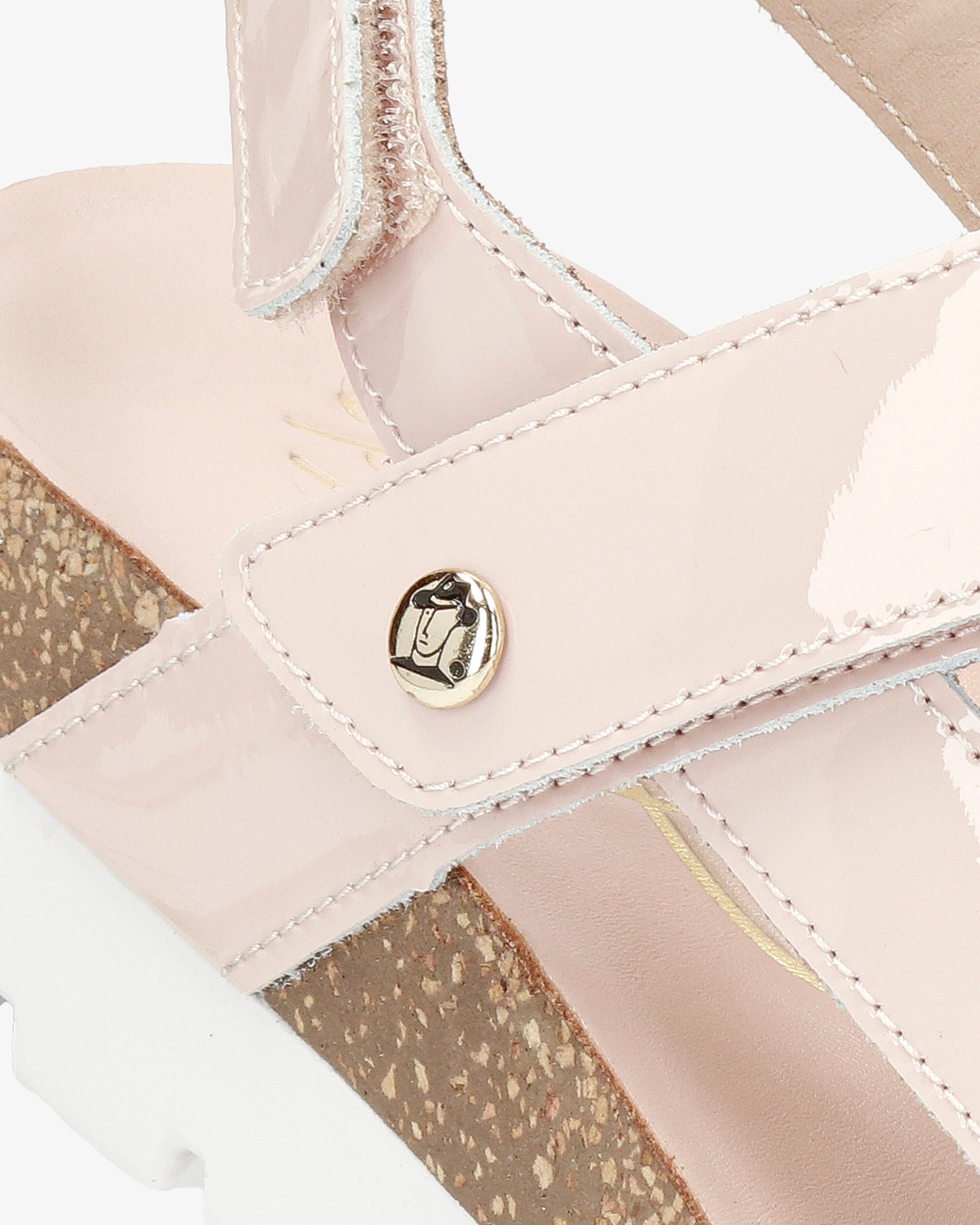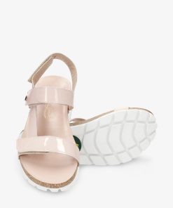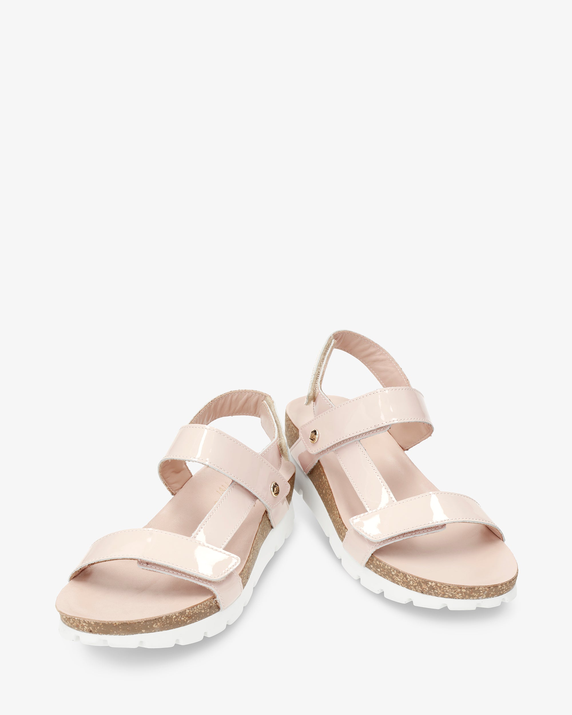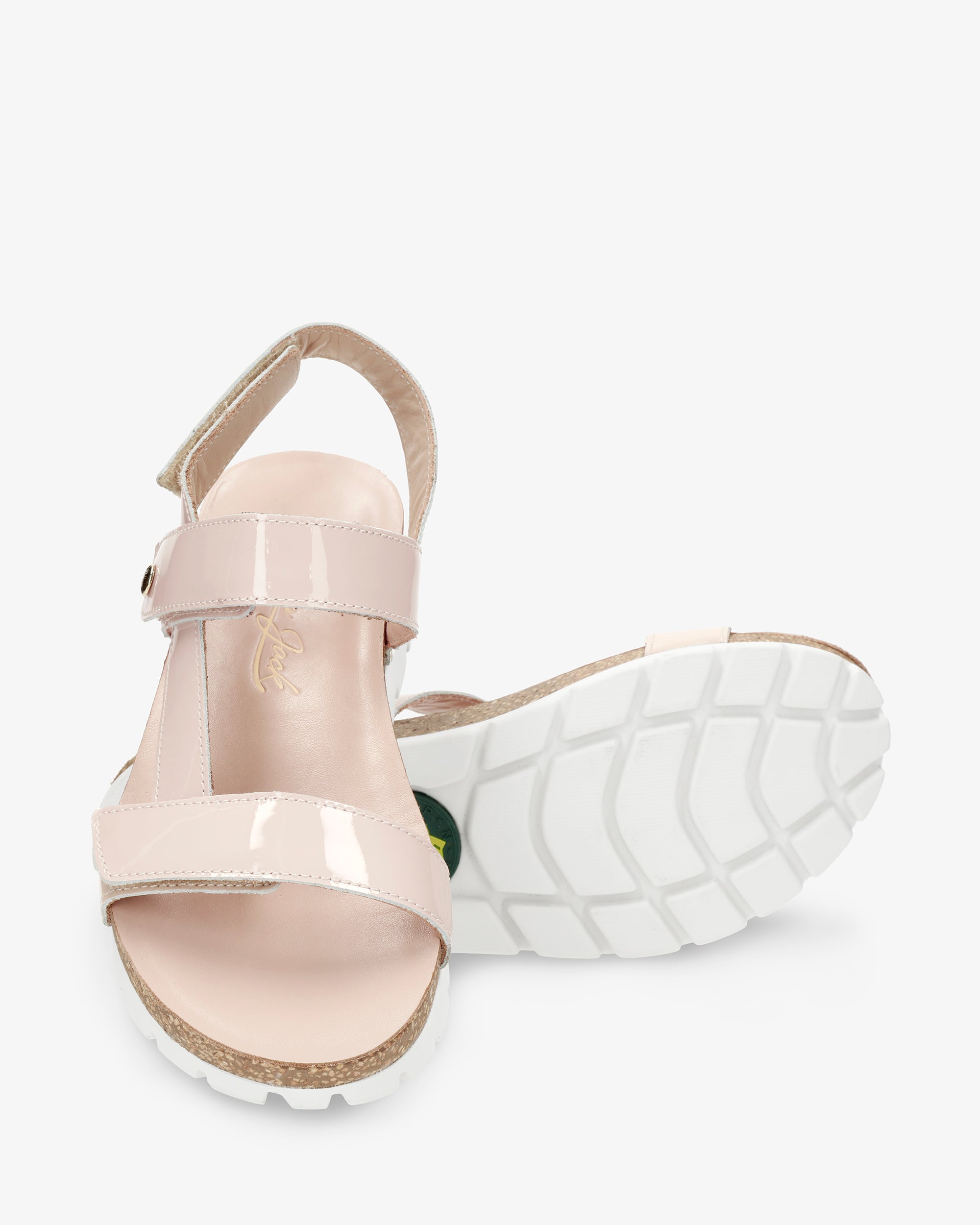 Sandalia de mujer plana. Piel Charol Rosa. Cierre de velcro. Forro interior de Piel. Plantilla anatómica. Suela de corcho y poliuretano, flexible y resistente. Altura tacón: 4.5 cm. 100% Hecho en España.
