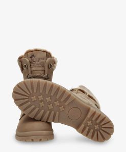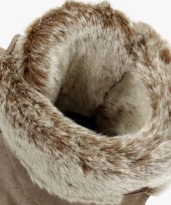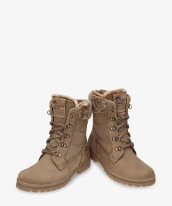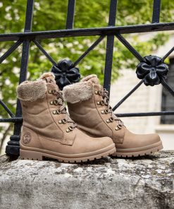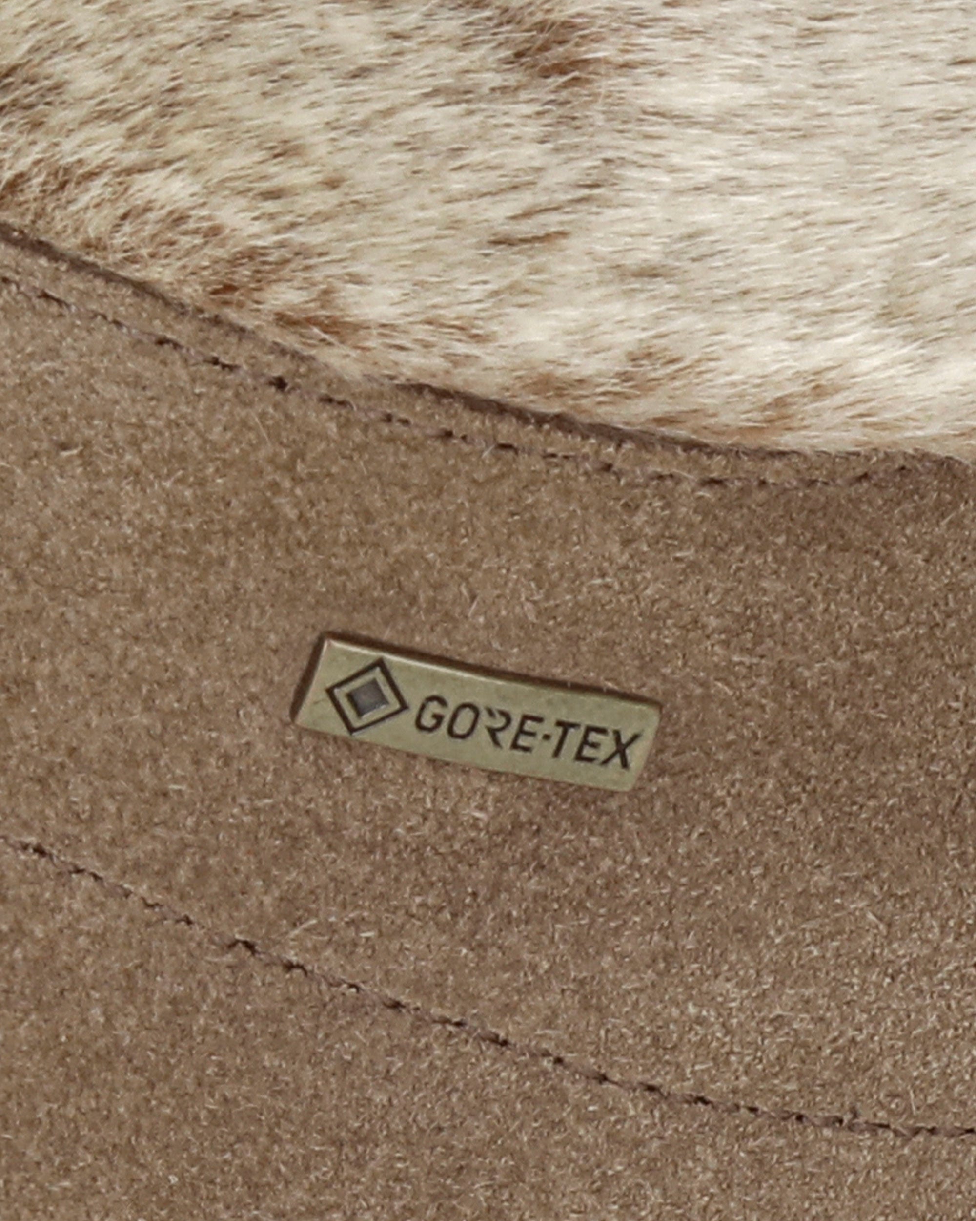 Bota de mujer plana. Piel Nobuck Taupe WATERPROOF. Cierre de cordones. Forro interior de Lana y Gore-Tex®. Plantilla anatómica extraíble. Suela de caucho natural, flexible y resistente. Altura caña: 17 cm. Altura tacón: 3.5 cm. 100% Hecho en España.